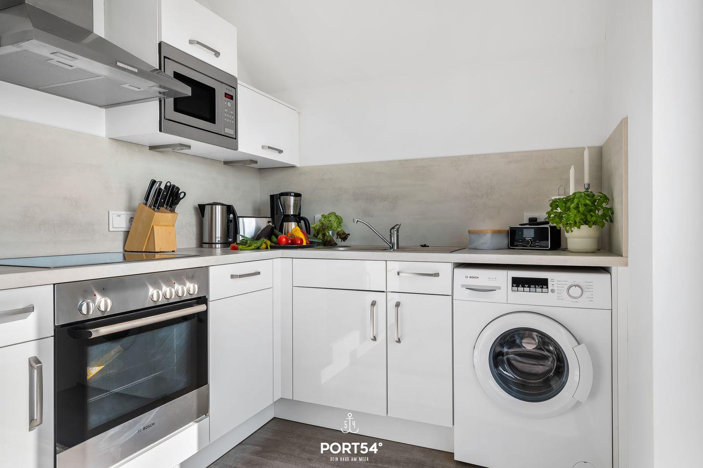 Die moderne, offene Küche ist vollständig ausgestattet. Neben einem Ceranherd und einem Backofen stehen Dir unter anderem eine Spülmaschine, eine Mikrowelle, ein Toaster sowie eine Espresso- und eine Kaffeemaschine zur Verfügung. Küchenutensilien, Geschirr und Besteck sind ebenfalls vorhanden, sodass der Zubereitung jeglicher Mahlzeiten nichts im Wege steht.