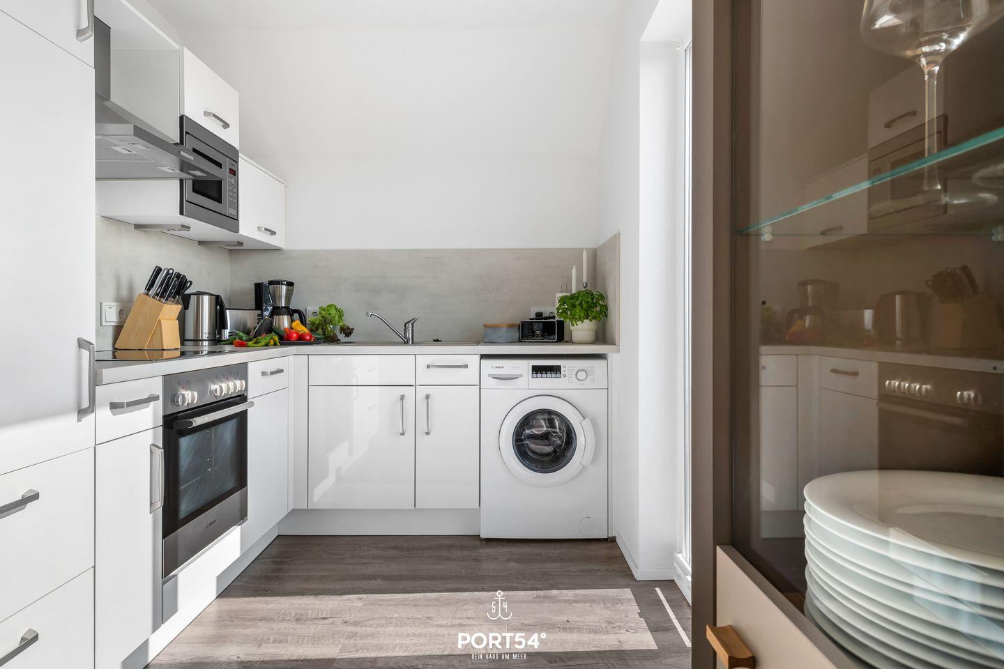 Die moderne Küche ist vollständig ausgestattet mit Cerankochfeld, Backofen, Mikrowelle, Spülmaschine sowie Kaffeemaschine und Nespresso-Espressomaschine.