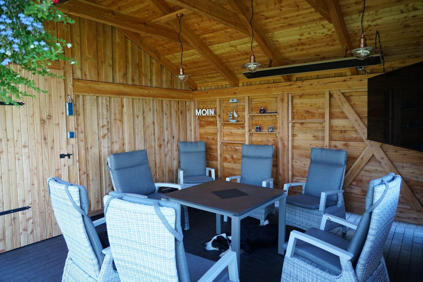 Die großzügige, möblierte Terrasse mit Gartenbereich und tollem Ausblick auf die Schlei ist ein weiteres Highlight der Ferienwohnung. Ein Elektrogrill steht ebenfalls zu Deiner Verfügung. Von hier genießt Du einen modernen Rückzugsort mit Blick in die grüne Umgebung und auf das nahe Wasser.
