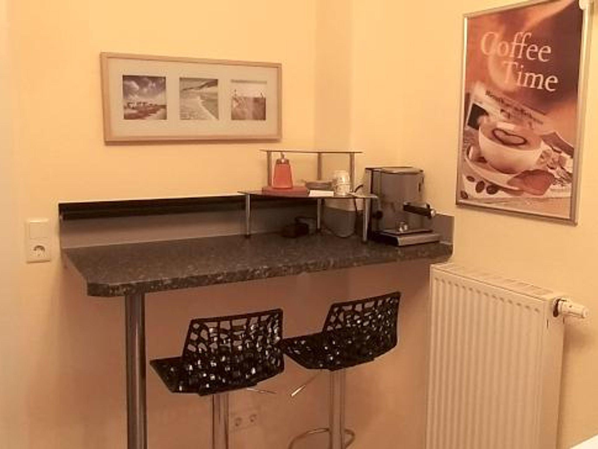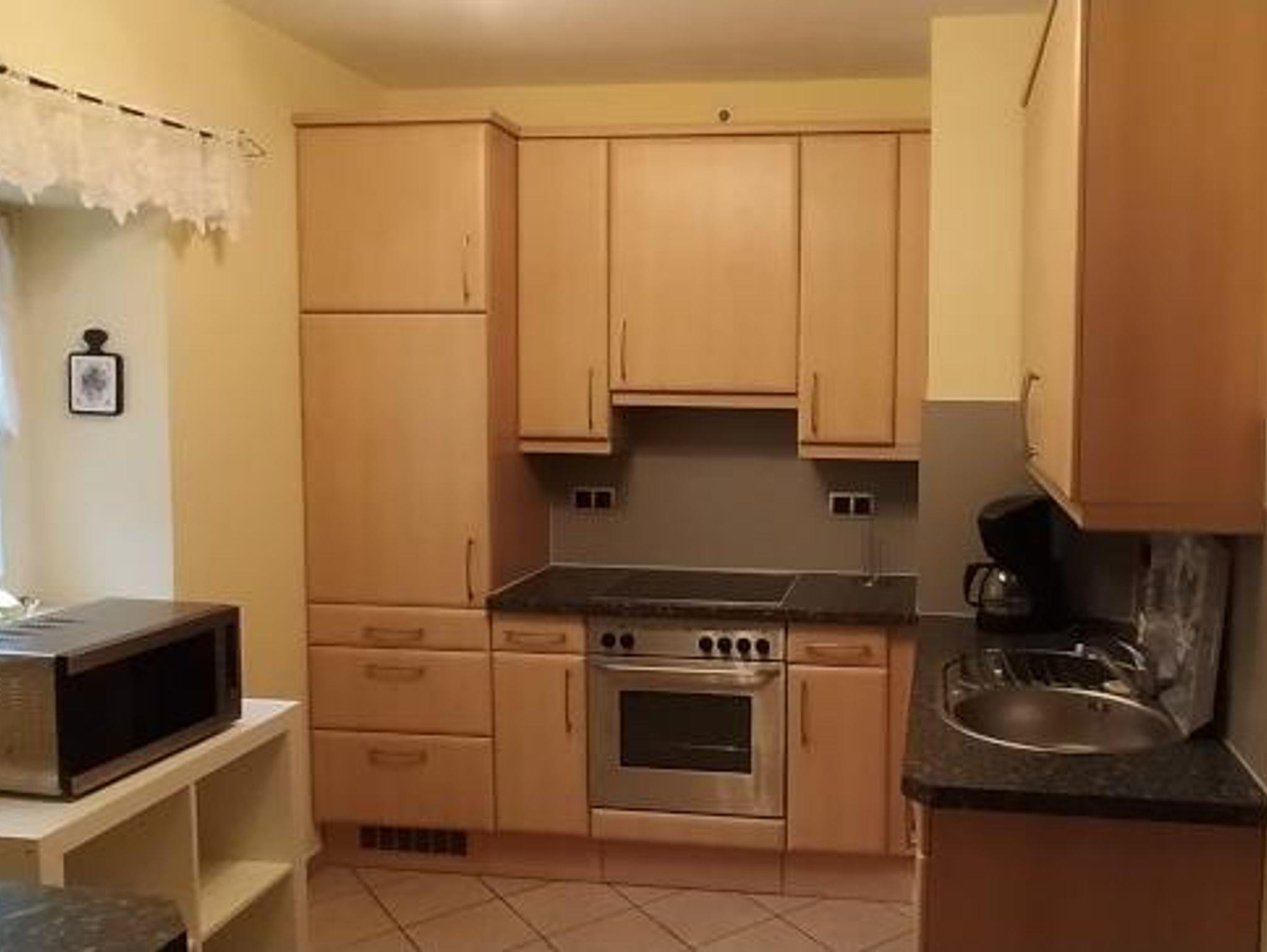 Die Einbauküche ist voll ausgestattet und verfügt über Kaffeemaschine, Mikrowelle und Backofen.