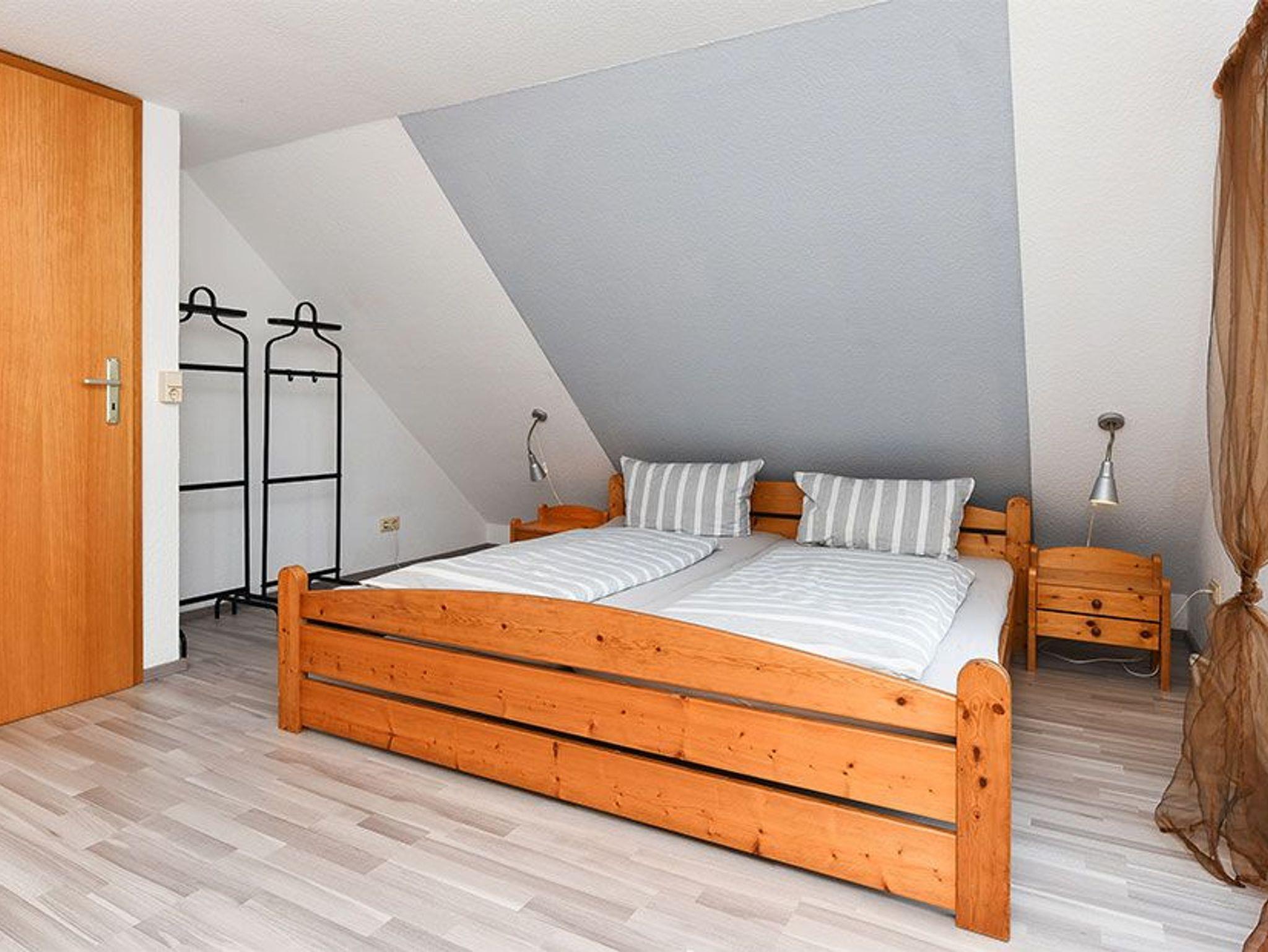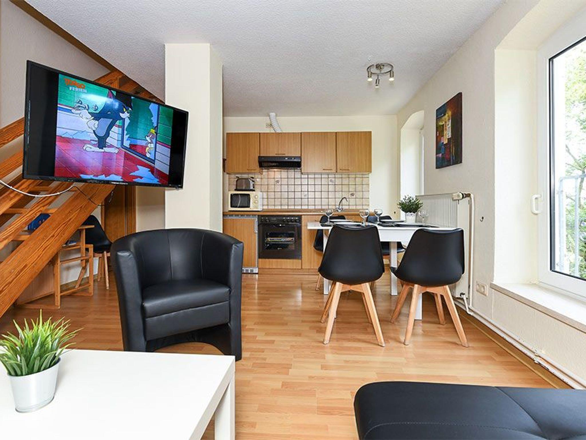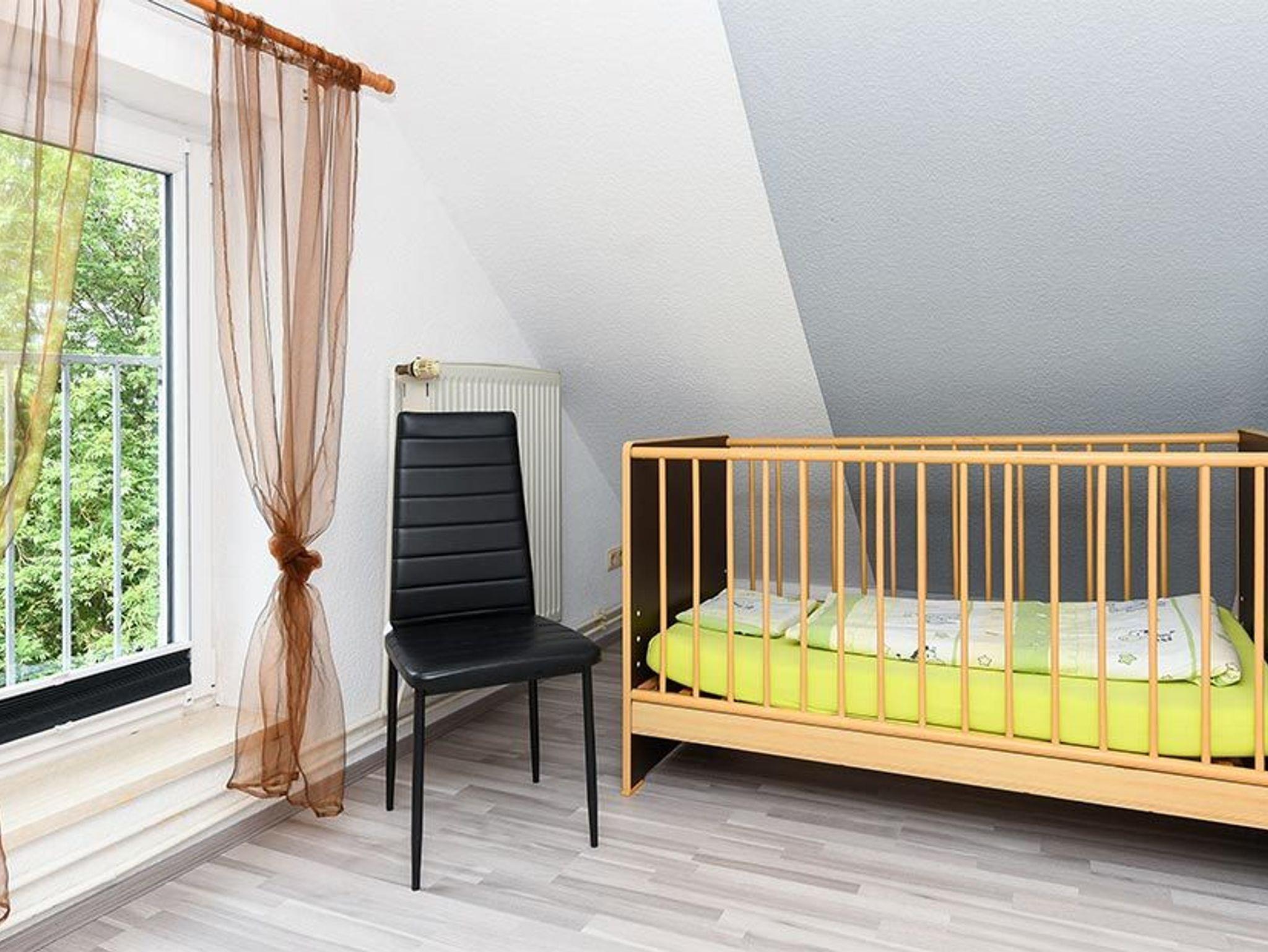 Größe ca. 65 Quadratmeter, Wohnraum mit integrierter Küche, Schlafzimmer, zweites separates, Schlafzimmer/Kinderzimmer, Badezimmer mit Dusche, Waschtisch und WC, Obergeschoss, Terrasse (Sitzgruppe im Garten), optimal für 2 bis 5 Personen und zusätzlich ein Kleinkind.