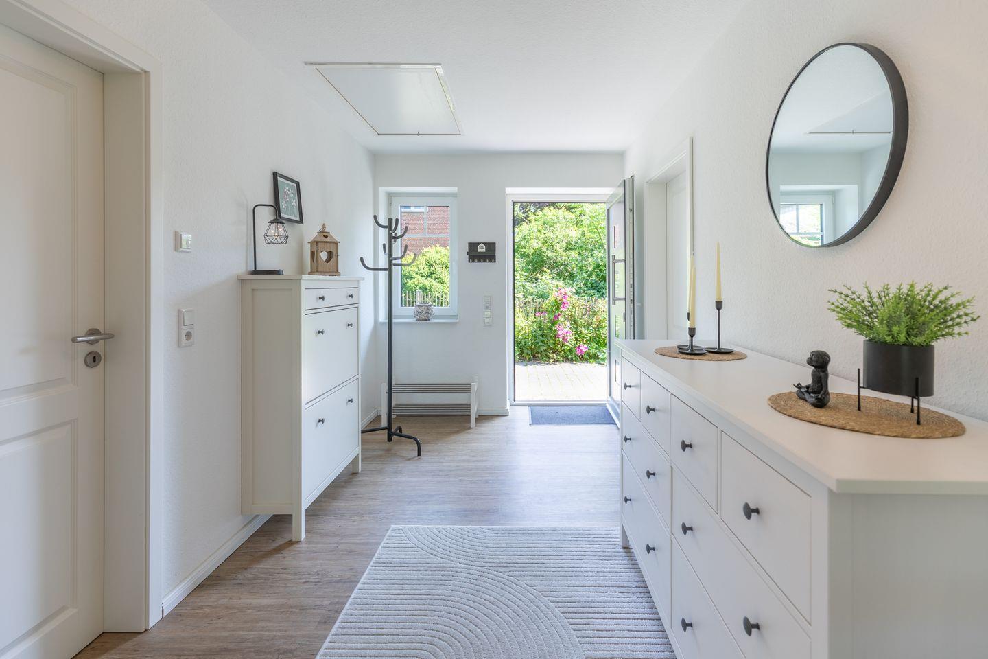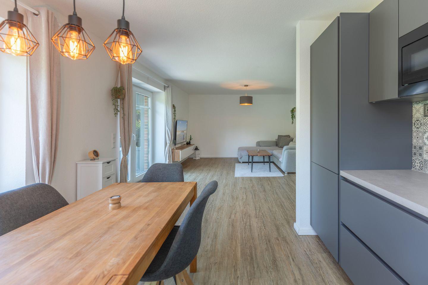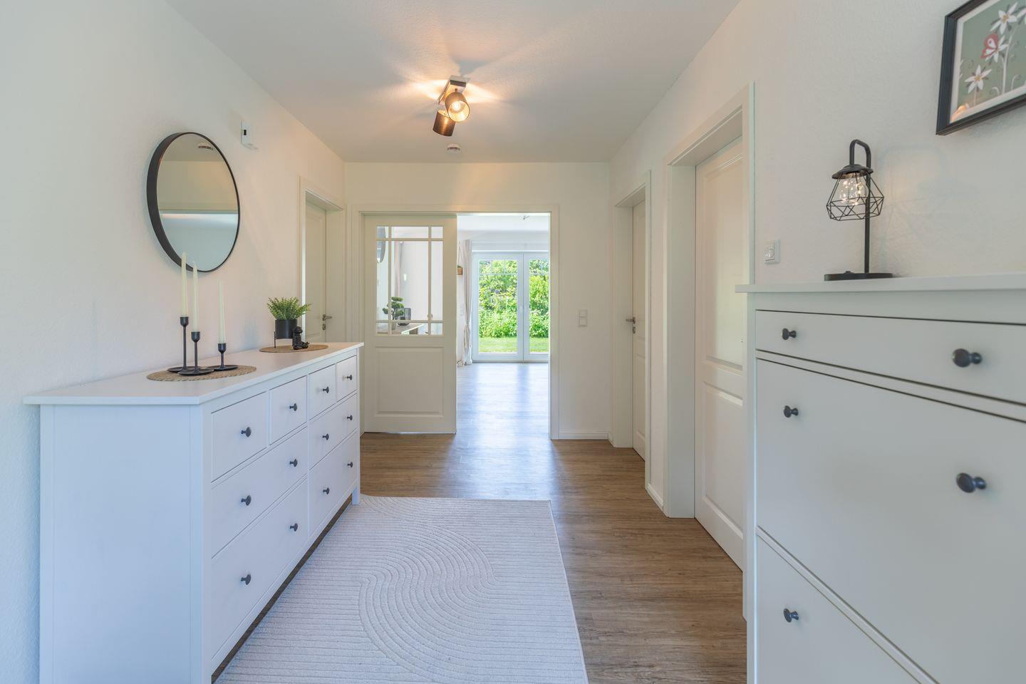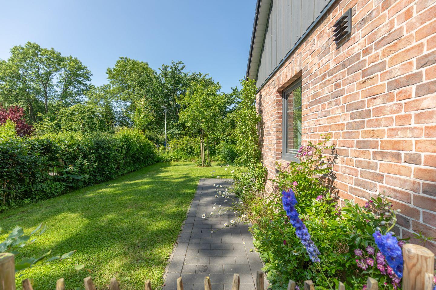 Modernes Ferienhaus Norderreihe in Ostenfeld mit Garten, Terrasse und Elektroauto-Ladestation für erholsame Ferien.