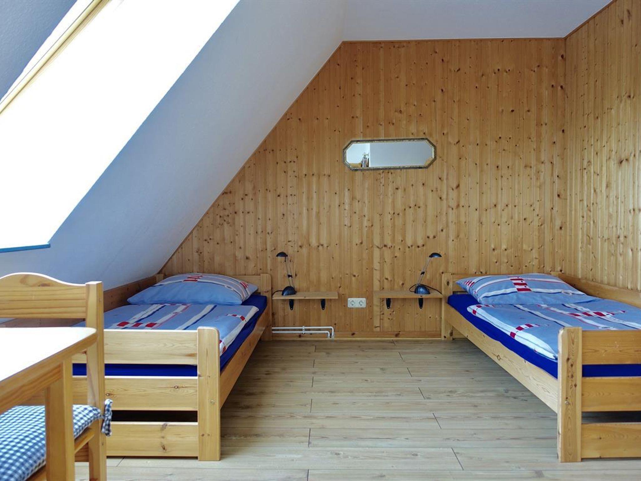 Im Erdgeschoss befindet sich eine komplett ausgestattete offene Wohnküche (Backofen, 4-Platten-Herd, Mikrowelle, Kaffeemaschine, Toaster, Geschirrspüler, Kühlschrank) mit Essbereich sowie die großzügige Sitzecke mit TV und Radio/CD-Player. Zudem finden Sie hier ein großes Tageslicht-Badezimmer mit Dusche und WC. Im Obergeschoss liegen die beiden Schlafräume (1 Doppelbett-Zimmer und ein Zimmer mit zwei Einzelbetten).
