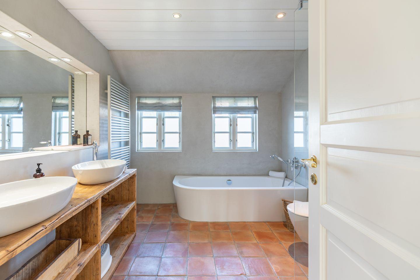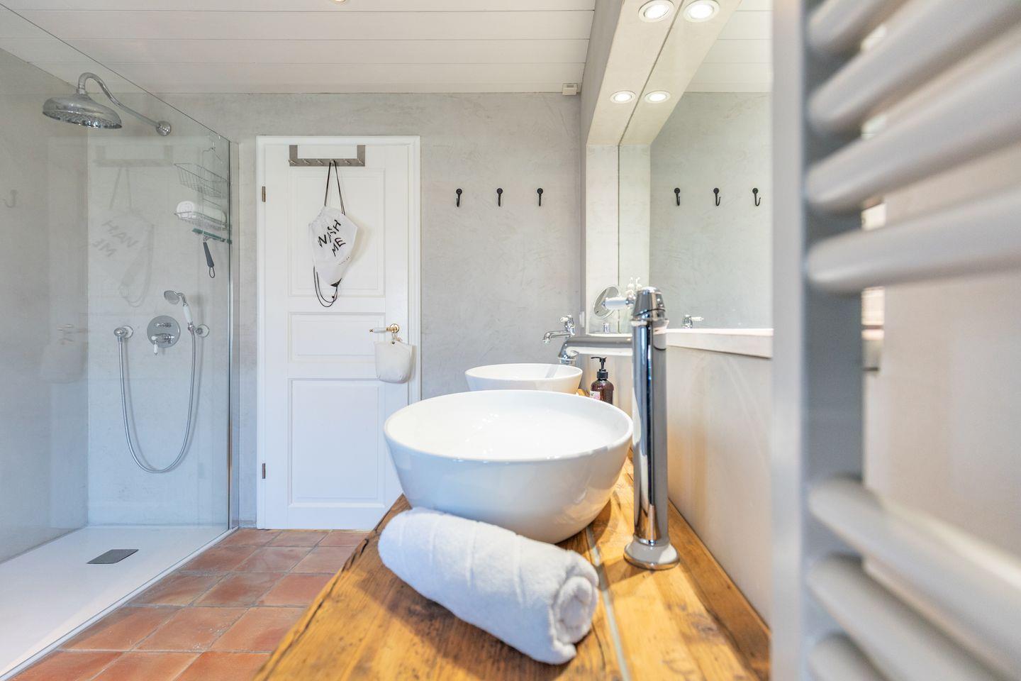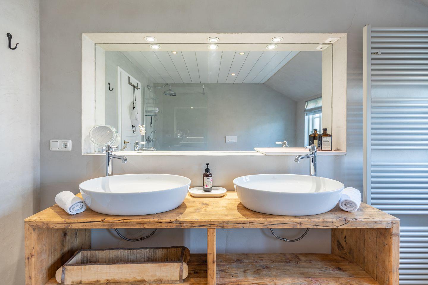 Ebenfalls im Obergeschoss befindet sich das großzügige Badezimmer. Es wirkt hell, ruhig und hochwertig gestaltet. Zwei Waschbecken auf einer massiven Holzkonsole bieten viel Platz für mehrere Personen. Eine freistehende Badewanne lädt zum Entspannen ein. Zusätzlich steht eine bodengleiche Regendusche mit Glasabtrennung zur Verfügung. Ein Handtuchheizkörper sorgt für zusätzlichen Komfort.