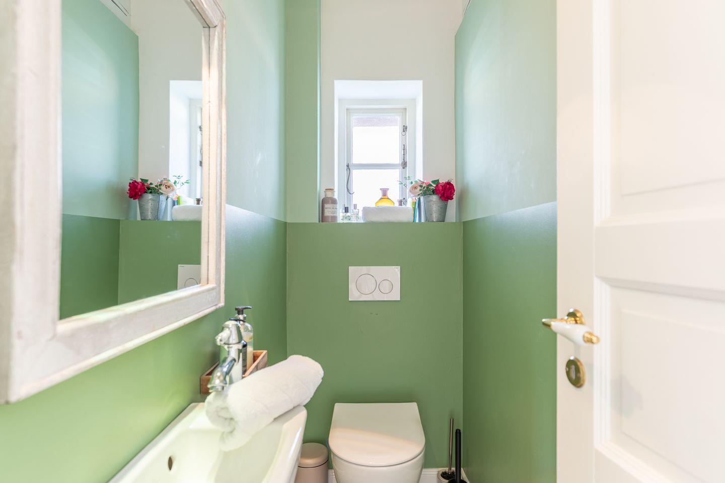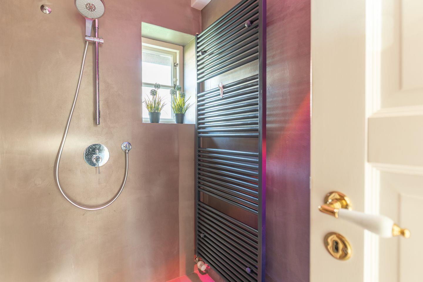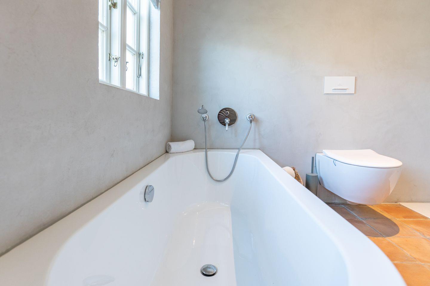 Ebenfalls im Obergeschoss befindet sich das großzügige Badezimmer. Es wirkt hell, ruhig und hochwertig gestaltet. Zwei Waschbecken auf einer massiven Holzkonsole bieten viel Platz für mehrere Personen. Eine freistehende Badewanne lädt zum Entspannen ein. Zusätzlich steht eine bodengleiche Regendusche mit Glasabtrennung zur Verfügung. Ein Handtuchheizkörper sorgt für zusätzlichen Komfort.