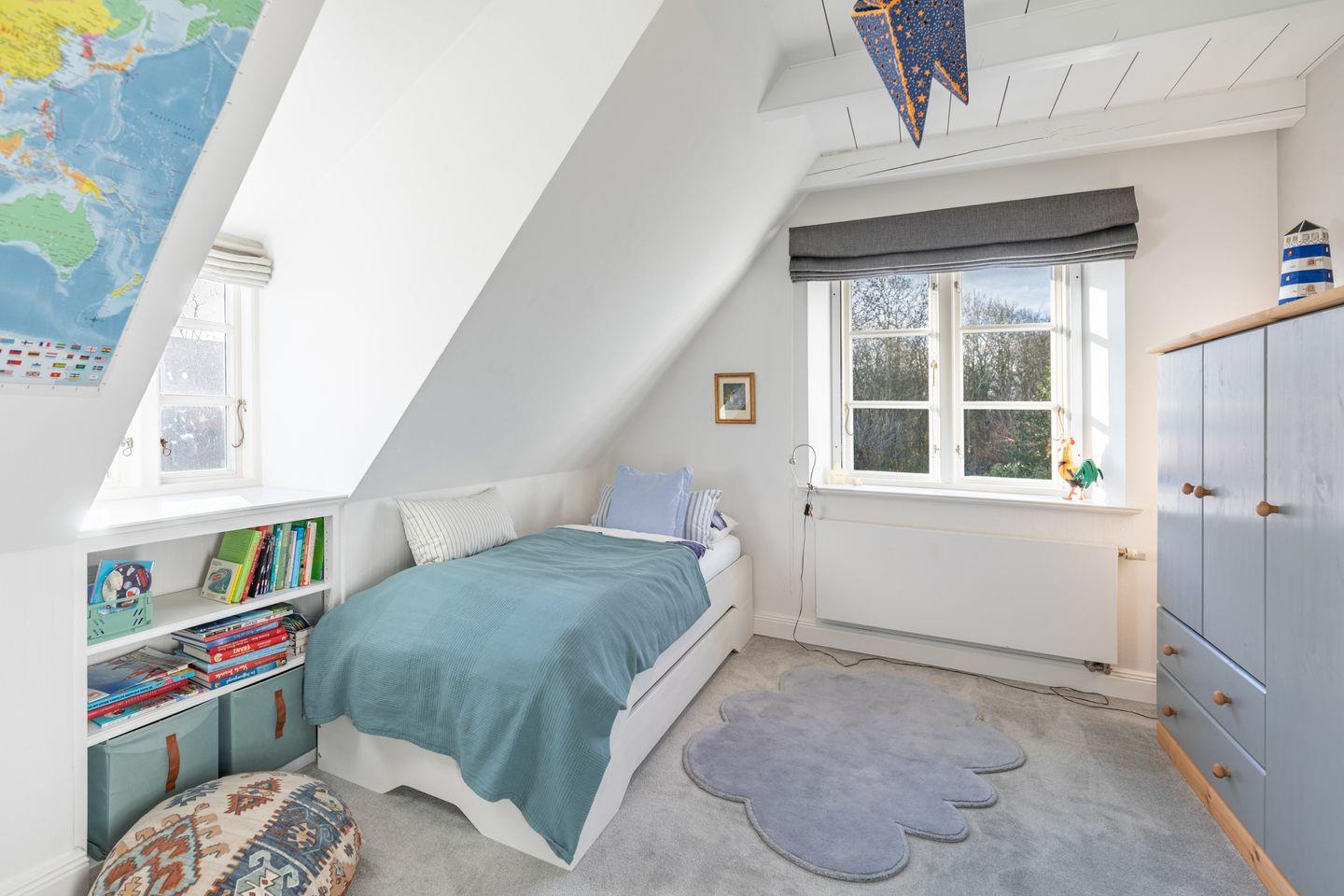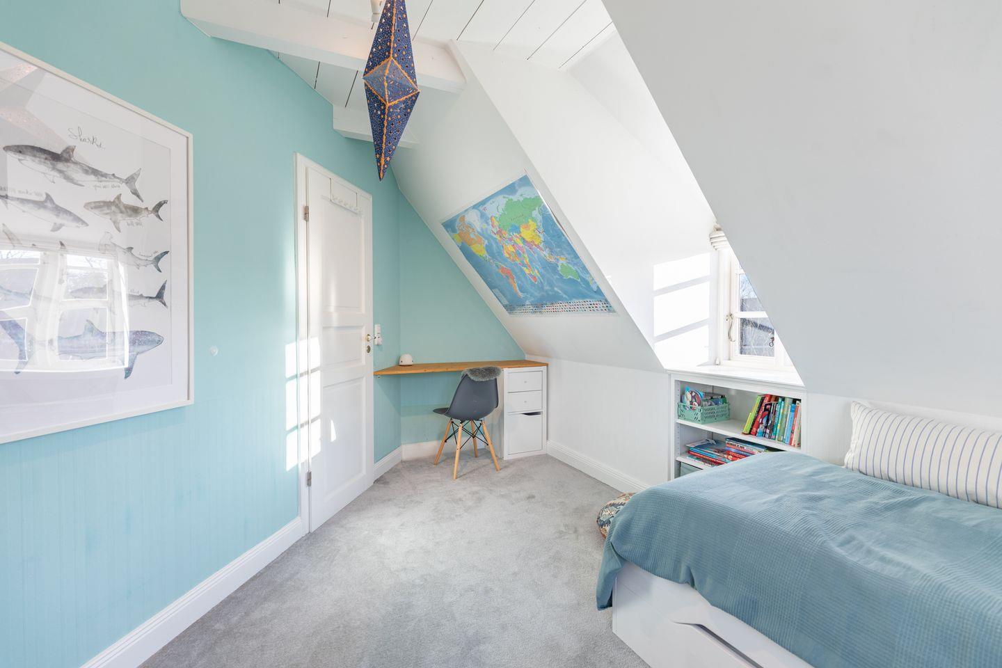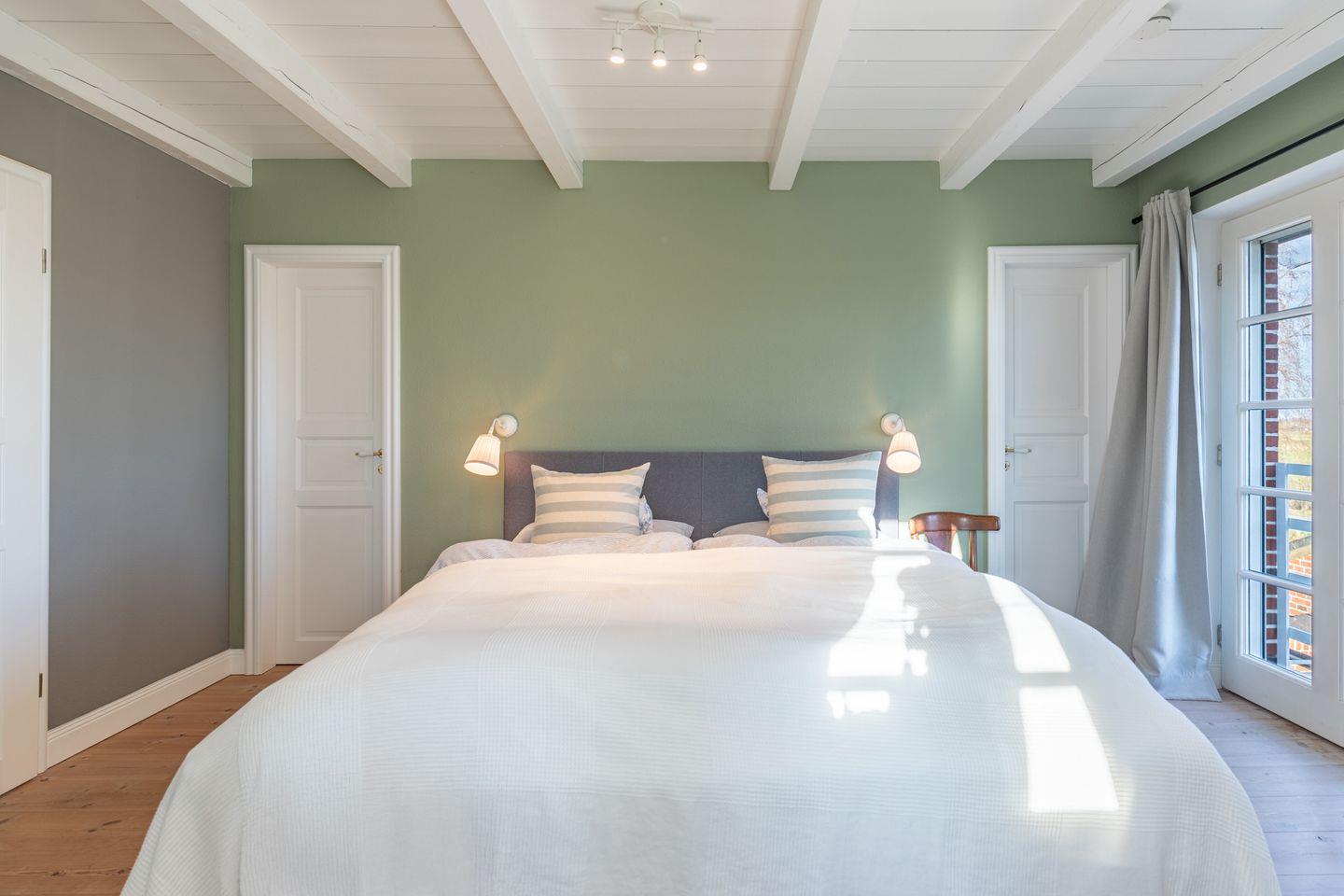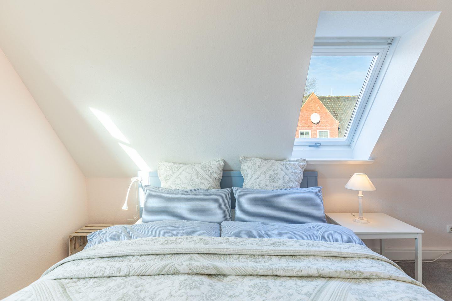 Vom Wohnbereich führt eine Treppe ins Obergeschoss. Hier liegt der private Rückzugsbereich des Hauses mit insgesamt drei Schlafzimmern. Zwei Schlafzimmer sind mit komfortablen Doppelbetten ausgestattet und bieten viel Platz für erholsame Nächte. Eines der Zimmer verfügt über ein Boxspringbett (180 x 200), das zweite über ein Doppelbett (160 x 200). Das dritte Schlafzimmer ist mit einem praktischen Stapelbett ausgestattet und eignet sich ideal für Kinder oder Jugendliche. Alle Schlafzimmer sind liebevoll eingerichtet und bieten ausreichend Stauraum für einen angenehmen Aufenthalt.