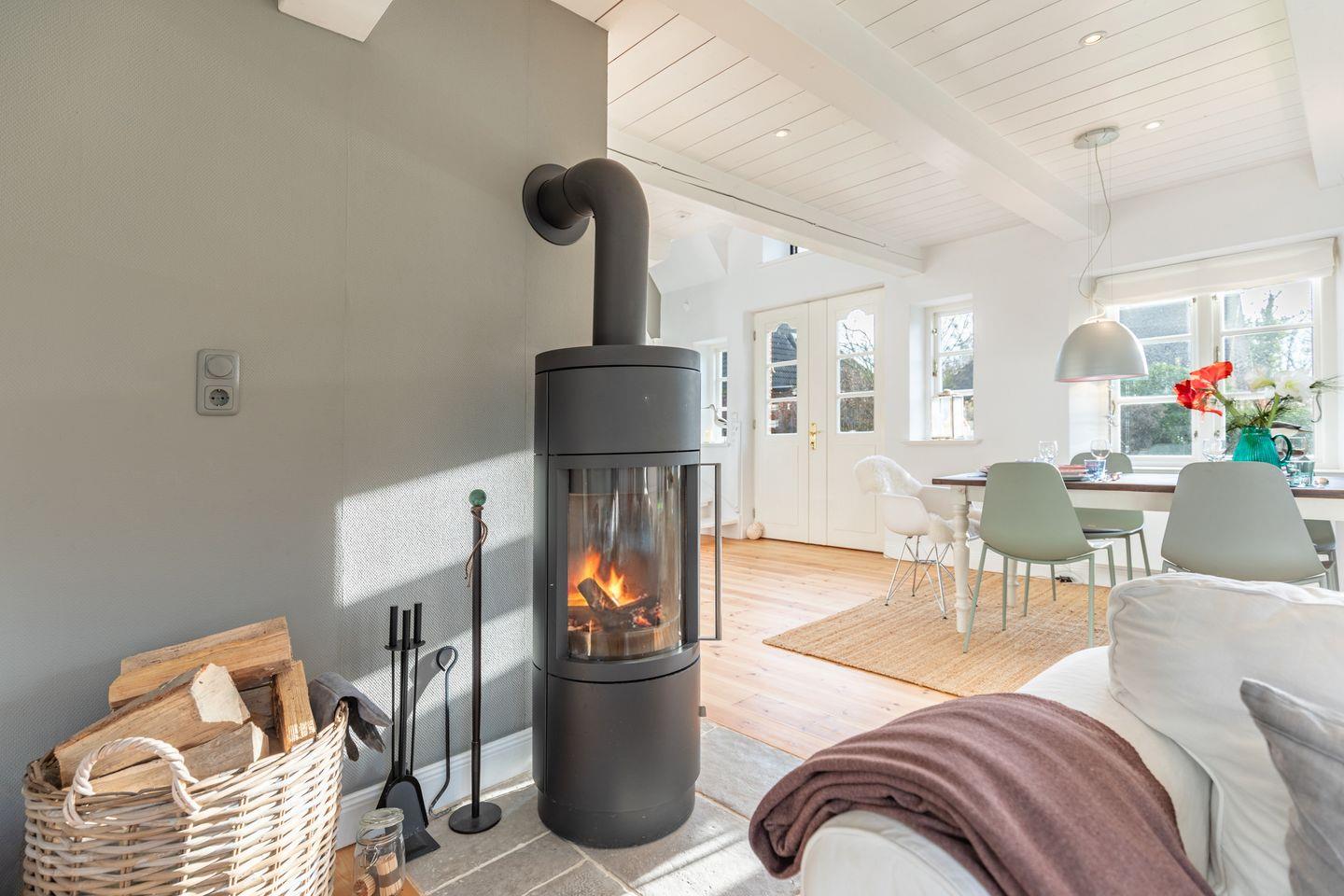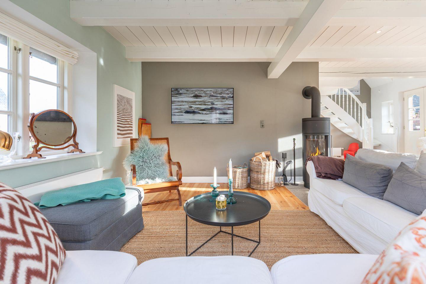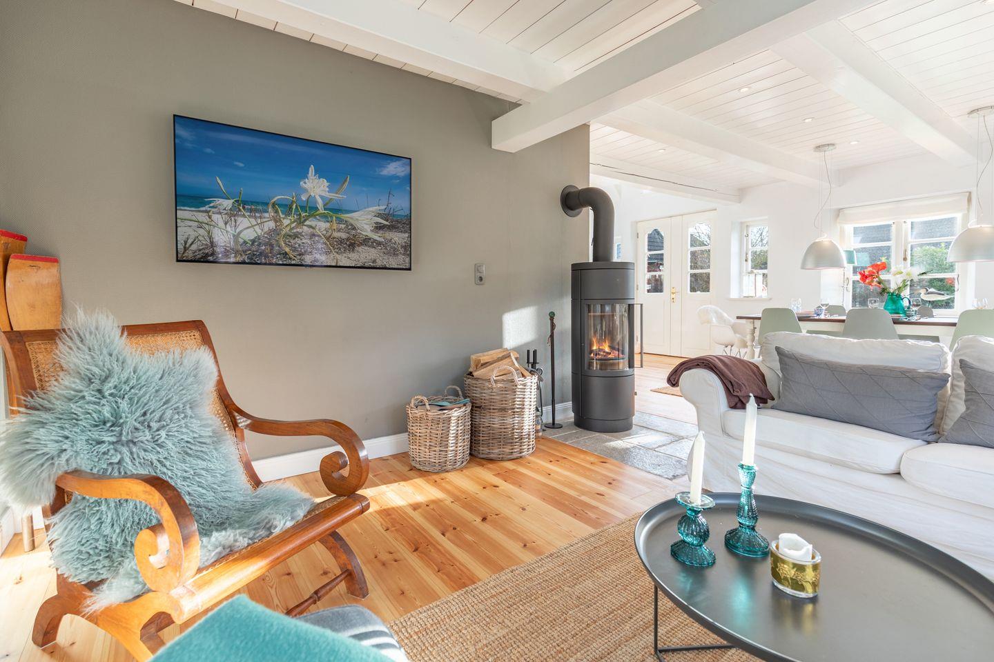Das Ferienhaus bietet auf rund 150 Quadratmetern Wohnfläche komfortablen Platz für bis zu acht Personen und wurde 2025 umfassend renoviert. Das Wohnzimmer bildet das Herz des Hauses. Es ist offen gestaltet und geht fließend in den Essbereich über. Mittelpunkt des Raumes ist der große Esstisch aus massivem Holz. Hier finden bis zu sechs Personen bequem Platz. Gemeinsame Mahlzeiten, Spieleabende oder das Frühstück mit Blick in den Garten werden schnell zum festen Ritual. Direkt angrenzend liegt der gemütliche Wohnbereich mit großzügigen Sofas. Die Sitzlandschaft lädt zum Lesen, Entspannen oder zu ruhigen Abenden vor dem Kamin ein. Ein Fernseher steht im Wohnbereich ebenfalls zur Verfügung. Der Kaminofen steht zentral im Raum und sorgt an kühleren Tagen für angenehme Wärme und eine behagliche Atmosphäre.