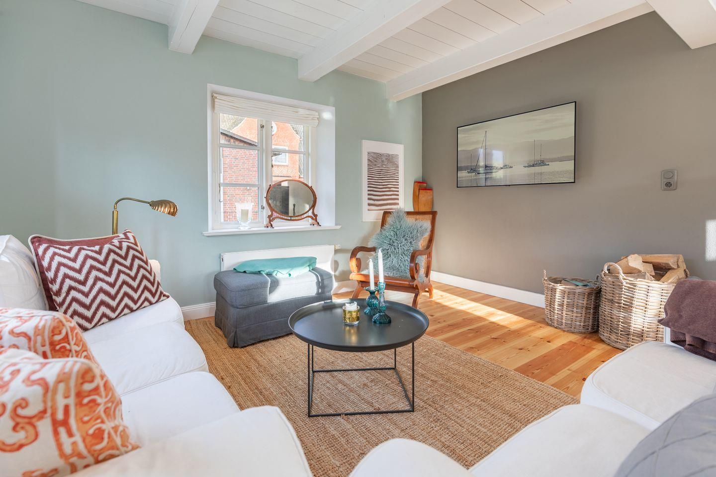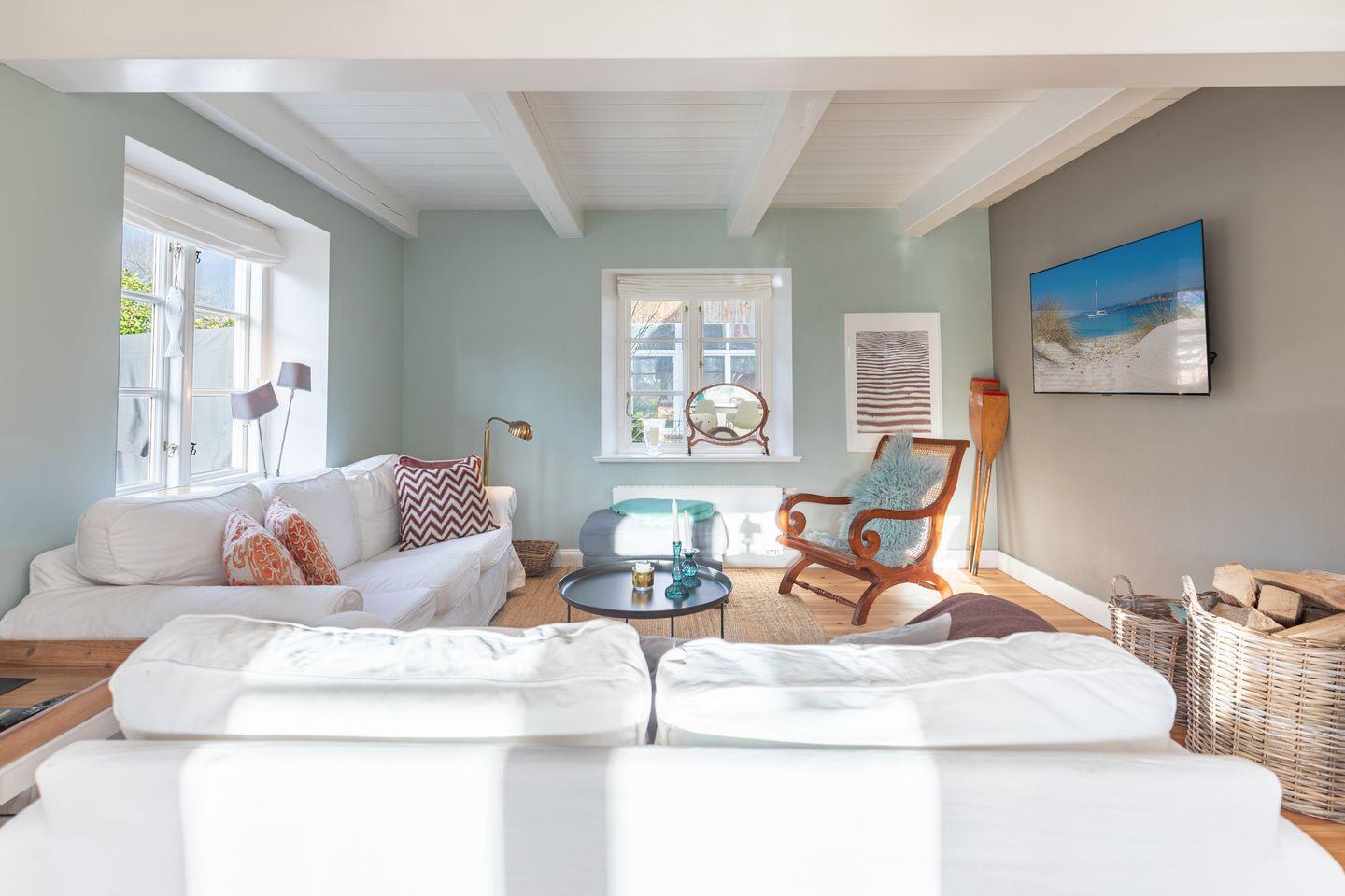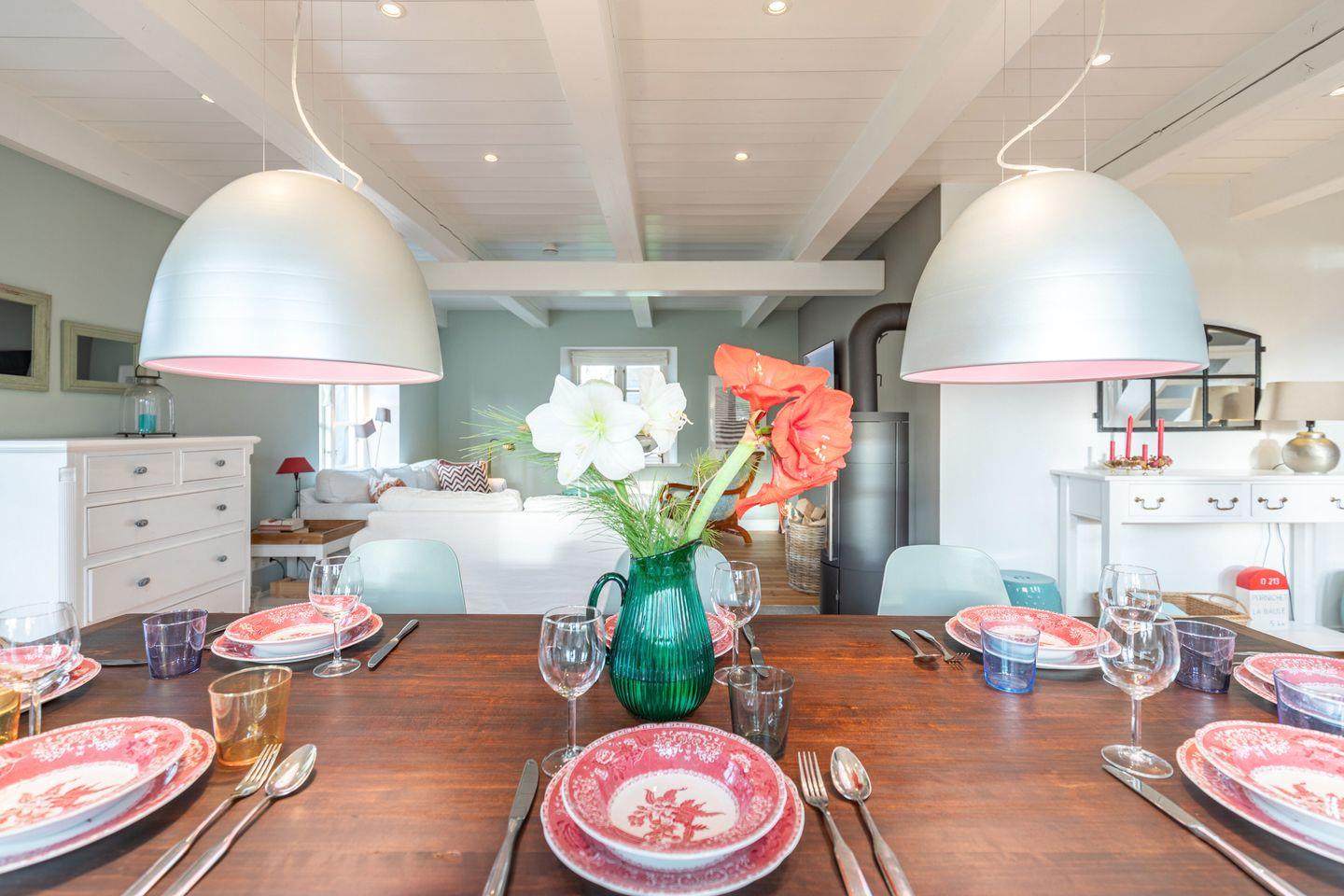 Das Ferienhaus bietet auf rund 150 Quadratmetern Wohnfläche komfortablen Platz für bis zu acht Personen und wurde 2025 umfassend renoviert. Das Wohnzimmer bildet das Herz des Hauses. Es ist offen gestaltet und geht fließend in den Essbereich über. Mittelpunkt des Raumes ist der große Esstisch aus massivem Holz. Hier finden bis zu sechs Personen bequem Platz. Gemeinsame Mahlzeiten, Spieleabende oder das Frühstück mit Blick in den Garten werden schnell zum festen Ritual. Direkt angrenzend liegt der gemütliche Wohnbereich mit großzügigen Sofas. Die Sitzlandschaft lädt zum Lesen, Entspannen oder zu ruhigen Abenden vor dem Kamin ein. Ein Fernseher steht im Wohnbereich ebenfalls zur Verfügung. Der Kaminofen steht zentral im Raum und sorgt an kühleren Tagen für angenehme Wärme und eine behagliche Atmosphäre.
