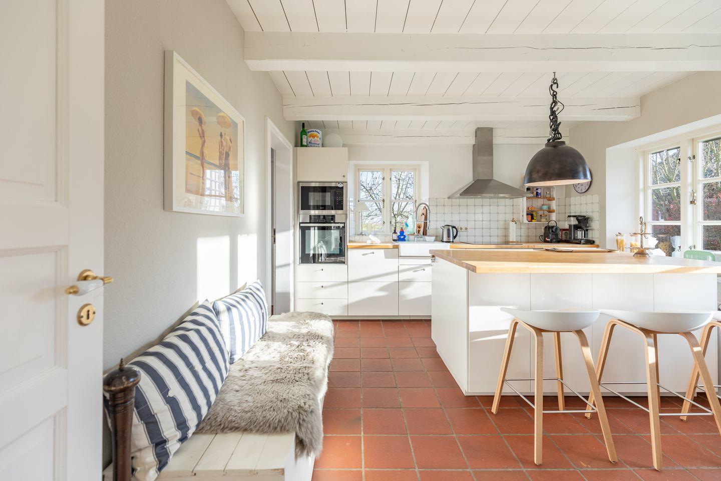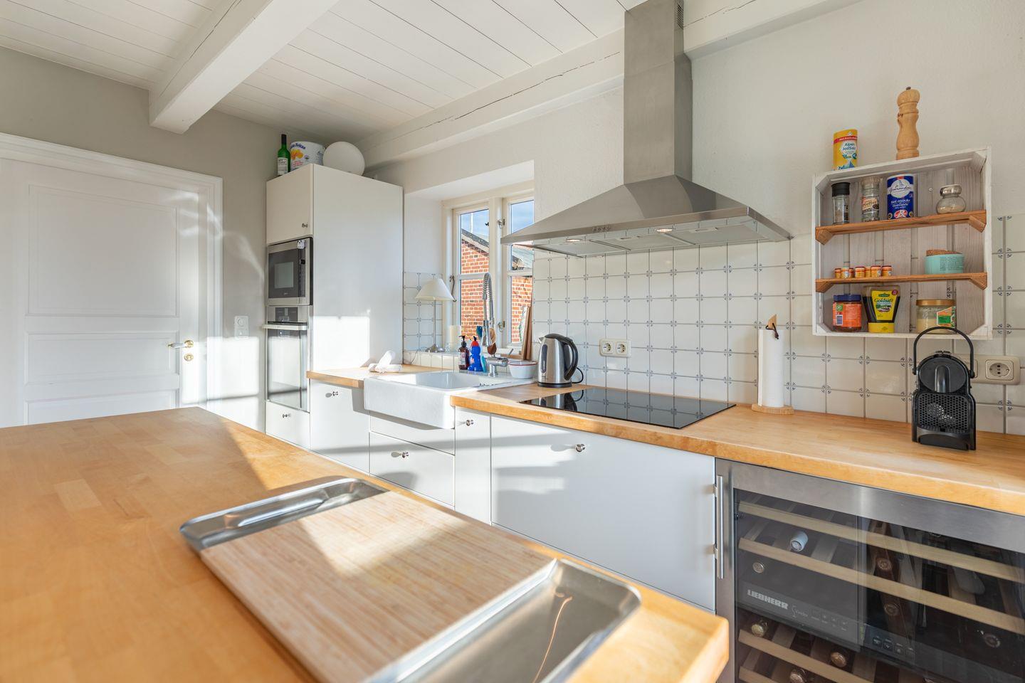 Die Küche ist großzügig und funktional gestaltet. Zentrales Element ist die große Kücheninsel mit Holzarbeitsplatte und Sitzplätzen. Sie bietet viel Raum zum Kochen und Zusammensitzen. Die Ausstattung ist vollständig und hochwertig. Zur Verfügung stehen Backofen, Mikrowelle, Kochfeld, Geschirrspüler, Kühlschrank mit Gefrierfach sowie ein Weinkühlschrank. Kaffeemaschine, Wasserkocher und Toaster sind ebenfalls vorhanden.