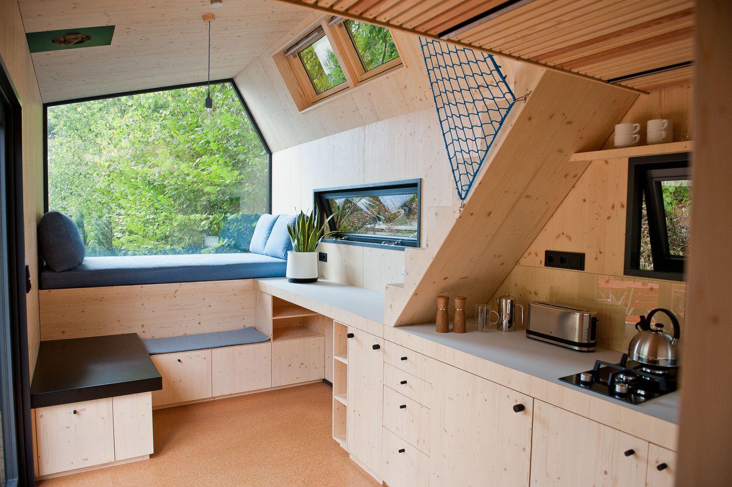 Hinweis: Bitte beachte, dass der Kaminofen vorübergehend nicht zur Verfügung steht. Wir bitten diese Einschränkung vielmals zu entschuldigen. Übernachte in unserem Flagship-Modell für Designliebhaber - dem Green Tiny House Pioneer. Erlebe Nachhaltigkeit von morgen und ein Naturerlebnis der besonderen Art. Unser Vorzeigemodell wird in liebevoller Manufakturarbeit in Schleswig-Holstein hergestellt und bietet auf 22 Quadratmetern Platz für bis zu drei Erwachsene oder zwei Erwachsene und zwei Kinder. Wie jedes unserer kleinen Häuschen ist es als nachhaltige Ferienimmobilie zertifiziert und besteht komplett aus wohngesunden Materialien. Zu den Ausstattungshighlights gehören ein übergroßes Panoramafenster auf der Wohnebene und ein großes Dachfenster auf der Schlafebene, von dem aus man die Sterne beobachten kann. Außerdem eine voll ausgestattete Küche und ein modernes Badezimmer. Außerdem bieten wir dir eine klimaneutrale Übernachtung dank Kompensation aller anfallenden CO2-Emissionen.
