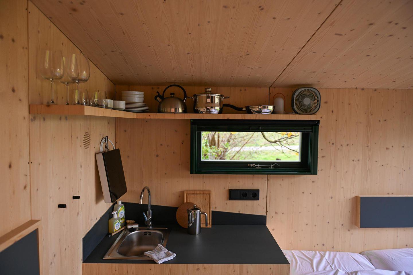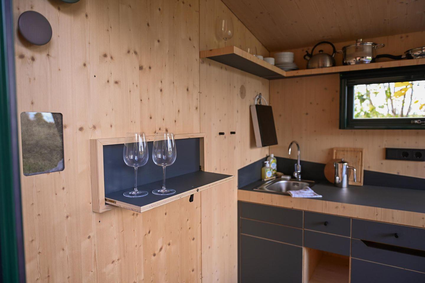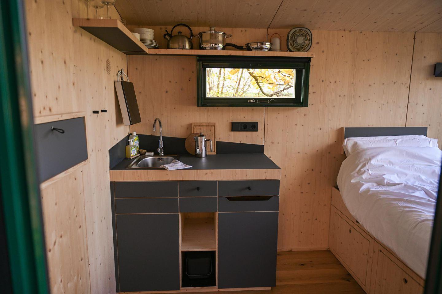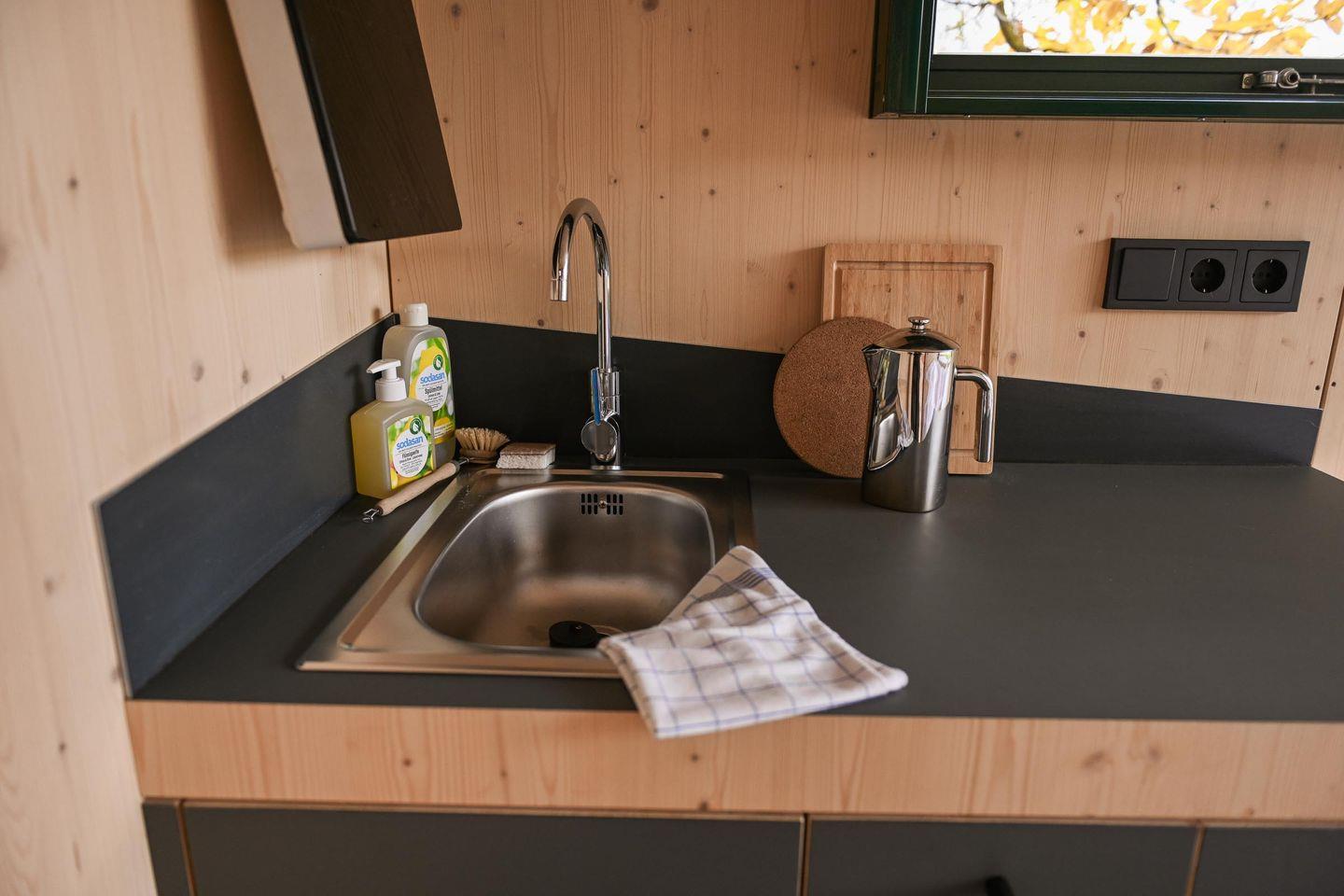 Die kleine Kochnische ist so gestaltet, dass du dich selbst versorgen kannst, ohne Aufwand. Es gibt einen Mini-Kühlschrank, ein mobiles Induktionskochfeld, eine French Press und einen Flötenkessel für deinen Kaffee oder Tee am Morgen, dazu Geschirr, Pfanne, Topf, Besteck und Reinigungsmittel. Das Wasser im Sleep Space stammt aus der hauseigenen Brunnenanlage – perfekt zum Spülen und Waschen –, während dir frisches Trinkwasser zum Kochen und Trinken über bereitgestellte Kanister zur Verfügung steht. So bleibt alles im Sinne der Nachhaltigkeit: einfach, funktional, umweltbewusst.
