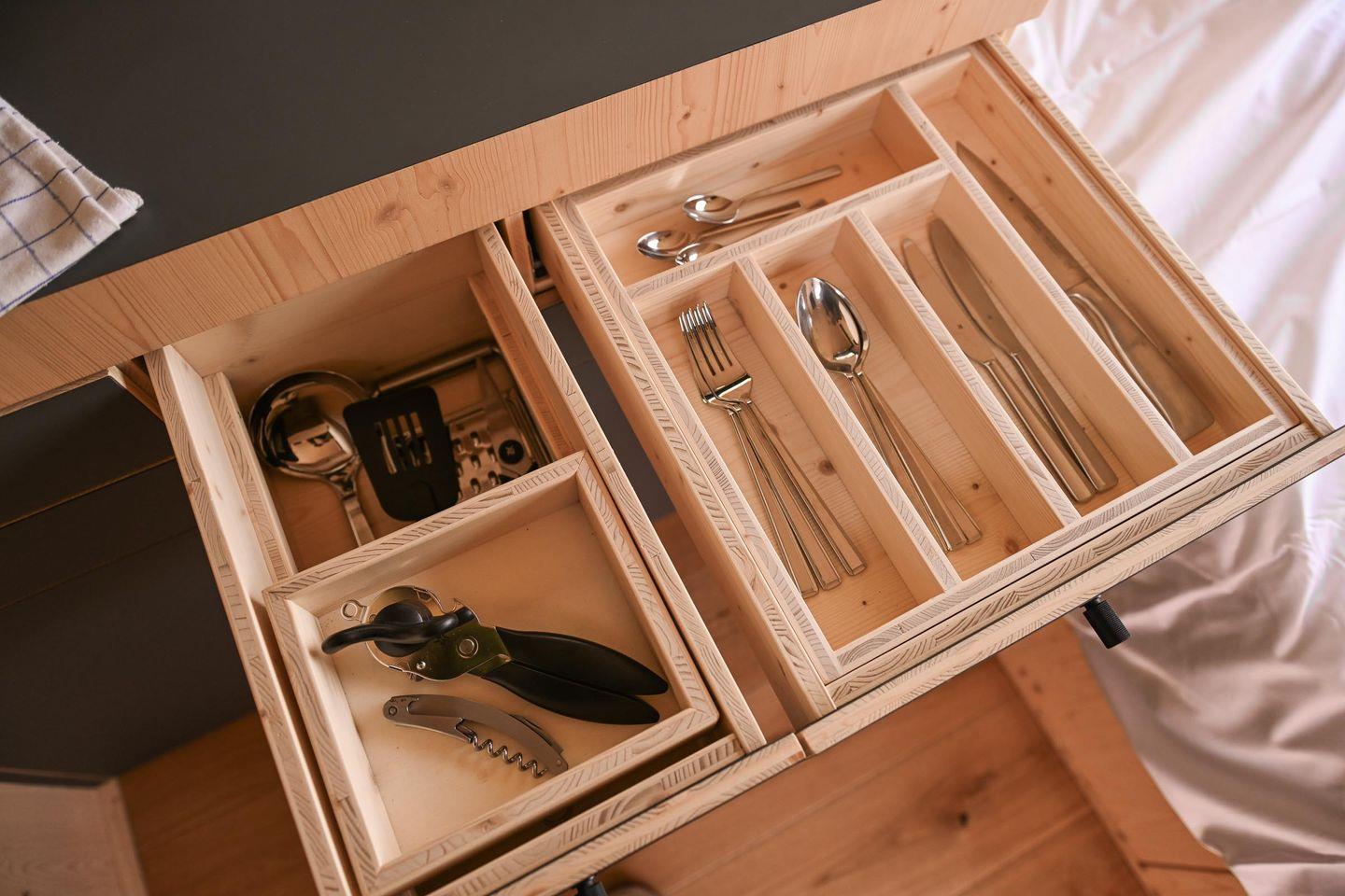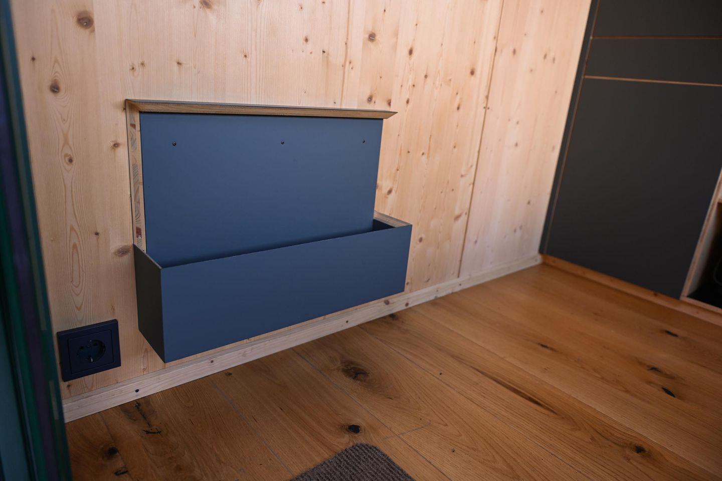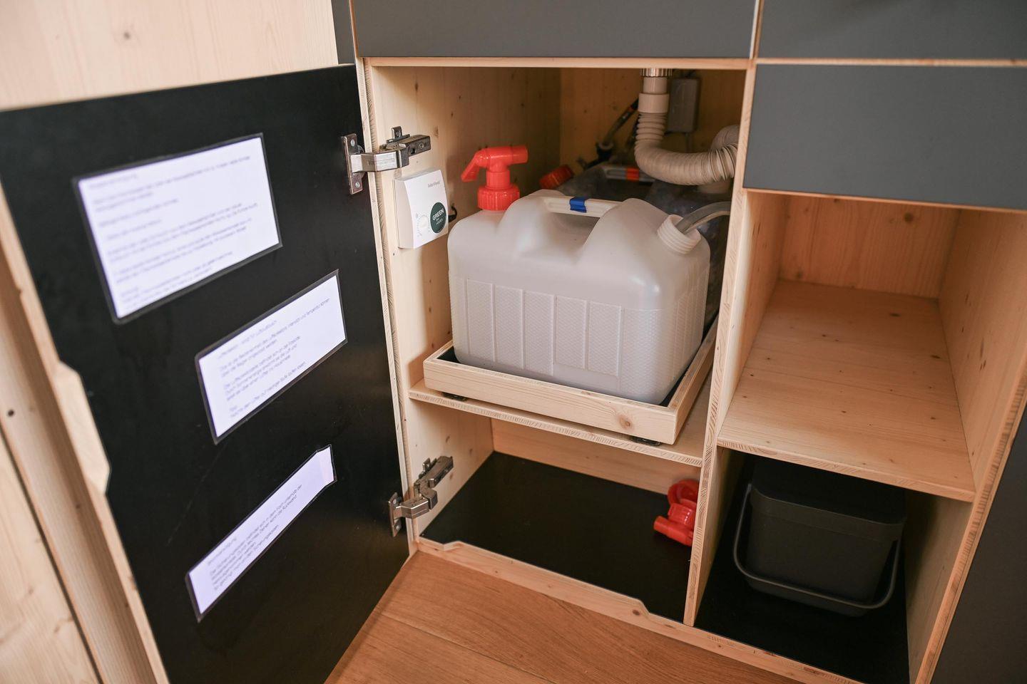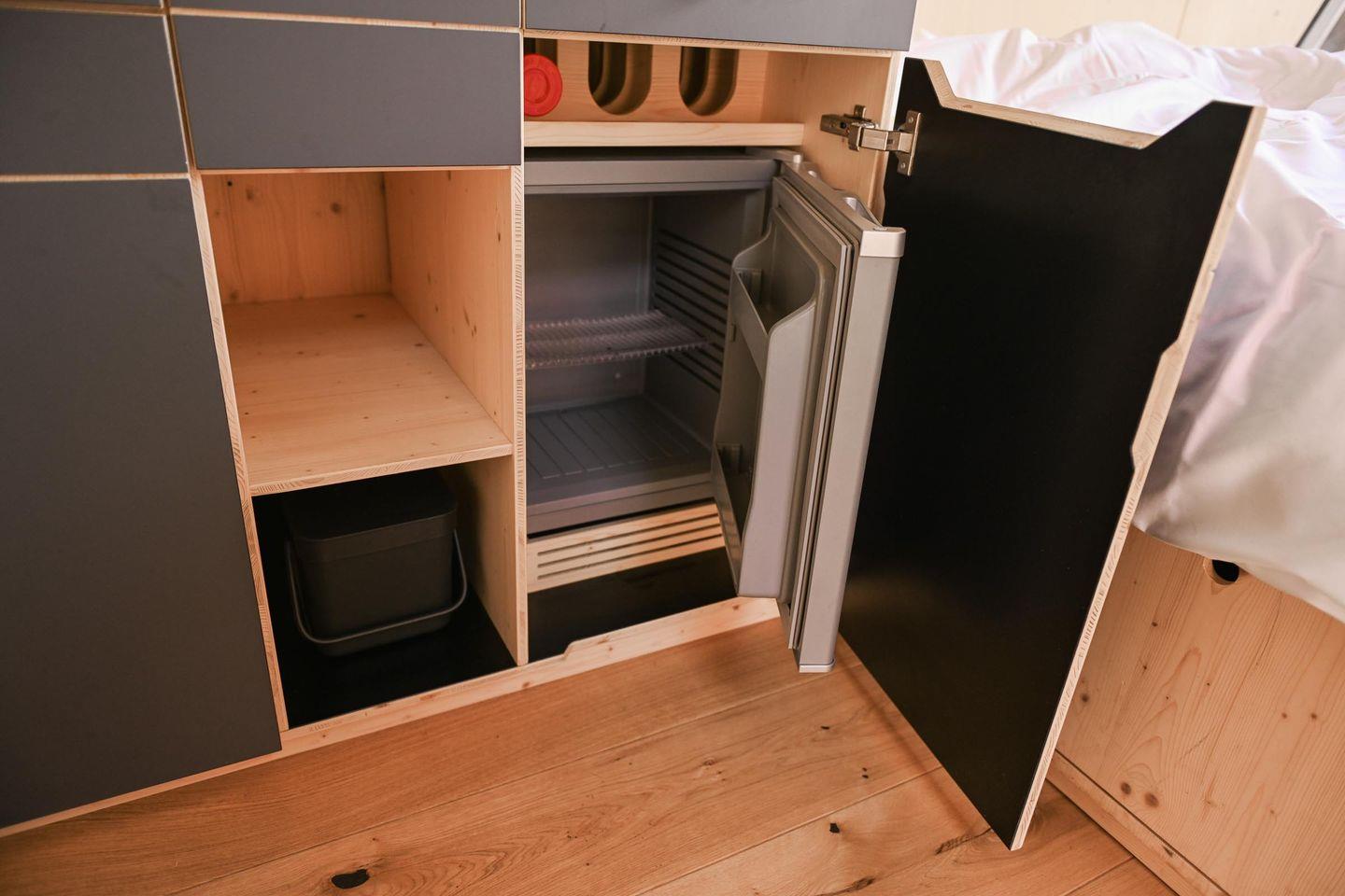 Die kleine Kochnische ist so gestaltet, dass du dich selbst versorgen kannst, ohne Aufwand. Es gibt einen Mini-Kühlschrank, ein mobiles Induktionskochfeld, eine French Press und einen Flötenkessel für deinen Kaffee oder Tee am Morgen, dazu Geschirr, Pfanne, Topf, Besteck und Reinigungsmittel. Das Wasser im Sleep Space stammt aus der hauseigenen Brunnenanlage – perfekt zum Spülen und Waschen –, während dir frisches Trinkwasser zum Kochen und Trinken über bereitgestellte Kanister zur Verfügung steht. So bleibt alles im Sinne der Nachhaltigkeit: einfach, funktional, umweltbewusst.