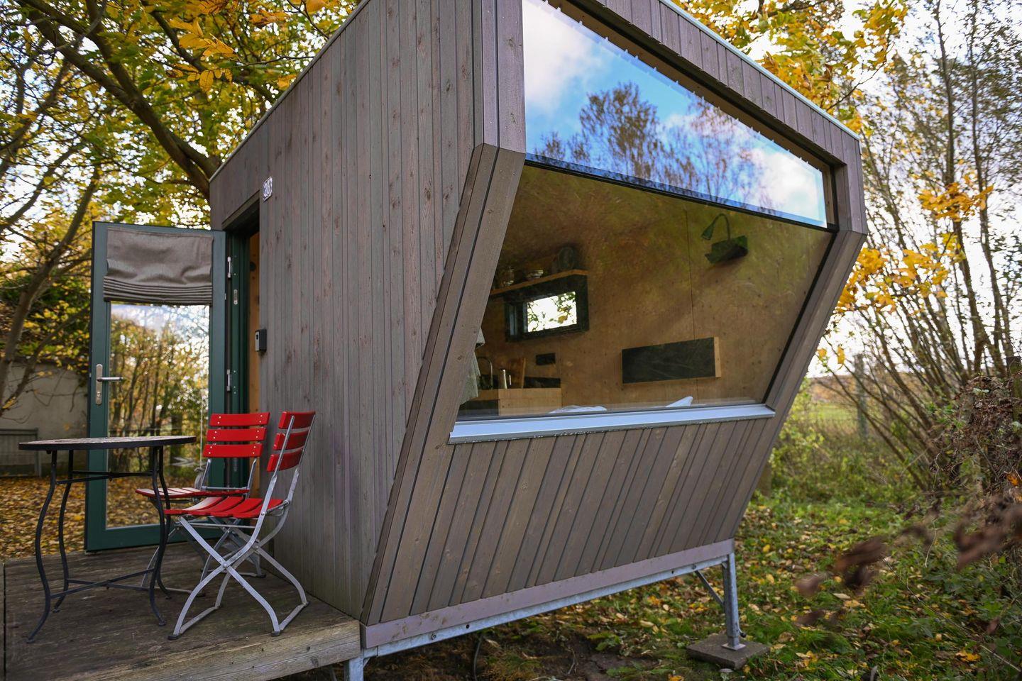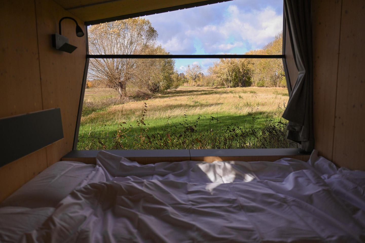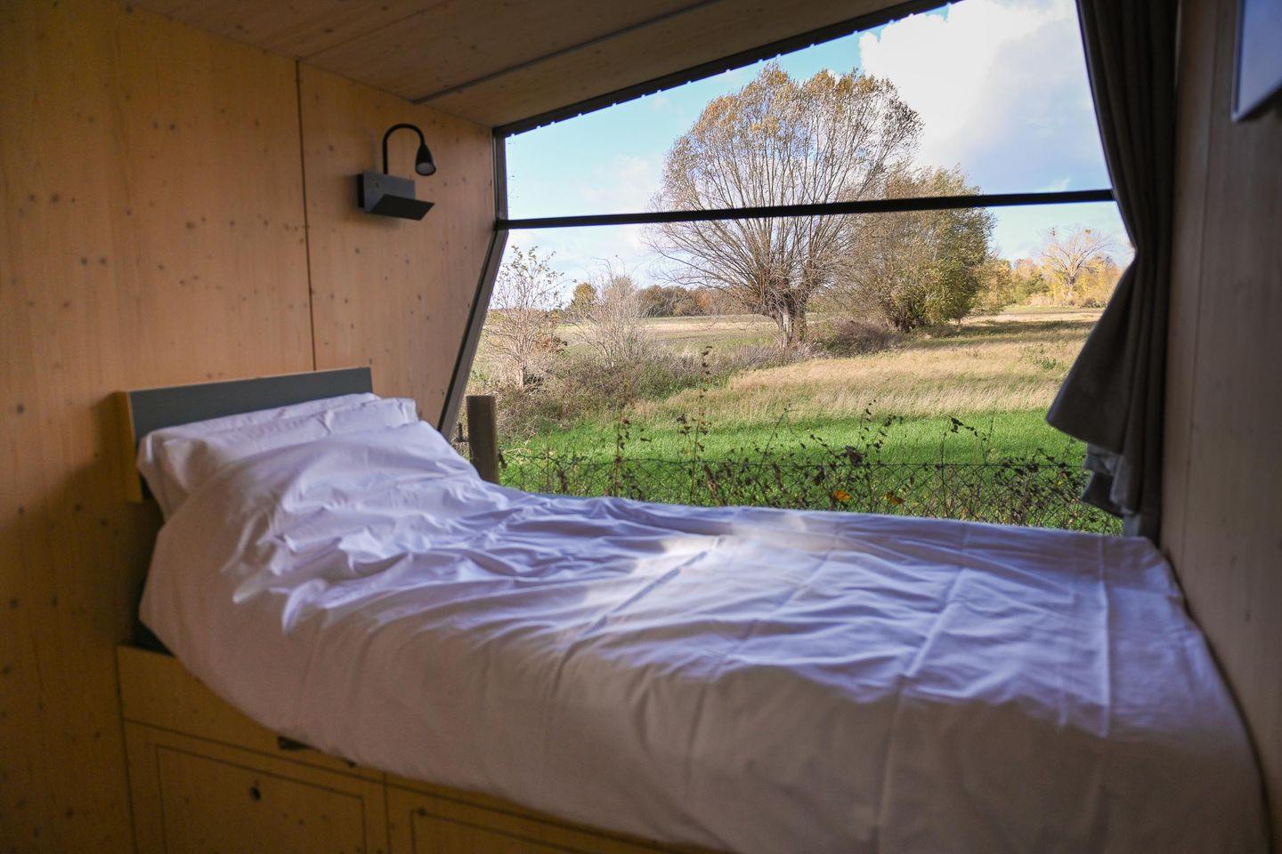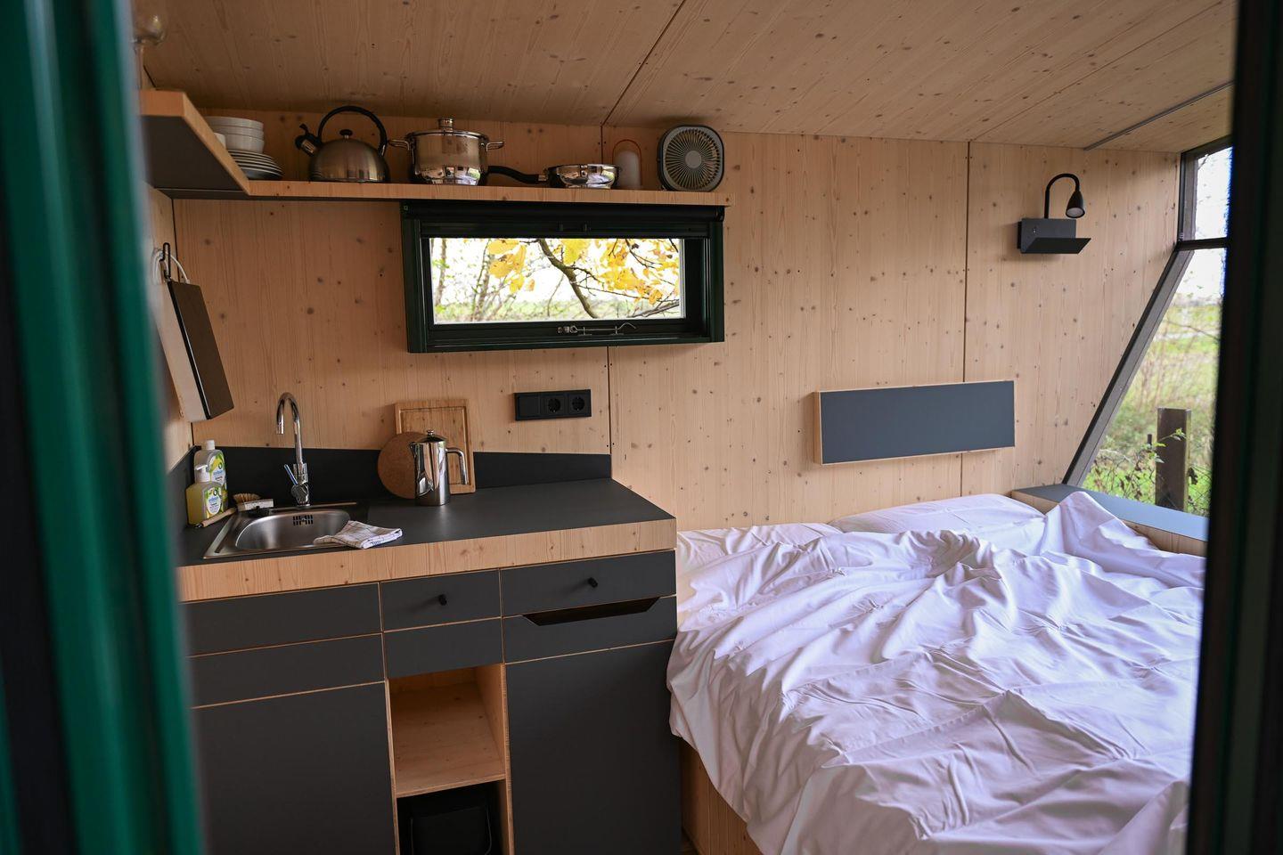 Auf nur rund fünf Quadratmetern findest du alles, was du brauchst, um auf kleinem Raum groß zu leben. Das große Panoramafenster bringt Licht und Natur direkt in den Raum und öffnet den Blick auf die bewachsenen Felder. Tagsüber lädt die Loungefläche zum Entspannen ein – mit einem Buch, einem Kaffee oder einfach beim Beobachten der Natur. Abends verwandelst du diesen Bereich in dein gemütliches Bett (1,40 × 2,00 m) mit hochwertiger Bettwäsche, Decken und Kissen. Die Atmosphäre ist klar, ruhig und reduziert – und genau dadurch besonders wohltuend.