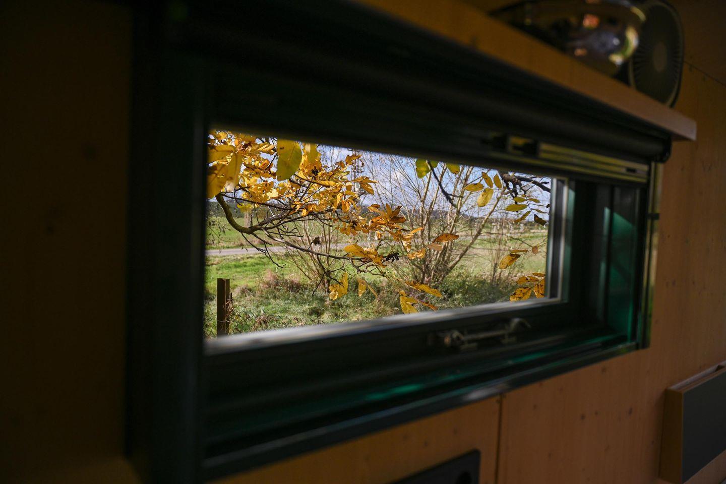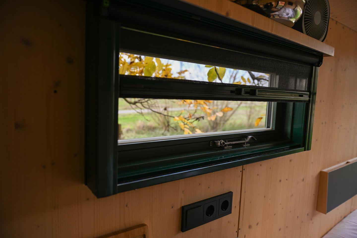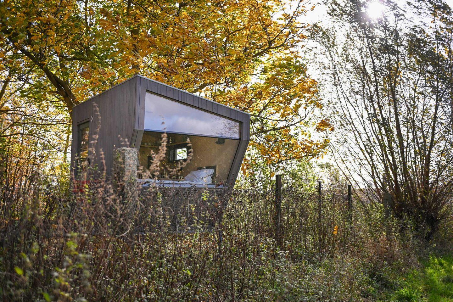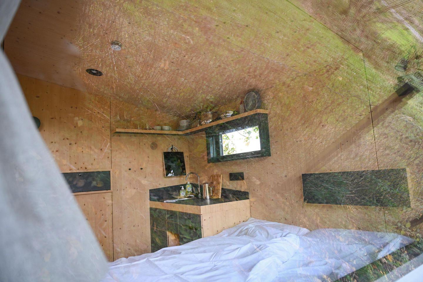 Auf nur rund fünf Quadratmetern findest du alles, was du brauchst, um auf kleinem Raum groß zu leben. Das große Panoramafenster bringt Licht und Natur direkt in den Raum und öffnet den Blick auf die bewachsenen Felder. Tagsüber lädt die Loungefläche zum Entspannen ein – mit einem Buch, einem Kaffee oder einfach beim Beobachten der Natur. Abends verwandelst du diesen Bereich in dein gemütliches Bett (1,40 × 2,00 m) mit hochwertiger Bettwäsche, Decken und Kissen. Die Atmosphäre ist klar, ruhig und reduziert – und genau dadurch besonders wohltuend.