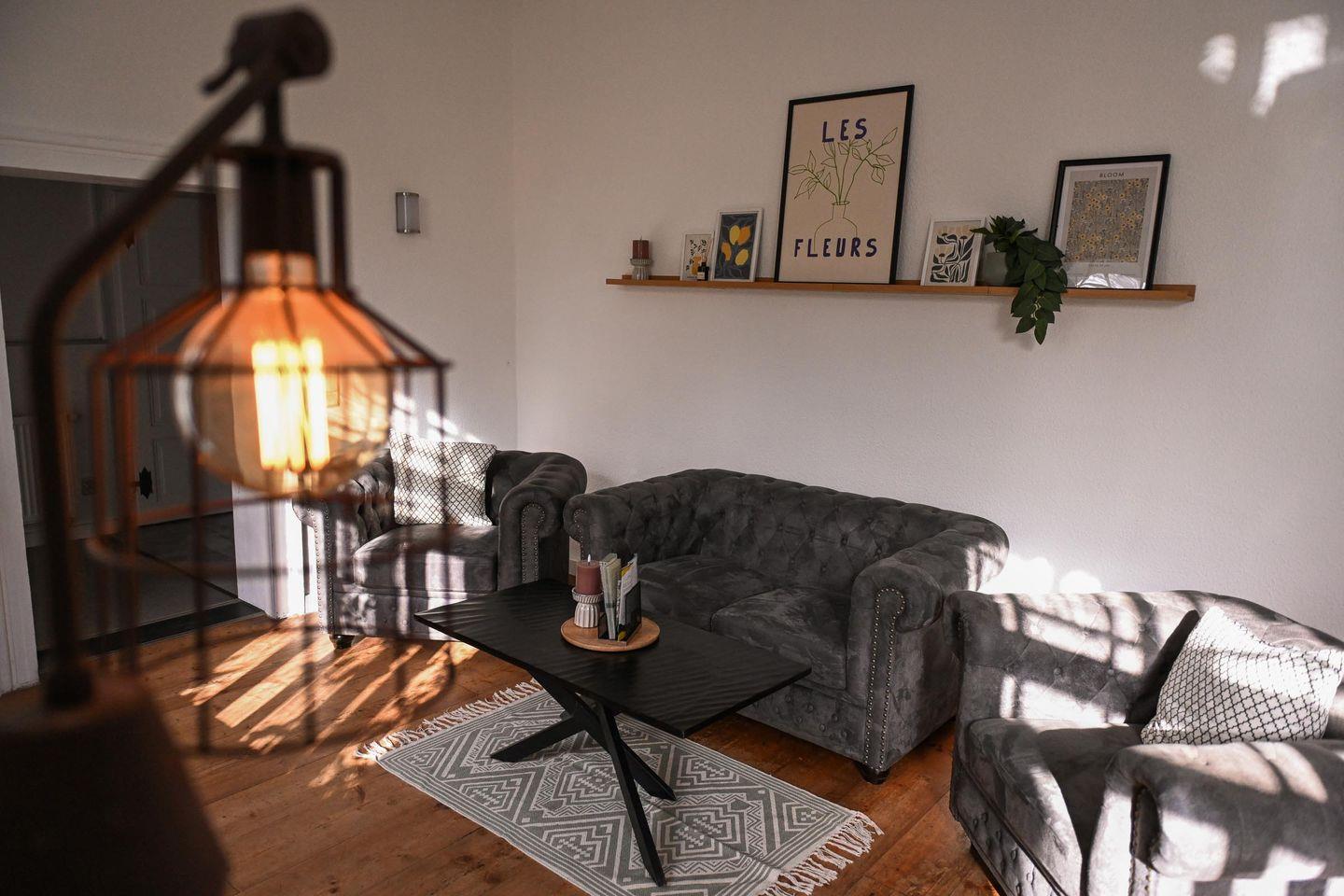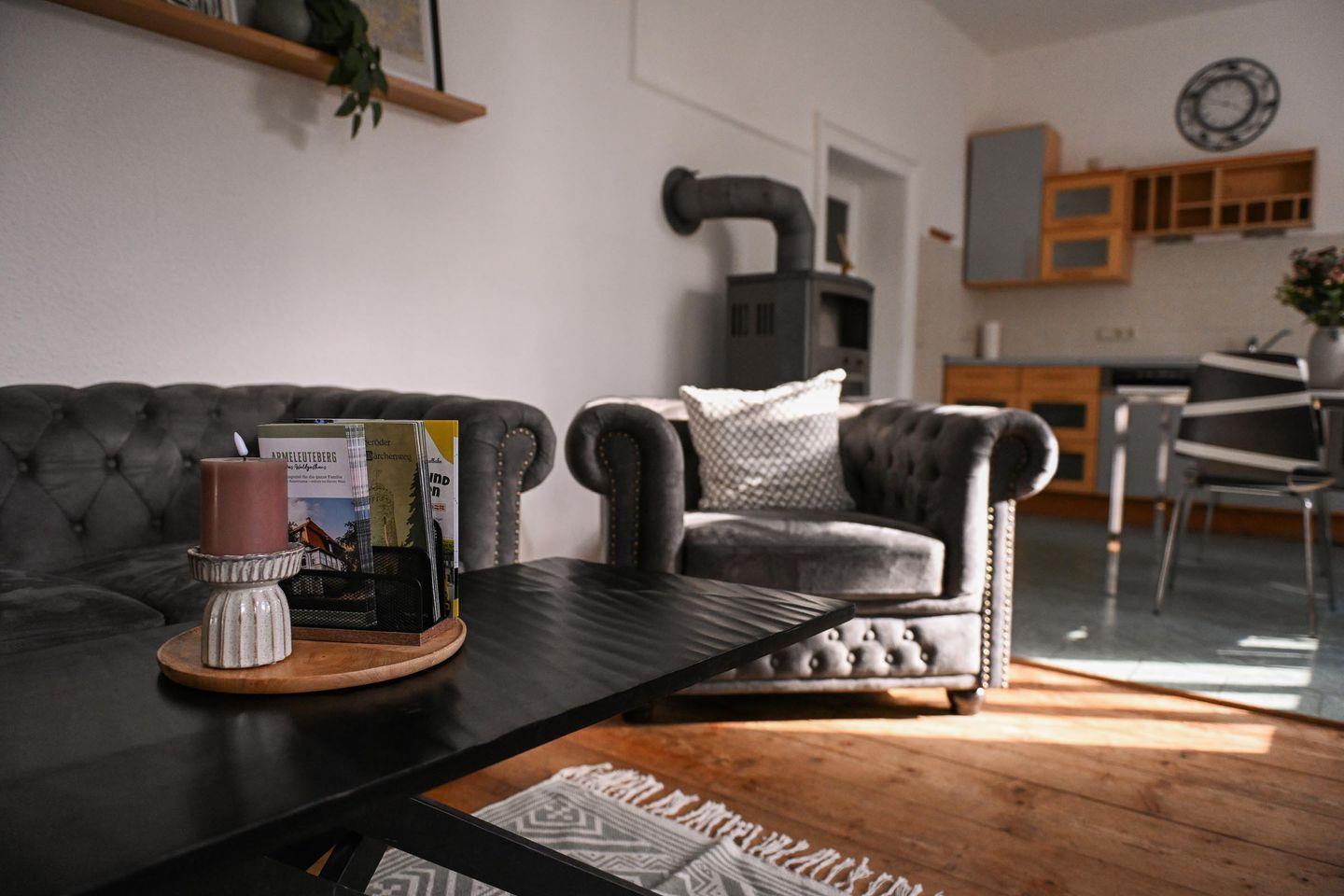 Draußen wartet eine kleine Terrasse mit Tisch und zwei Stühlen auf dich – dein Platz für den Kaffee in der Morgensonne oder für einen stillen Abend im Freien. Auf Wunsch kannst du dir eine Feuerschale dazu buchen und den Tag am knisternden Lagerfeuer ausklingen lassen, während über dir die Sterne stehen. Der Blick schweift über das Grundstück, über alte Bäume, das Mühlenhaus und das satte Grün des Harzvorlands – ein Ort, der sofort Ruhe schenkt. Parken kannst du direkt auf dem Grundstück. Check-in ist ab 15 Uhr möglich, Check-out bis 11 Uhr – beides erfolgt selbstständig über eine Schlüsselbox an der Unterkunft.