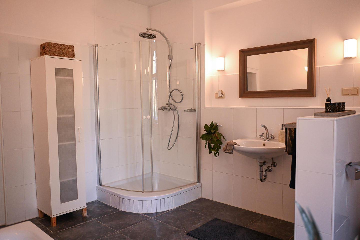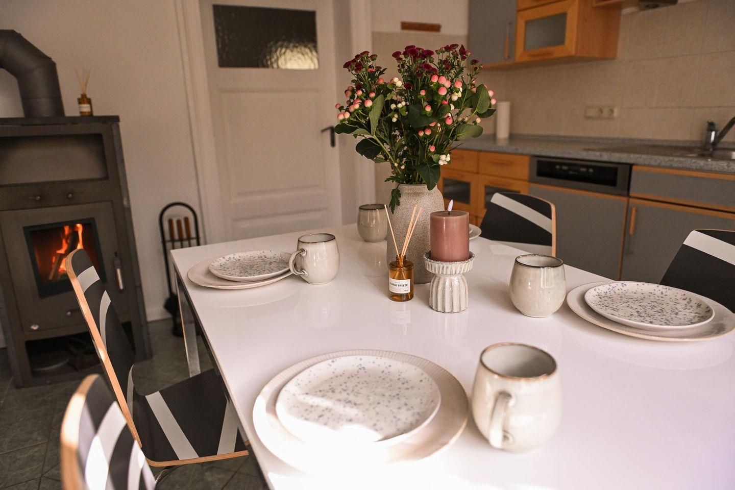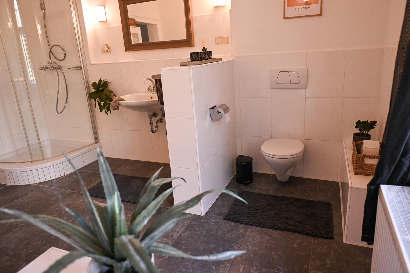 Wenn du mehr Raum brauchst, erwartet dich im angrenzenden alten Landhaus ein gemeinschaftlich nutzbarer Wohn- und Essbereich mit Küchenzeile, Esstisch, Sofa und Kaminofen. Hier kannst du dich zurückziehen, gemeinsam kochen oder einfach den Abend in gemütlicher Atmosphäre verbringen. Das Badezimmer im Landhaus ist modern, hell und mit Dusche sowie Badewanne ausgestattet und kann, falls das zweite Sleep Space belegt ist, gemeinsam genutzt werden. WLAN steht im Haupthaus zur Verfügung, im Tiny House selbst kann die Abdeckung schwächer sein – perfekt, um bewusst offline zu gehen und dich auf das Hier und Jetzt zu konzentrieren.