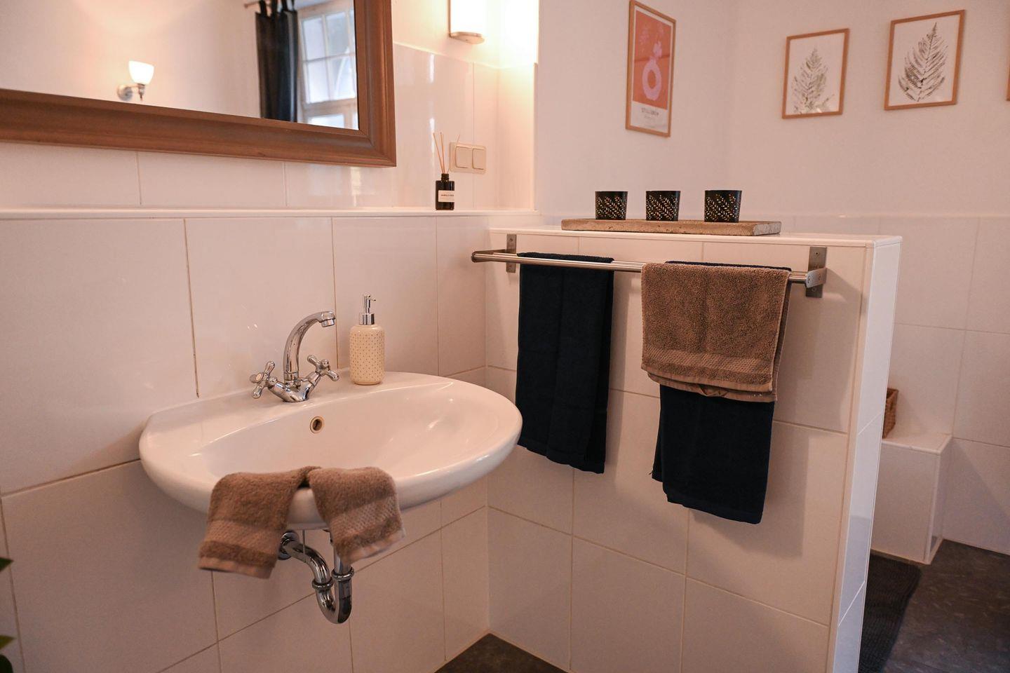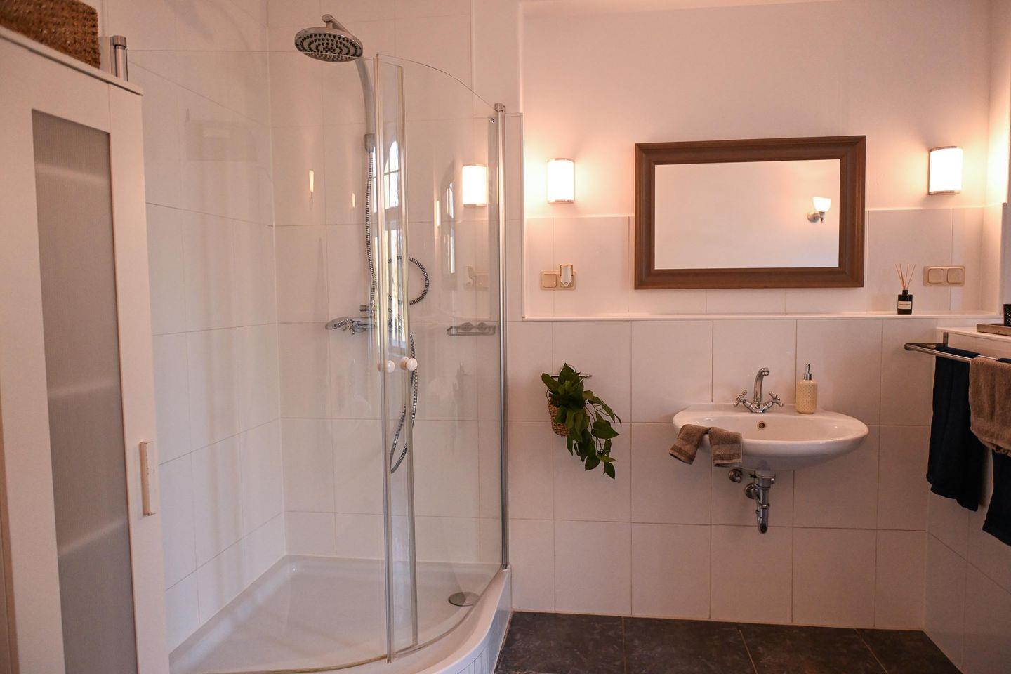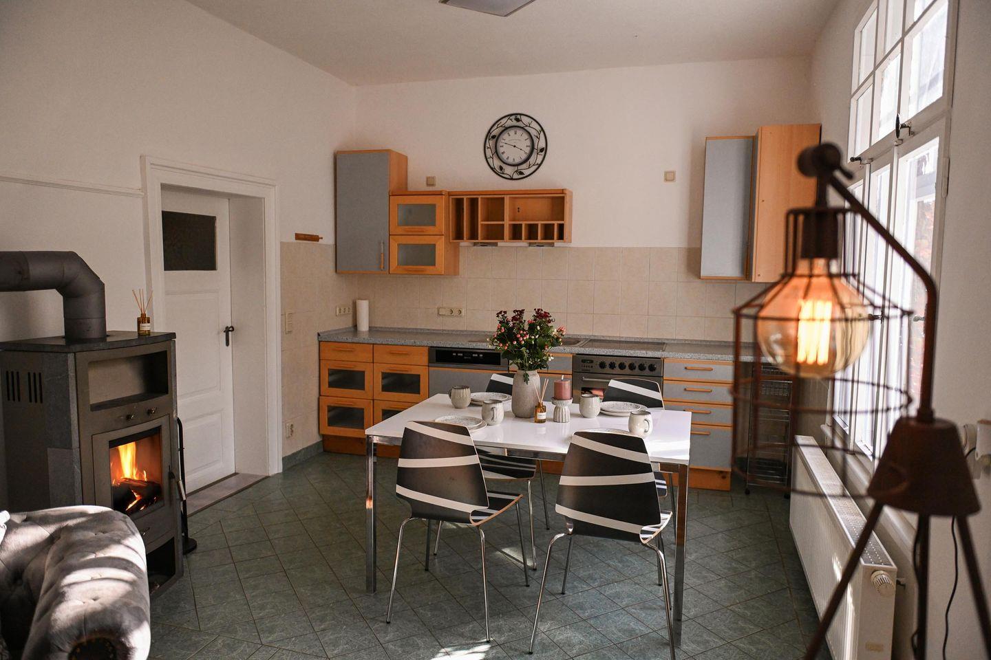 Wenn du mehr Raum brauchst, erwartet dich im angrenzenden alten Landhaus ein gemeinschaftlich nutzbarer Wohn- und Essbereich mit Küchenzeile, Esstisch, Sofa und Kaminofen. Hier kannst du dich zurückziehen, gemeinsam kochen oder einfach den Abend in gemütlicher Atmosphäre verbringen. Das Badezimmer im Landhaus ist modern, hell und mit Dusche sowie Badewanne ausgestattet und kann, falls das zweite Sleep Space belegt ist, gemeinsam genutzt werden. WLAN steht im Haupthaus zur Verfügung, im Tiny House selbst kann die Abdeckung schwächer sein – perfekt, um bewusst offline zu gehen und dich auf das Hier und Jetzt zu konzentrieren.