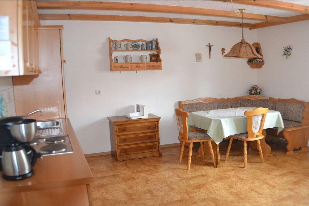 85 m² große und gemütlich eingerichtete Ferienwohnung mit 2 Doppelzimmer (davon eines zusätzlich mit Dusche und WC), große Wohnküche, Wohnzimmer, Bad, WC, alle Räumlichkeiten mit Zentralheizung, Balkon, Satelliten - Fernsehen, Radio und Kinderliege. Die Anwendungen im Wellnessstodl müssen frühzeitig gebucht werden und werden separat berechnet. Sauna und Whirlpool benötigen eine Vorlaufzeit von 24 Stunden. Der Whirlpool ist nur von ca. Oktober bis ca. Anfang April in Betrieb.