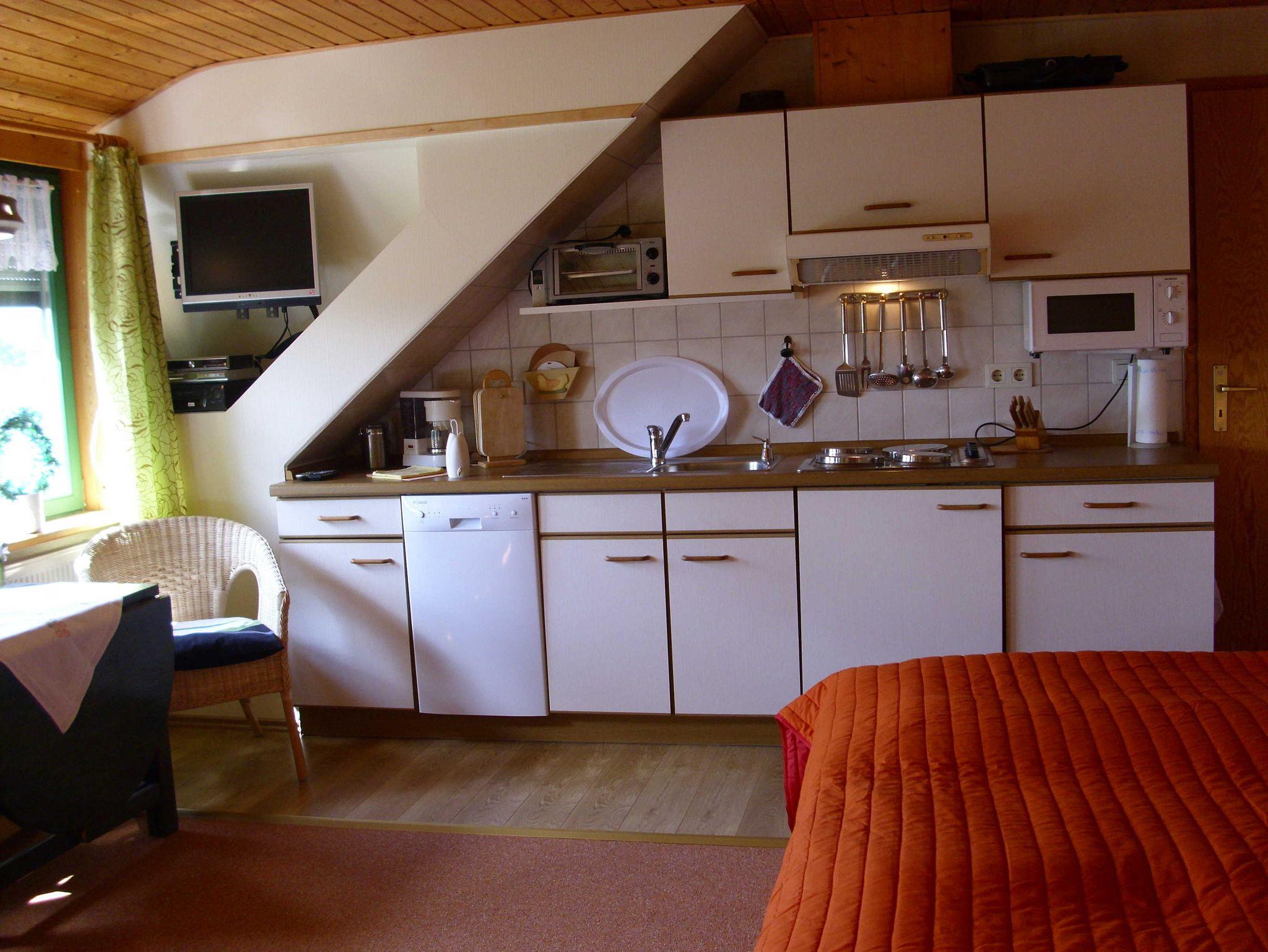 Das Appartment Birkenblick hat ca. 45m² Wohnfläche für max. 2 Erwachsene. Die Gäste können ein Wohnzimmer mit Couchgarnitur, den vom Wohnbereich durch einen Vorhang abgetrennten Schlafbereich mit Doppelbett, den Küchenbereich mit Essplatz und Dusche/WC nutzen.