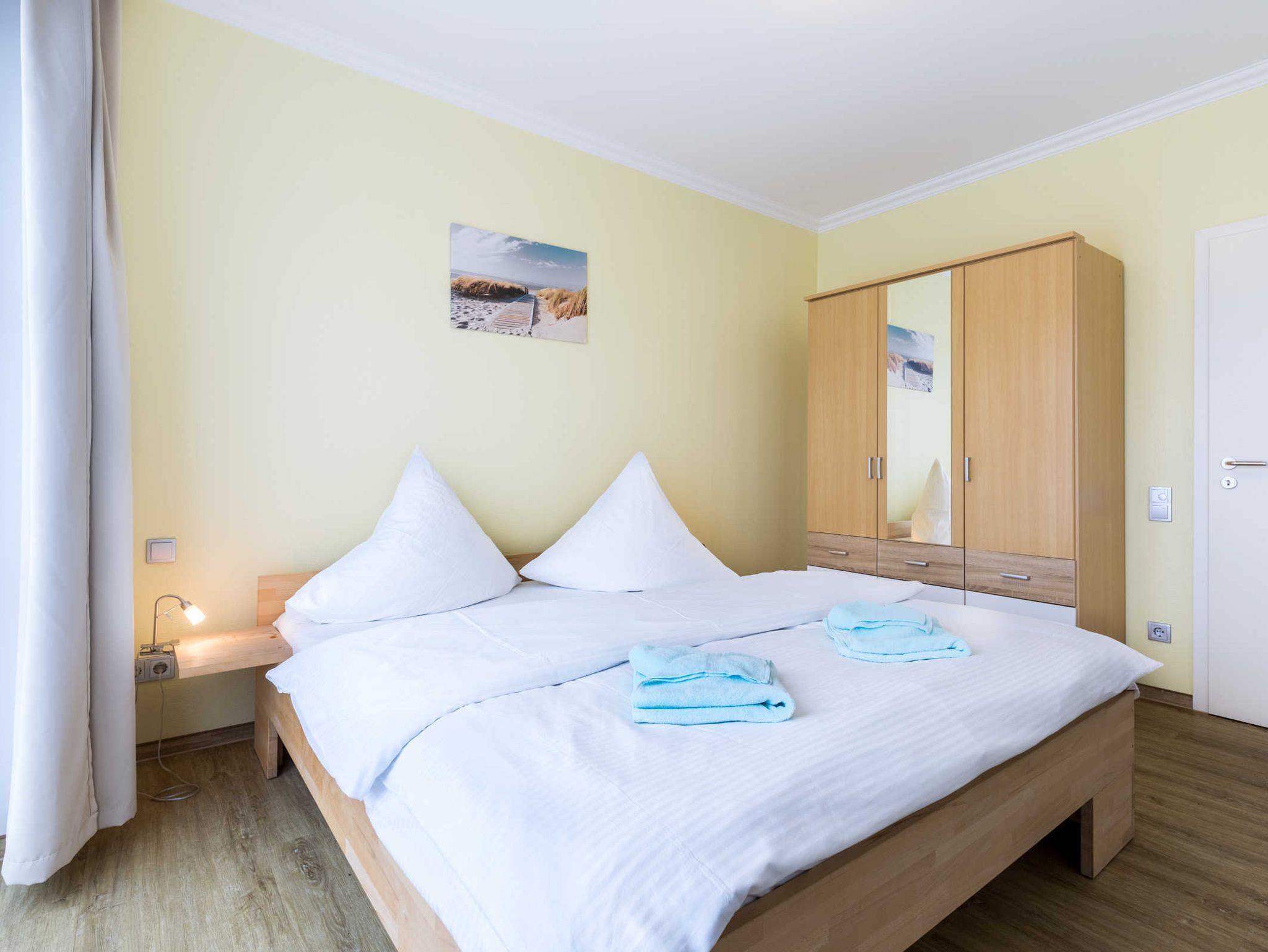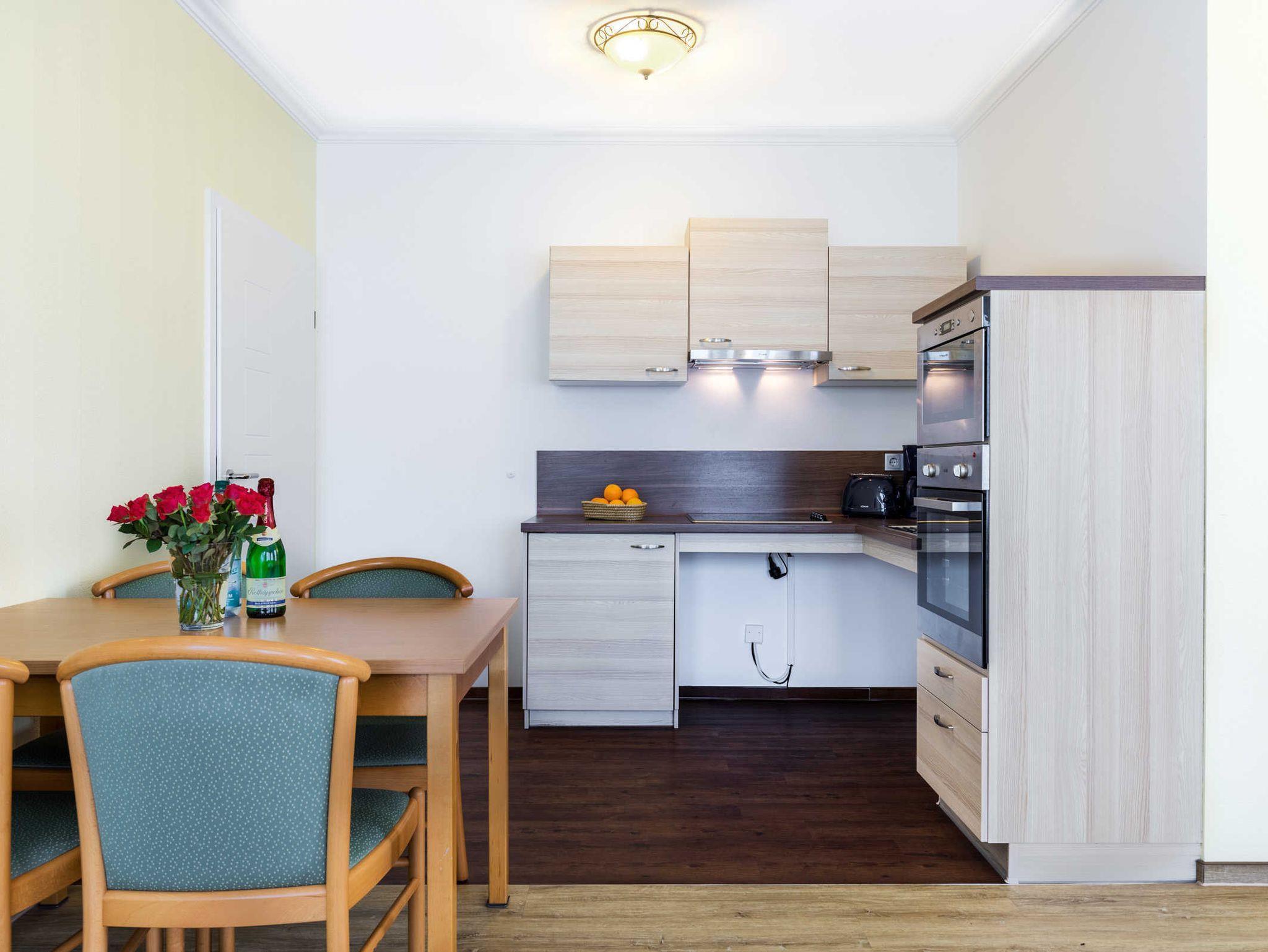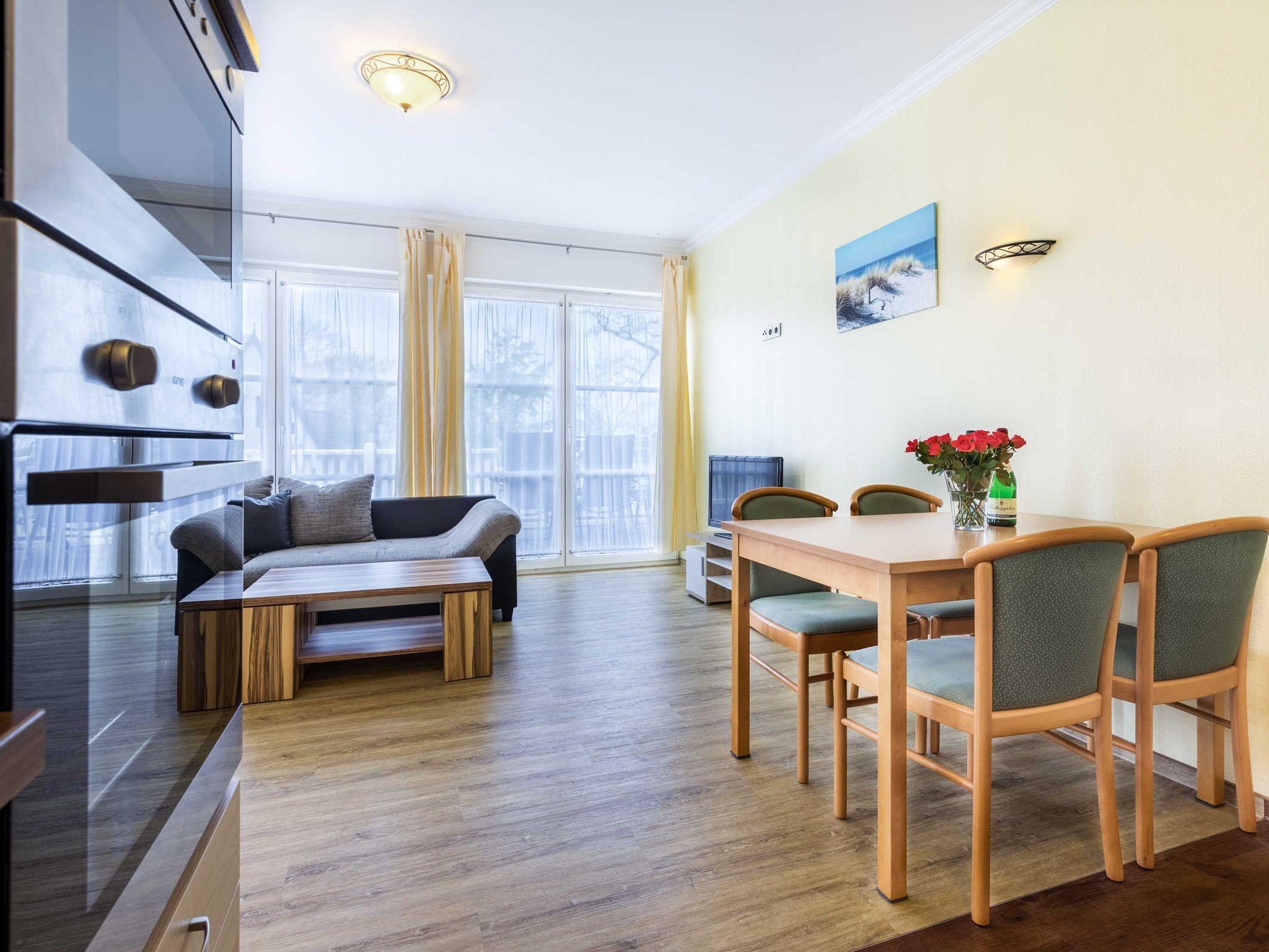 Die Ferienwohnung Barbara ist ganz und gar rollstuhlgrecht eingerichtet und bietet somit auch ein perfektes Feriendomizil für Rollifahrer. Die Ferienwohnung verfügt über zwei separate Schlafzimmer je mit Doppelbett und Kleiderschrank sowie einen komfortablen Wohn- und Essbereich mit unterfahrbarer Küchenzeile (Kühlschrank, Gefrierfach, Kaffeemaschine, Toaster, Wasserkocher). Der Esstisch sowie die Sitzecke mit bequemer Schlafcouch bieten ausreichend Platz zum Wohlfühlen. Aus dem Wohnzimmer gelangen Sie direkt auf die Holzterrasse mit dem Blick auf die Ferienanlage und in die grüne Salzhafflandschaft. Das Bad mit Dusche und WC ist barriefrei gestaltet.
