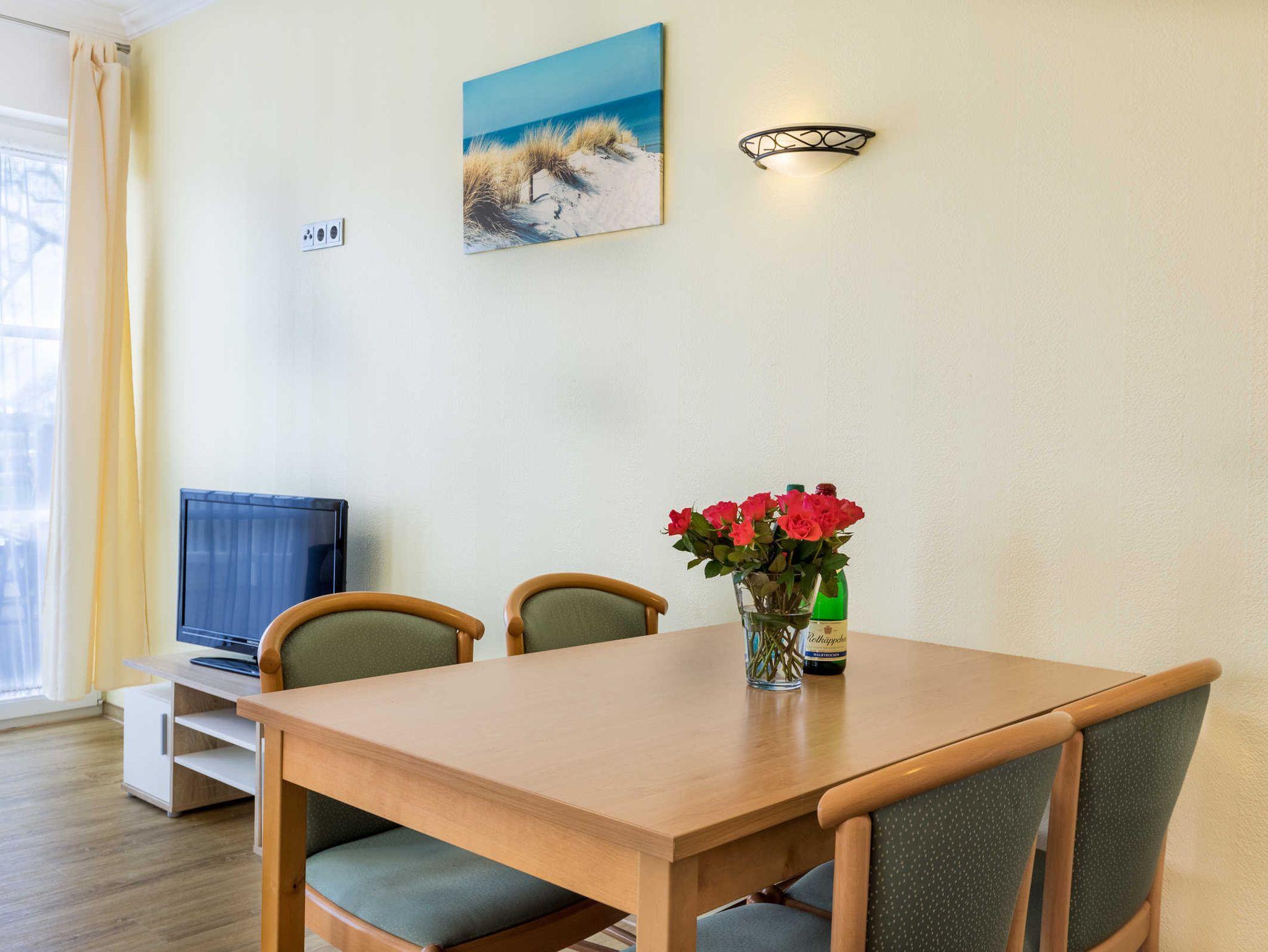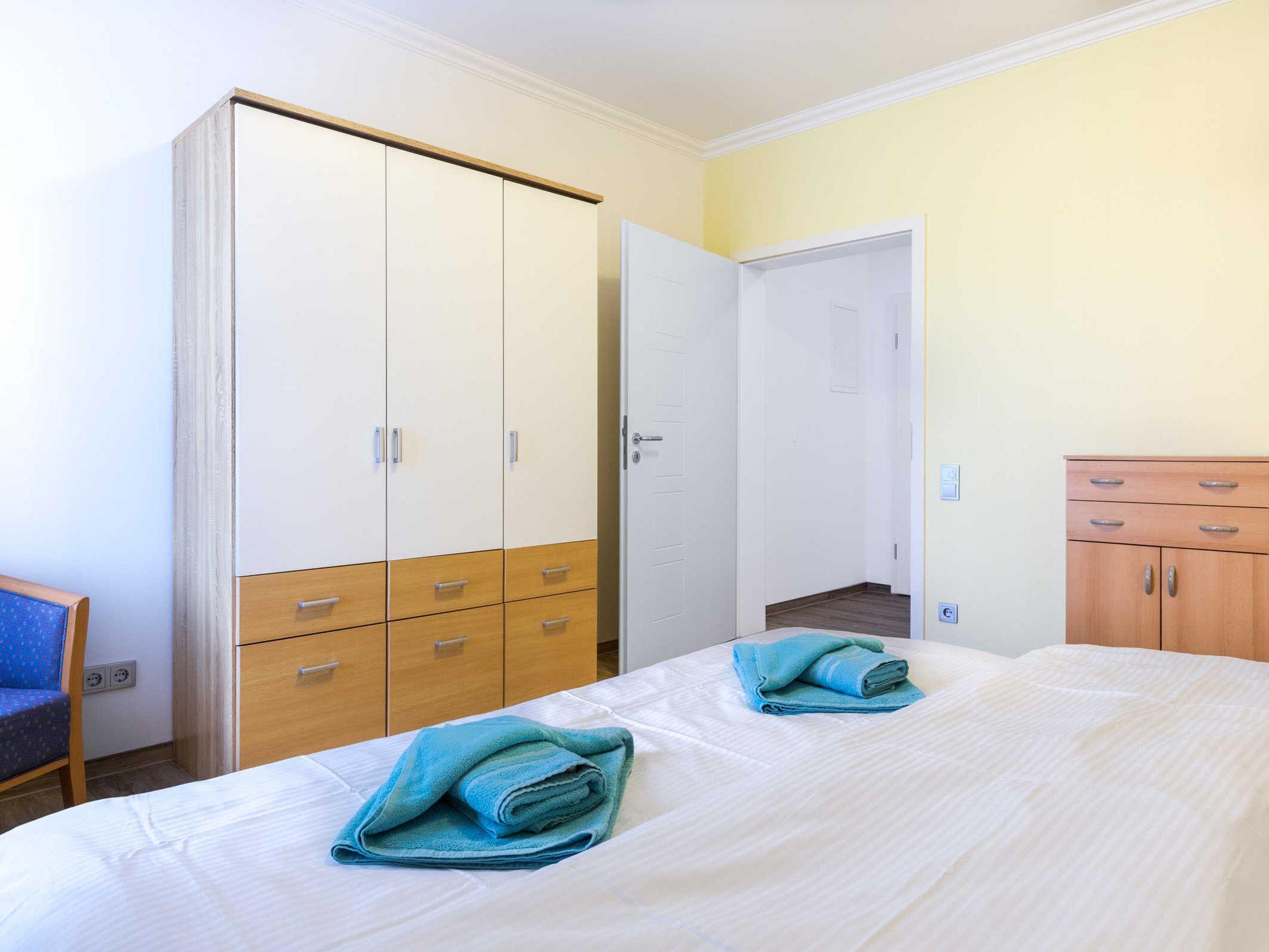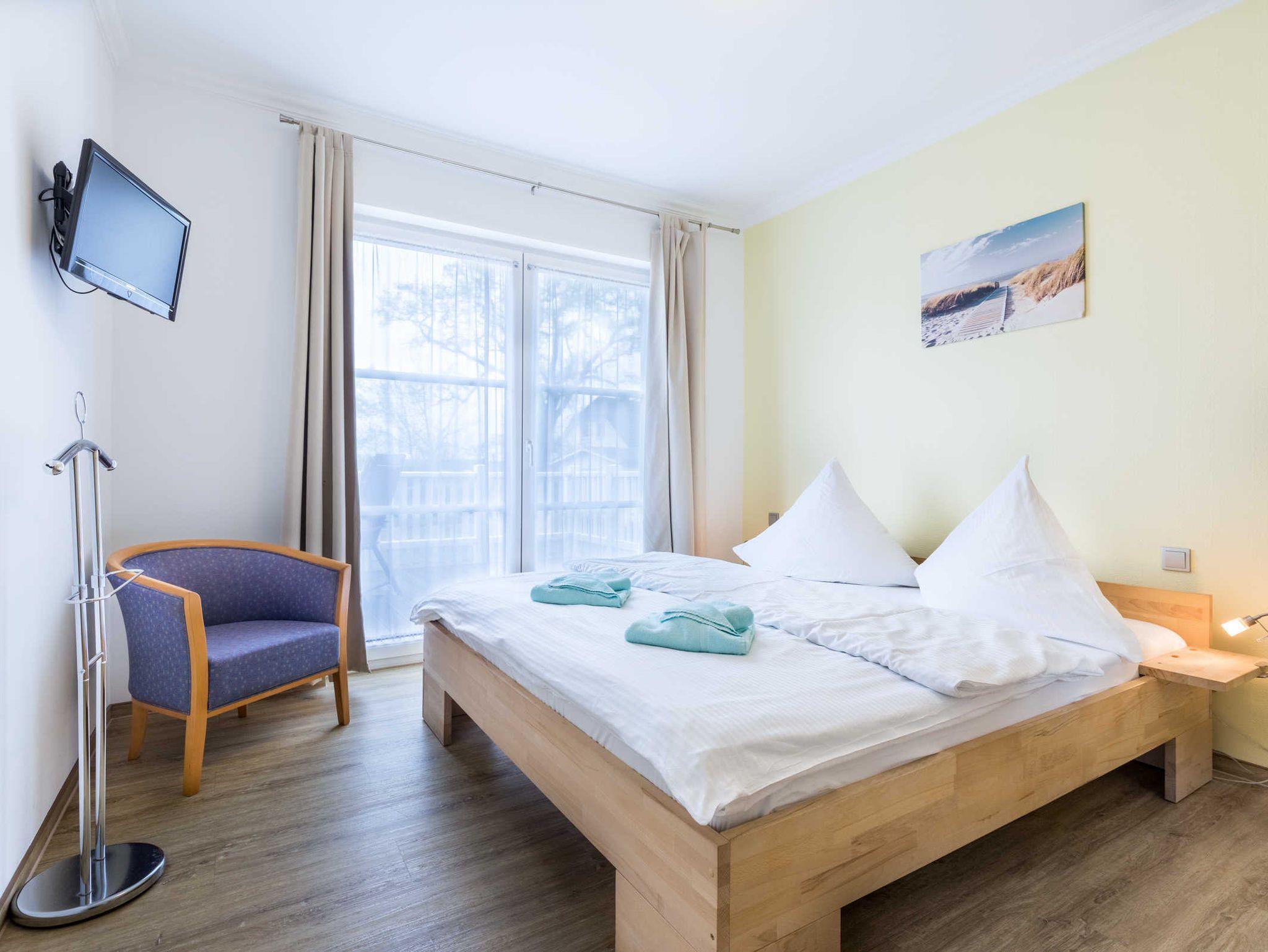 Die Ferienwohnung Barbara ist ganz und gar rollstuhlgrecht eingerichtet und bietet somit auch ein perfektes Feriendomizil für Rollifahrer. Die Ferienwohnung verfügt über zwei separate Schlafzimmer je mit Doppelbett und Kleiderschrank sowie einen komfortablen Wohn- und Essbereich mit unterfahrbarer Küchenzeile (Kühlschrank, Gefrierfach, Kaffeemaschine, Toaster, Wasserkocher). Der Esstisch sowie die Sitzecke mit bequemer Schlafcouch bieten ausreichend Platz zum Wohlfühlen. Aus dem Wohnzimmer gelangen Sie direkt auf die Holzterrasse mit dem Blick auf die Ferienanlage und in die grüne Salzhafflandschaft. Das Bad mit Dusche und WC ist barriefrei gestaltet.