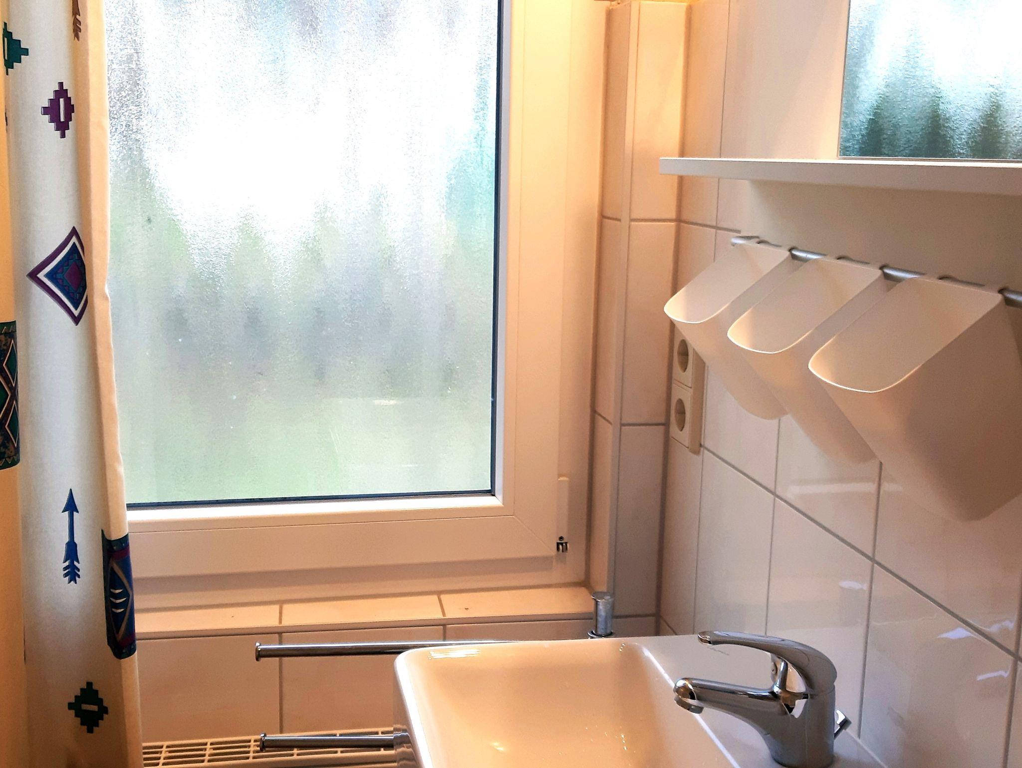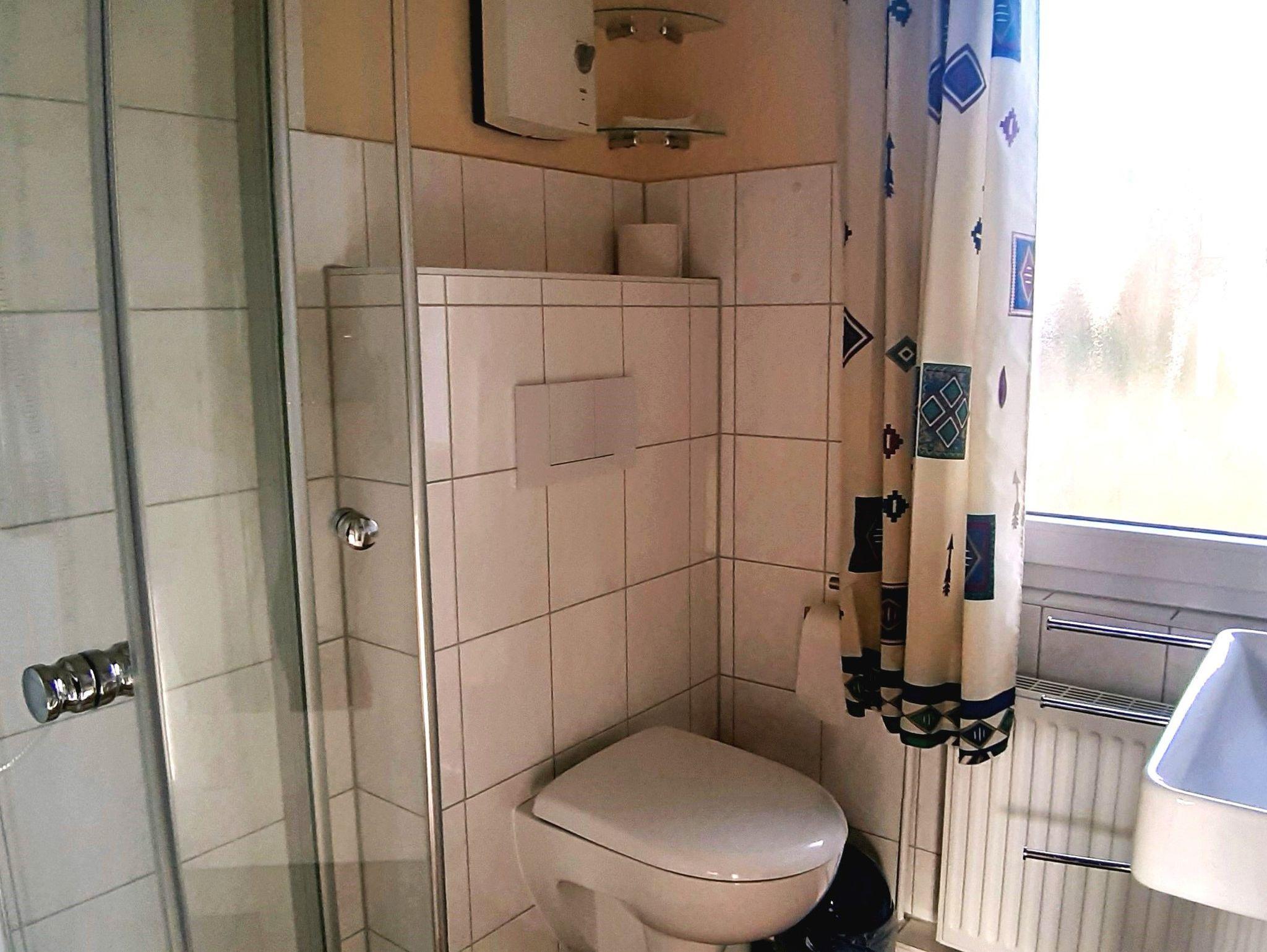 Das Bad ist mit Dusche, WC, Waschbecken und Spiegel ausgestattet.