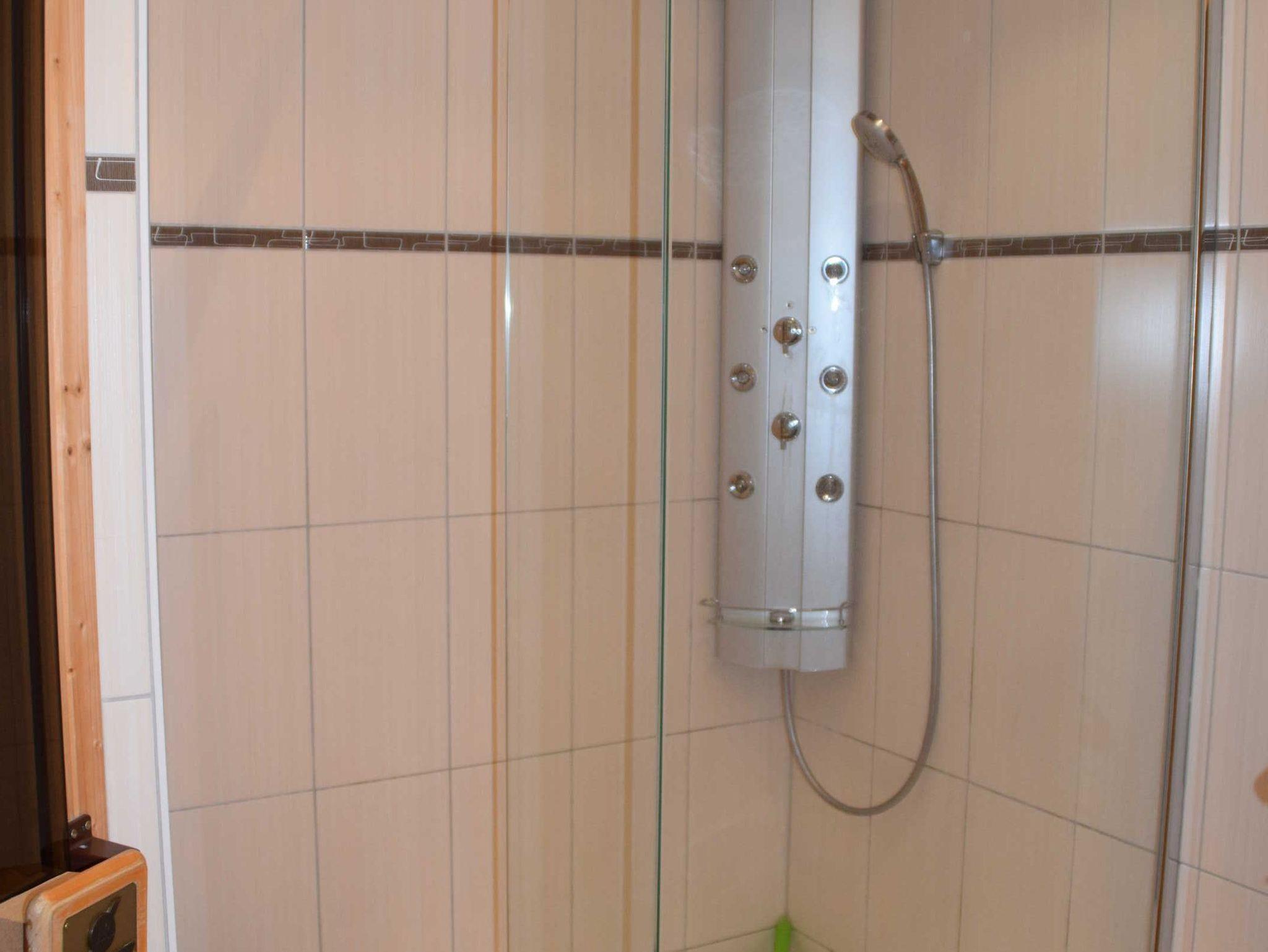 Im EG befindet sich ein Duschbad mit Sauna und die Küche mit Wohn -und Essbereich und einem Kamin.