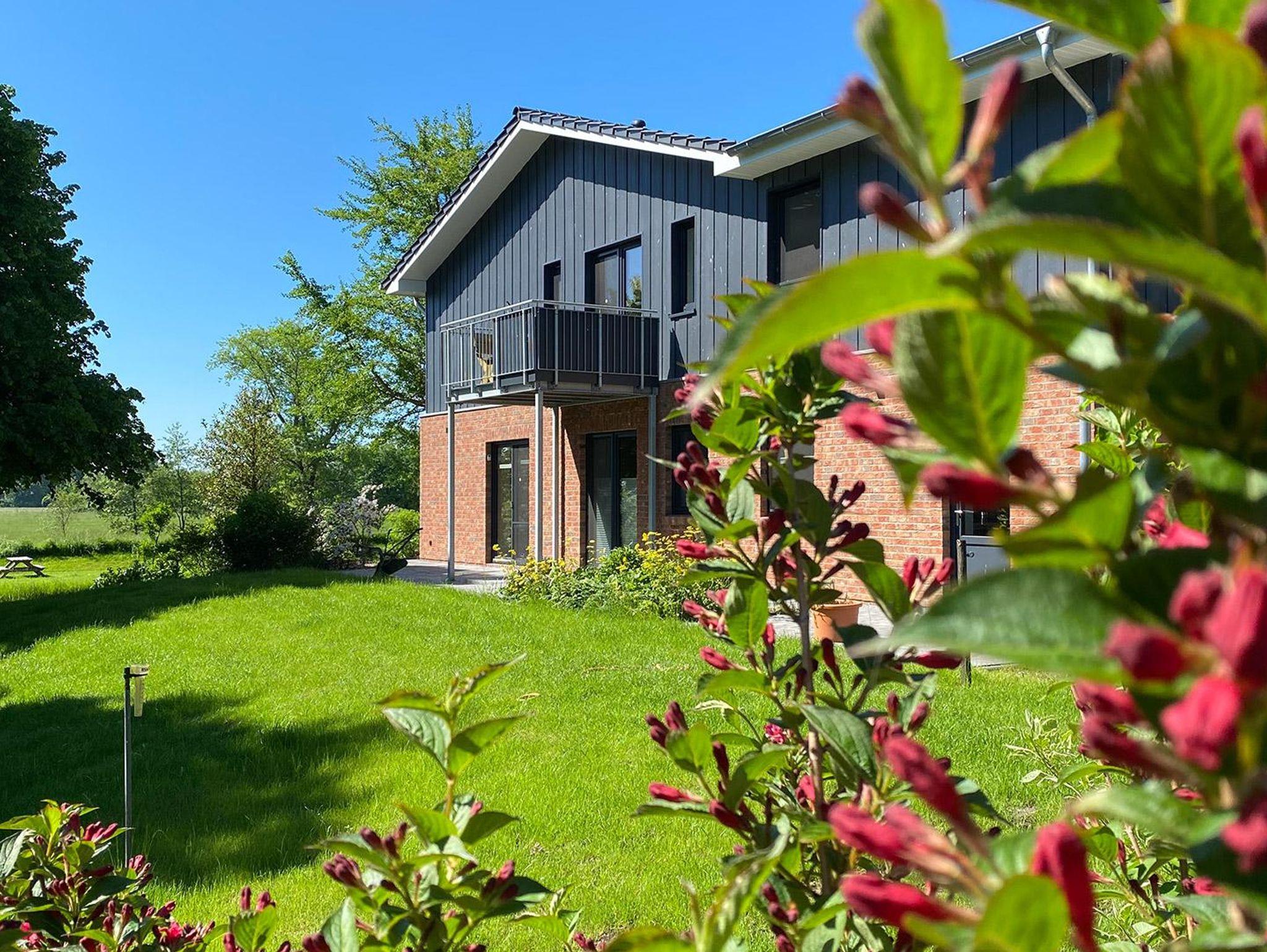 Modernes Ferienhaus am Seerosenhof bei Poppenbüll mit Balkon, Gartenblick und komfortabler Ausstattung für erholsame Nordseeurlaube.