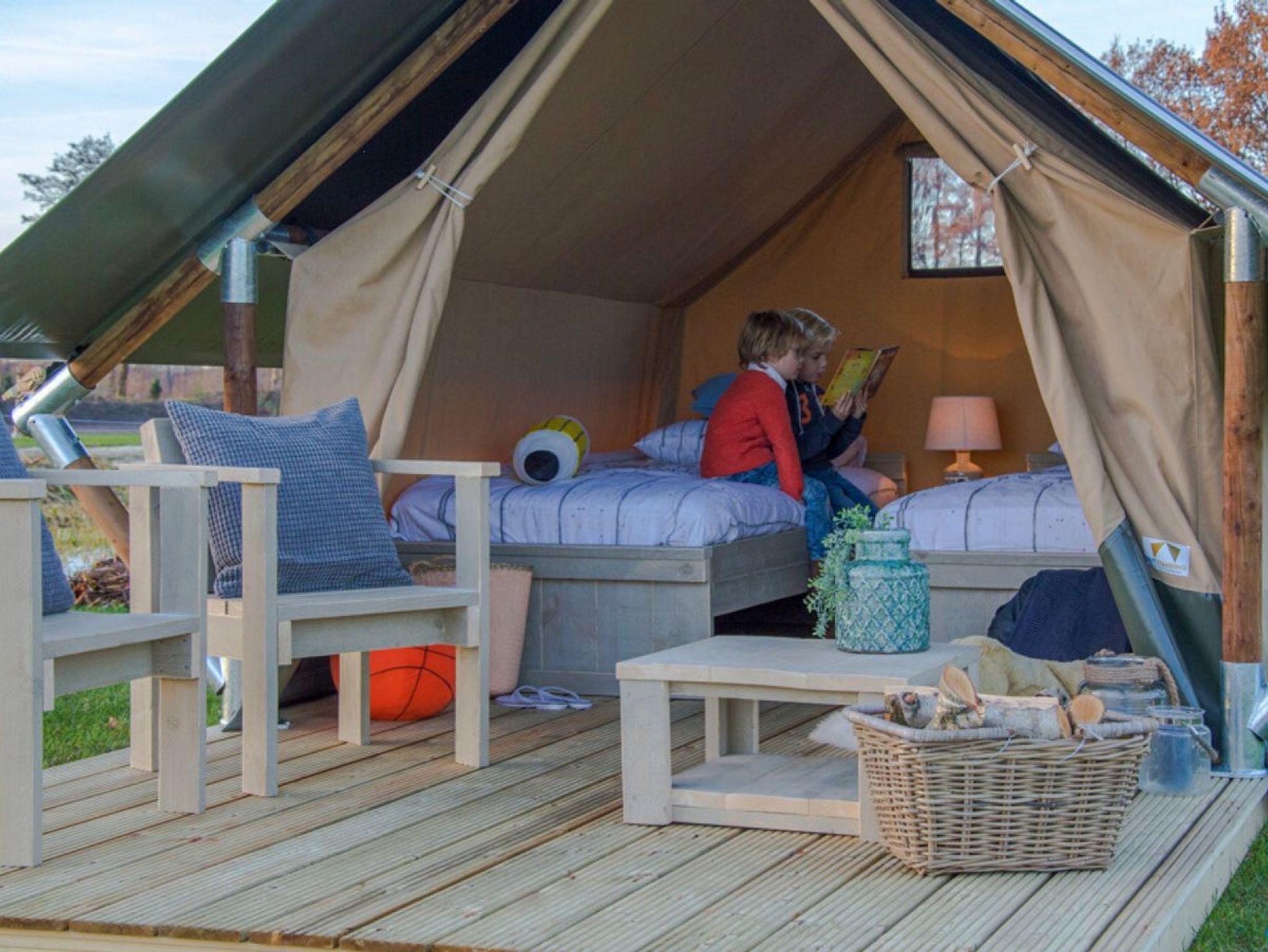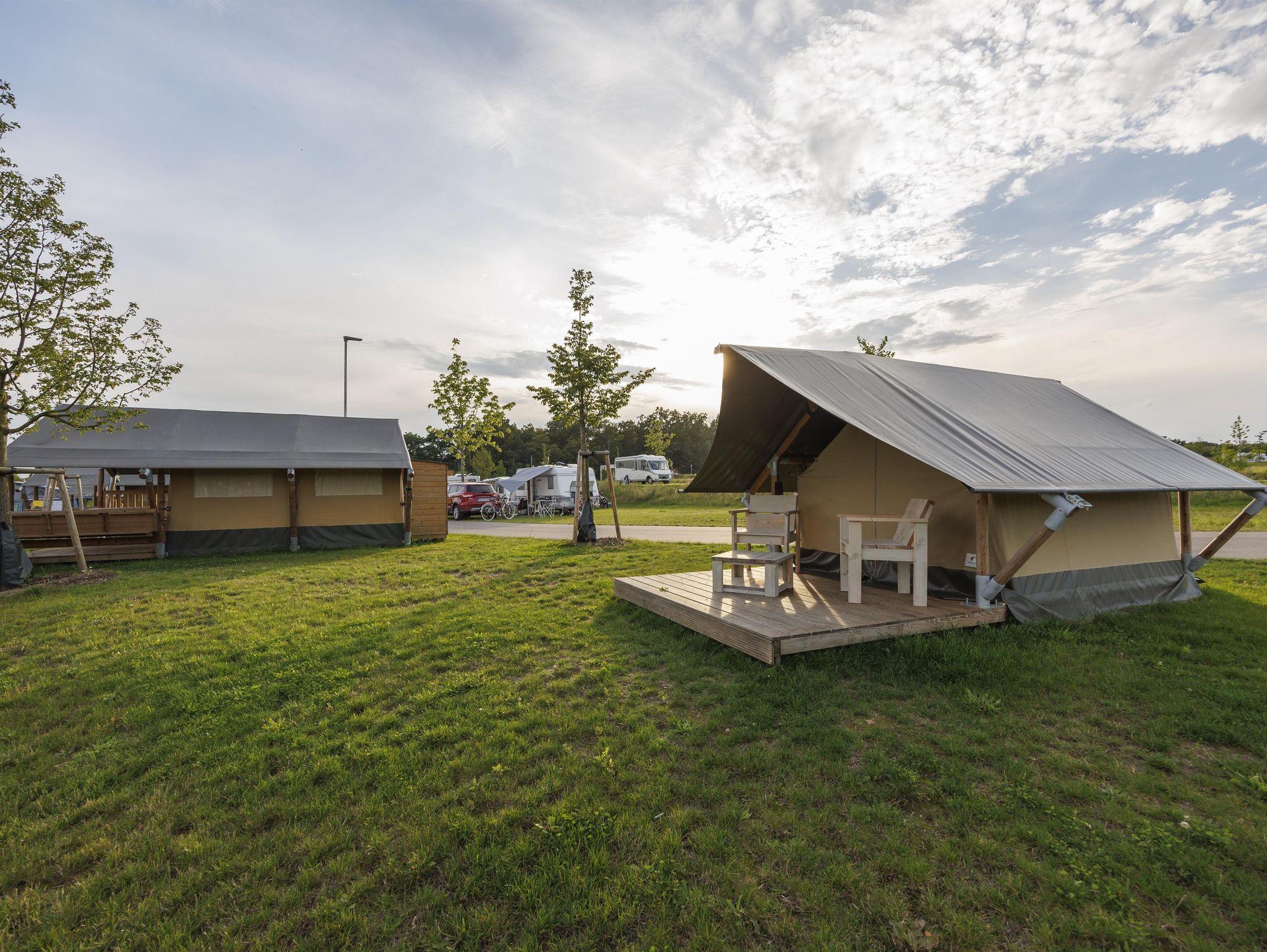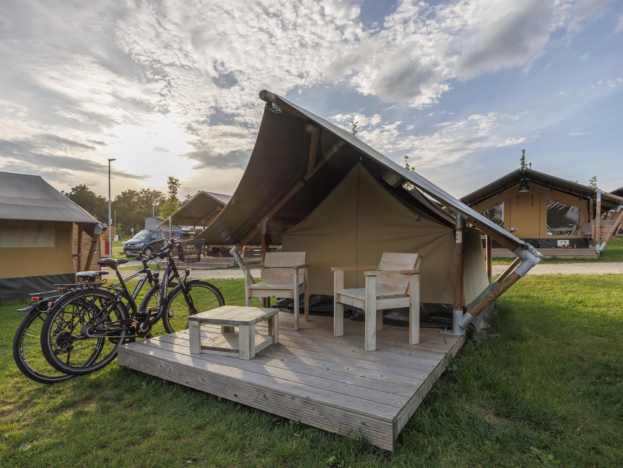 • Alle Glampingzelte wurden 2020 neu gebaut und sind wie folgt ausgestattet: Betten, Nachtschrank, Sitzecke draußen