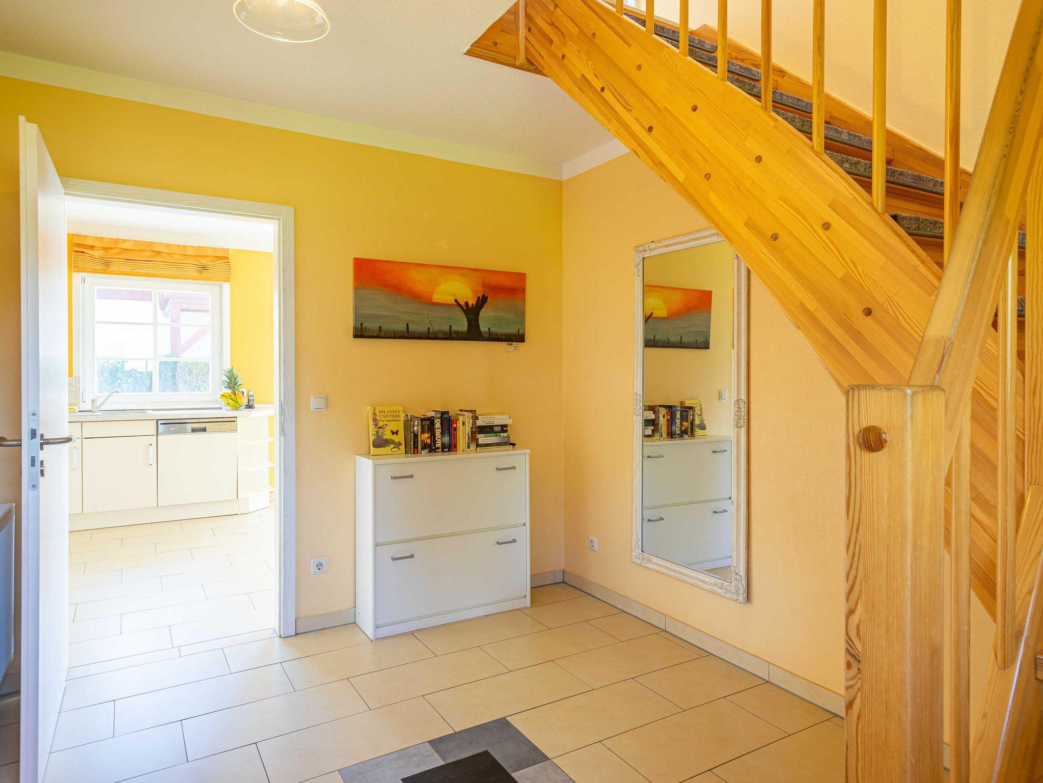 Im Erdgeschoß befindet sich ein 30 qm großer, sonnendurchfluteter Wohnbereich mit integrierter Küche und Essecke. Komfortable Küchenausstattung, bestehend aus: Ceran-Herd mit Backofen- Geschirrspüler- Kaminhaube- Kühlschrank (150 l Kühlraum)- Gefrierfach (44 l)- Geschirrspüler, ein 300° Panoramakamin, eine komplette Mediaeinrichtung bestehend aus: - LCD TV ? SAT Anlage - Stereoanlage - DVD?Player - Telefonflatrate, kostenloser Internetzugang (WLAN), ein Sanitärraum mit Duschkabine und WC, eine Sauna mit Farblichtgerät, ein Hauswirtschaftraum mit Waschmaschine und Trockner, eine 30 qm große Terrasse mit Gartenmöbeln und Strandkorb, Zugang vom Wohnbereich aus , Gartenhaus, Im Obergeschoß, erreichbar über eine Innentreppe, befinden sich: ein 15 qm großes Schlafzimmer mit Doppelbett, ein 14 qm großes Schlafzimmer mit Doppelbett, ein 13,5 qm großes Schlafzimmer mit 2 Einzelbetten, ein Sanitärraum mit Duschkabine und WC und Badewanne, Entfernungen: Strand: 2200 m, Einkaufsmöglichkeit: 1300 m, Bäcker: 1000 m, Post: 1300 m, Sparkasse: 1000 m, Fahrradverleih: 270 m, Gaststätte:270 , Arzt: 1500 m, Apotheke: 1550 m, Schwimmmöglichkeit 1600 m, Spaßbad 38 km, Barth: 19 km, Ribnitz: 38 km, Rostock: 62 km, Stralsund: 52 km. Ein Kinderreisebett und ein Hochstuhl sind vorhanden. Eine Grundausstattung Handtücher sowie die Bettwäsche sind im Preis enthalten. Hinweis: Es wird nicht für die einwandfreie Funktion des Gerätes sowie die Leistung des Providers gehaftet. Schadensersatzansprüche wegen fehlender Verbindungen o.ä. sind ausgeschlossen. Der Mieter ist verantwortlich für seine Aktivitäten im Internet. Der Provider speichert die Verbindungsdaten bis zu 6 Monaten, so dass ein etwaiger Aufruf Strafrechtlich relevanter Seiten nachvollziehbar ist.