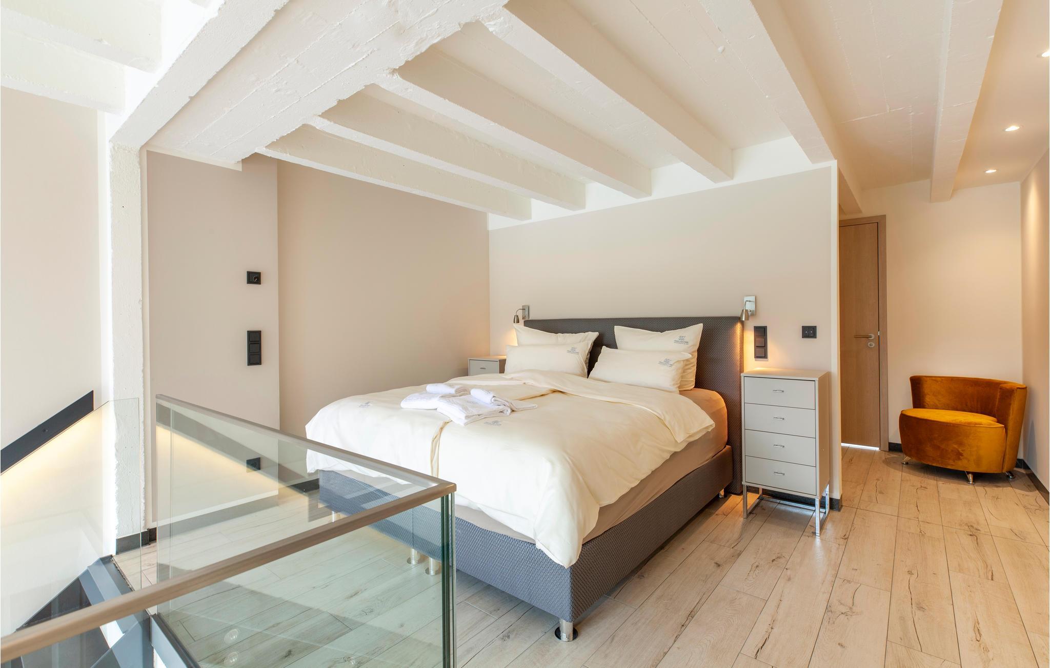 Das hochwertige "Avida Loft" überzeugt durch elegantes und außergewöhnliches Design auf zwei Ebenen im 3. und 4. Obergeschoss. Durch die riesigen, elektrischen Panoramafenster sowie die Bauweise mit viel Glas ist die loftartige Wohnung sehr hell und lichtdurchflutet. Alle Bereiche sind miteinander verbunden, so wird ein offenes Raumgefühl geschaffen. Im Obergeschoss, der über eine Treppe zugänglich ist, befindet sich der offene Schlaf- und Ankleidebereich. Genießen Sie hier den Blick auf die Ostsee direkt vom Bett aus. Das hochwertige Boxspringbett mit sehr bequemen Matratzen lässt Sie herrlich ausgeruht den Tag beginnen. Im Wohnbereich lässt sich das Sofa in einen zusätzlichen Schlafplatz umwandeln. Die kleine Pantry-Küche verfügt über einen Geschirrspüler und für Kaffeeliebhaber eine Tassimo-Kapselmaschine (Kapseln bitte selbst mitbringen).