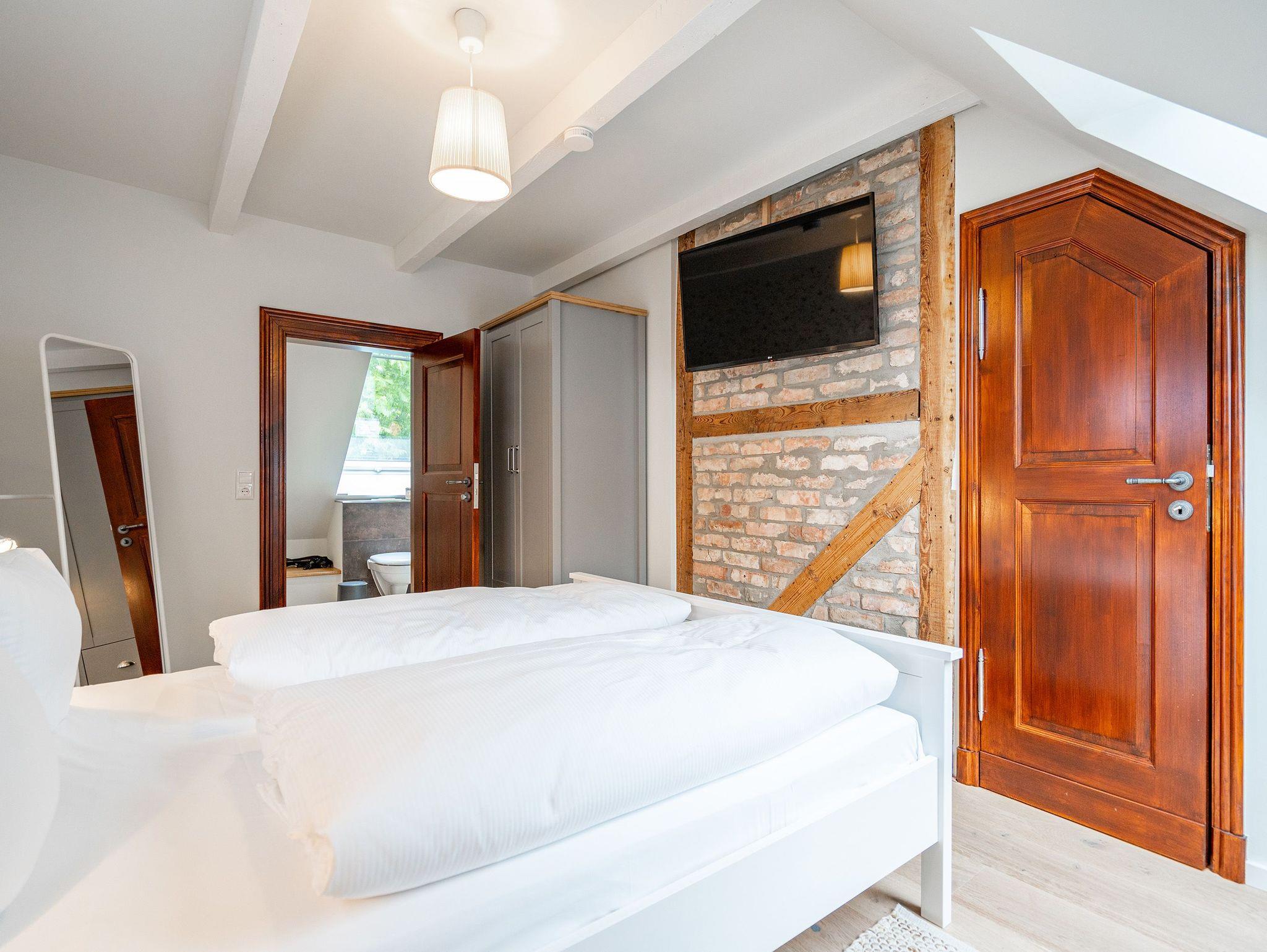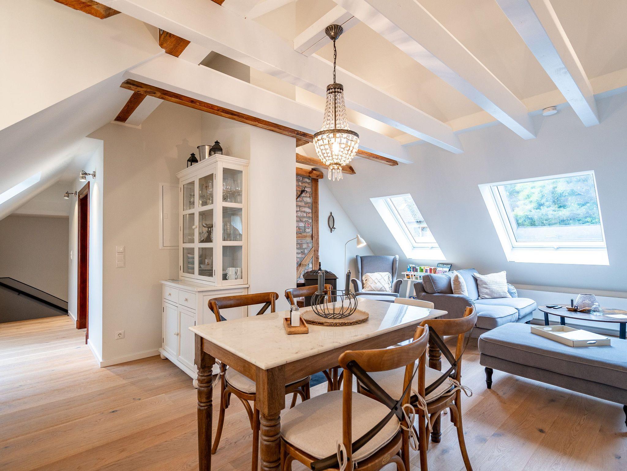Mit viel Charme und Gemütlichkeit empfängt Sie das Appartement 01 im Alten Tagelöhner Haus in Pudagla. Über eine Treppe gelangen Sie in das Obergeschoss des 1915 erbauten Hauses, wo sich das 75 Quadratmeter große Appartement befindet. Hinter Ihrem Flur mit Garderobe finden Sie den offenen Wohn-Essbereich. Alte Holzbalken, Dachschrägen und freigelegte Mauerwerke sorgen direkt für ein heimeliges Gefühl. Ein Esstisch mit Marmorplatte und Platz für bis zu 5 Personen sowie liebevolle Details aus einer einst vergangenen Zeit, wie ein alter Kronleuchter, sind die perfekte Ergänzung für das Appartement im Landhausstil. Hier darf ein Holzkamin auf gar keinen Fall fehlen, vor dem Sie es sich an Ihren Abenden gemütlich machen können. Zwei Sofas und ein Sessel mit Hocker sowie ein 55-Zoll Flat-TV und ein Radio mit Bluetooth laden zudem zum entspannten Verweilen ein. Die voll ausgestattete Landhausküche mit Cerankochfeld, Backofen, Kühlschrank mit Gefrierfach sowie diverse Kleinküchengeräte lässt keine Wünsche beim Zubereiten Ihrer Speisen offen. Bis zu vier Personen und zwei Kleinkinder (im Kinderreisebett bis 3 Jahre) finden in den beiden Schlafzimmern mit Doppelbetten (1,60m x 2,00m) Platz und erholsamen Schlaf. Flat-TVs und ausreichend Schrankraum für Ihre Urlaubsgarderobe runden die Schlafbereiche ab. Eine morgendliche Regendusche können Sie im innenliegenden Badezimmer mit Waschtisch und WC genießen, welches einen direkten Zugang von einem Schlafzimmer aus hat. Ein Highlight ist der Zugang zum Schmollensee, den Sie auch mit einem bereitgestellten Kanu für bis zu 3 Personen erkunden können. Von Oktober bis April erhaschen Sie zudem von Ihrer Küche und Ihrem Badezimmer aus einen Blick auf den naturbelassenen See. Auch auf der überdachten und 12 Quadratmeter großen Südwest-Terrasse können Sie Ihre Zeit verbringen. Ein Grill steht Ihnen ebenfalls zur freien Verfügung. Das umzäunte Gelände eignet sich ideal für Familien mit Kindern. Bei Ihrer Anreise steht Ihnen ein PKW-Stellplatz sowie Fahrradstellplätze am Haus zur Verfügung. Außerdem sind die Betten bereits bezogen und Handtücher liegen für Sie bereit. Ab Juli 2025 steht Ihnen hinter dem Haus ein eigener Tennisplatz (Kunstrasen mit Quarzsand) zur Verfügung ? ideal für alle, die auch im Urlaub aktiv bleiben möchten. Der Platz kann wochenweise dazugebucht werden.