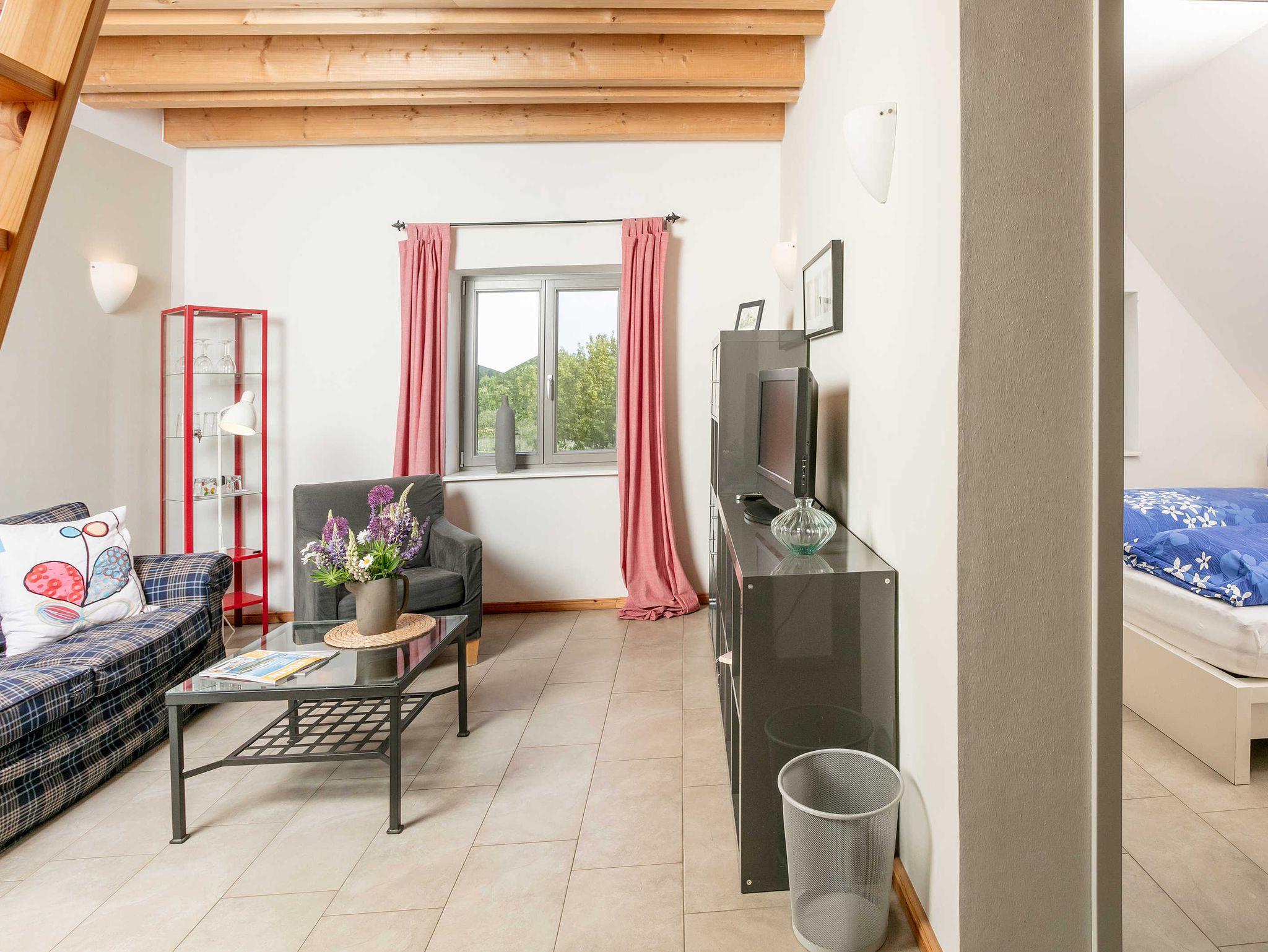 Separater Eingang, kleiner Flur, Wohn-/Eßzimmer mit gemütlicher Sitzecke, SAT-TV, integrierter Küchenzeile mit diverser Ausstattung, Bad mit Dusche/WC/Waschbecken, 1 Schlafzimmer mit Doppelbett und über eine kleine steile Treppe ist der Spitzboden mit einem weiteren Schlafzimmer (Doppelbett) erreichbar. Die Wohnungen haben alle Fußbodenheizung.
