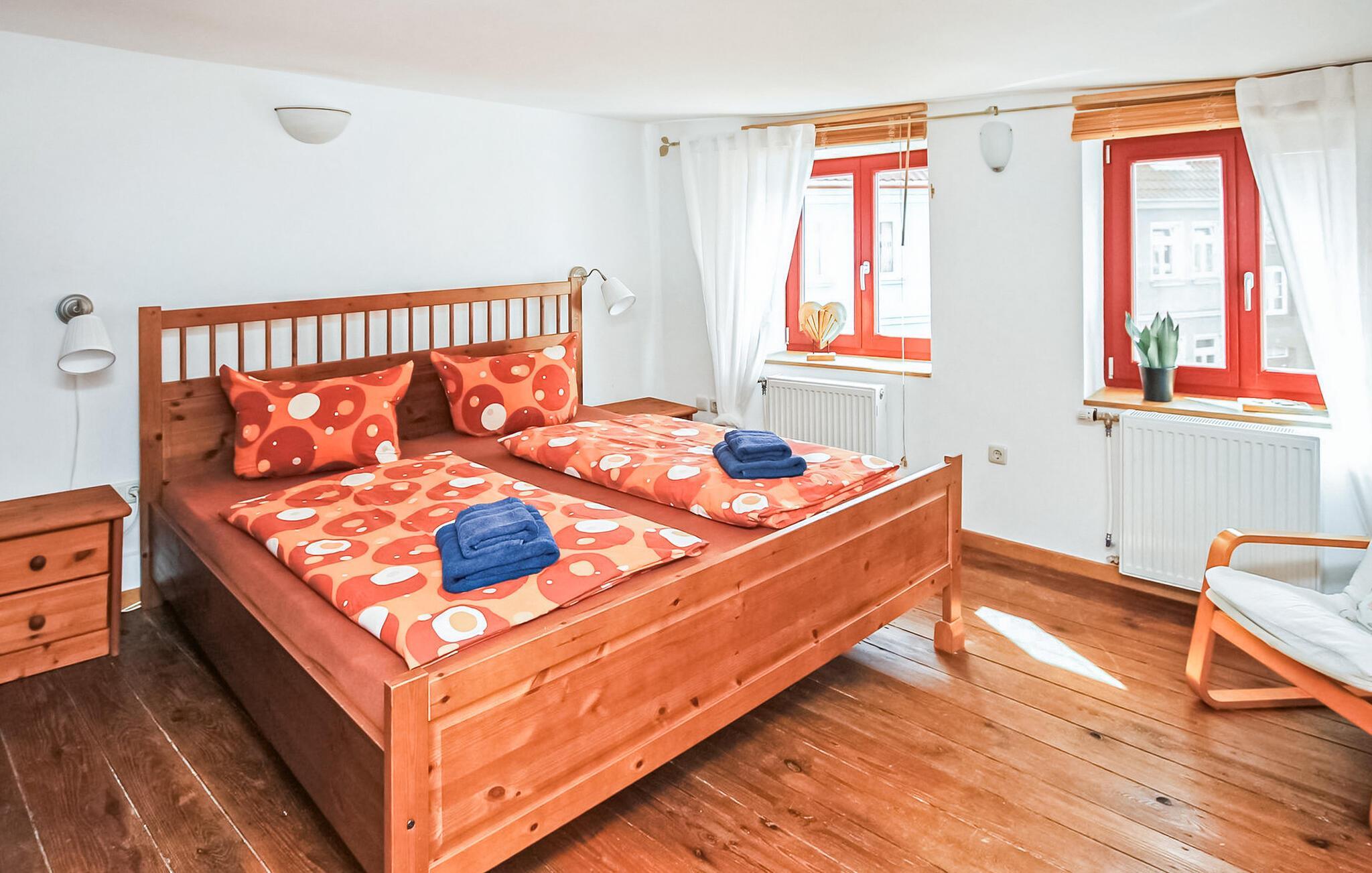 Die ca. 65 qm große Wohnung für bis zu 3 Personen befindet sich im Obergeschoss (erreichbar über Treppe, BEACHTEN ? z.T. sehr NIEDRIGE Deckenhöhen zwischen 1,90 und 2,10 m!) und verfügt über einen Wohnraum (Essbereich, Flachbild-TV, Radio, Kaminofen), ein Schlafzimmer (Doppelbett, von hier Zugang in ein kleines Separee mit Sofa), ein zweites Schlafzimmer (Einzelbett), eine separate Küche (E-Herd mit Backofen, Kühlschrank mit Gefriermöglichkeit, Wasserkocher, Kaffeemaschine, Toaster, Eierkocher, von hier Durchgang zum Bad) und ein Bad (Dusche, WC, Fön, kleiner Extraraum mit Schrank). Dieses Nichtraucherapartment ist zentral beheizt und verfügt über Insektenschutz an den Fenstern. Es gibt auch kostenloses WLAN und einen Kamin.