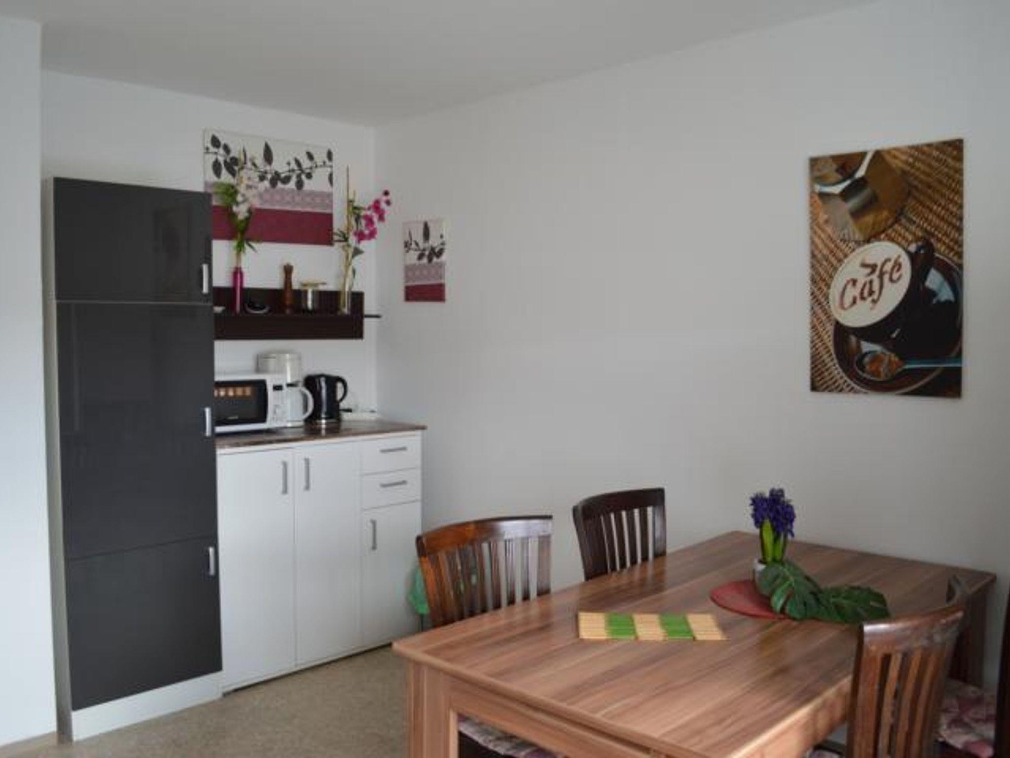 Die Küche ist im Wohnbereich integriert. Die Küche ist modern und komplett ausgestattet (E-Herd, Backofen, Wasserkocher, Kaffeemaschine, Kühlschrank, Mikrowelle Geschirr, Besteck und viele weitere Küchenutensilien). Das Wohnzimmer ist mit einem Sofa und einem Esstisch ausgestattet.