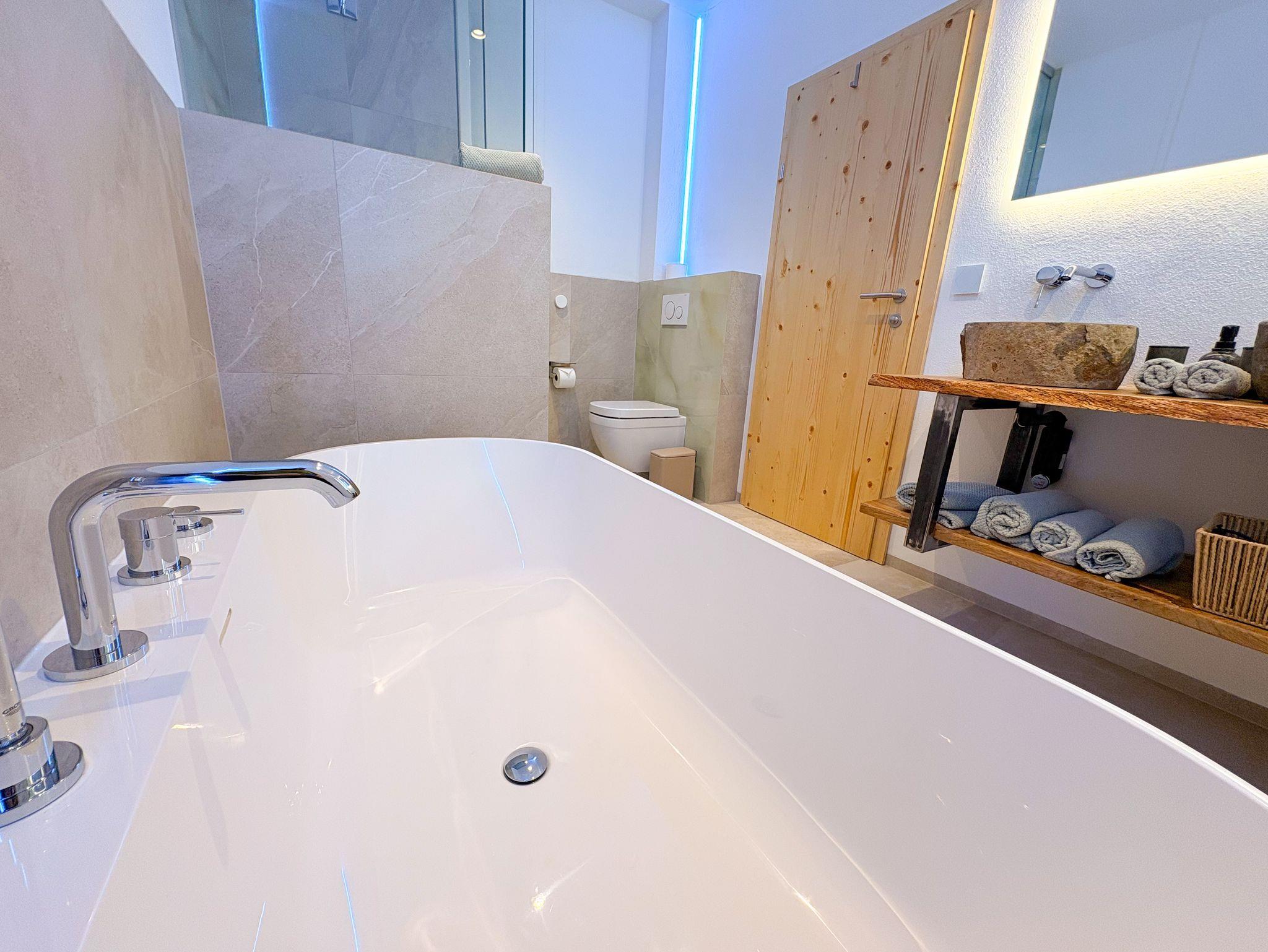 Wohlfühl-Bad: Das großzügige Badezimmer ist Ihre private Erholungs-Oase. Eine ebenerdige Dusche, eine Designer-Badewanne und Waschbecken, die Ihnen ein Lächeln ins Gesicht zaubern, werden von einer stimmungsvollen Lichtkulisse untermalt.