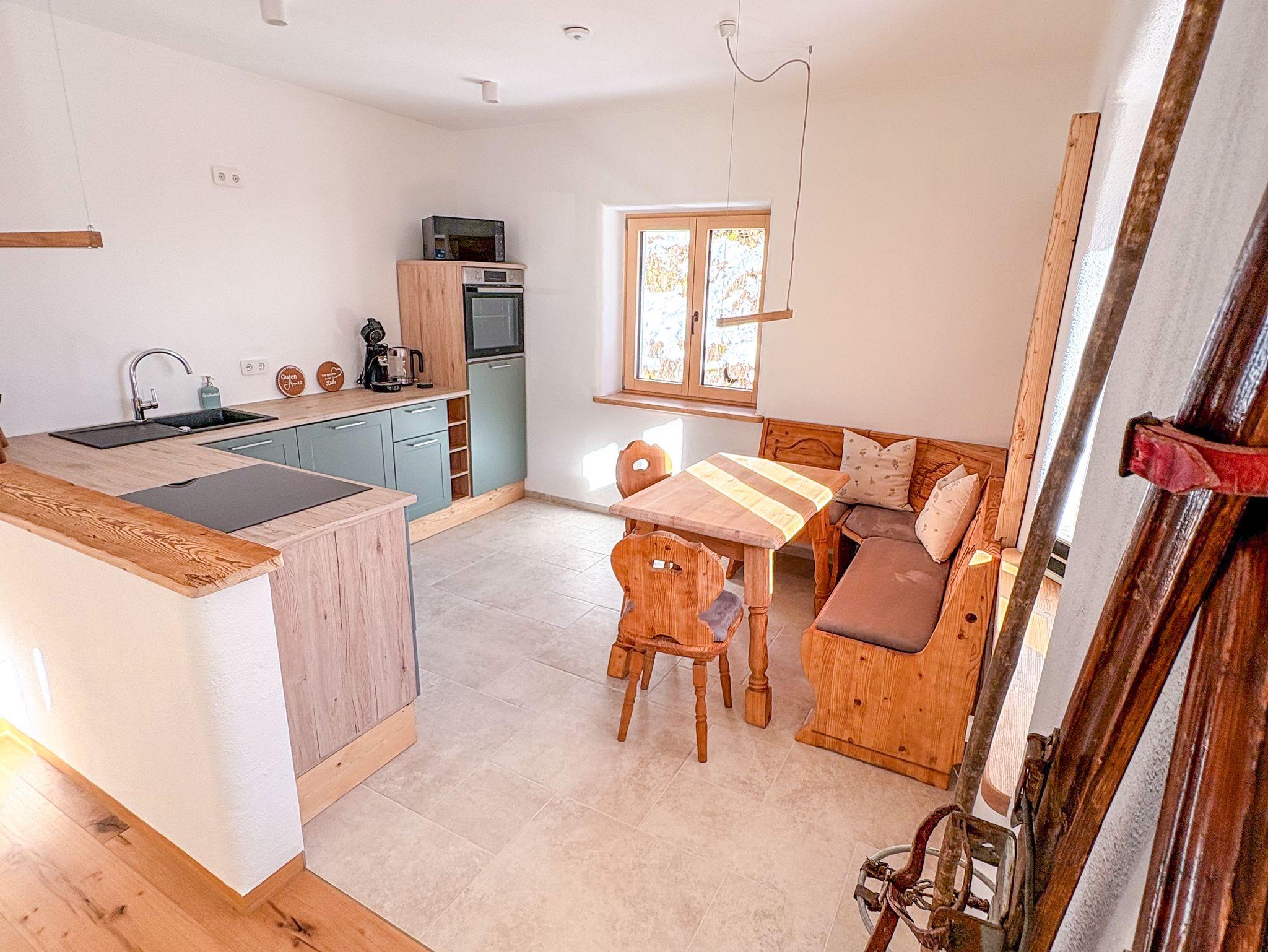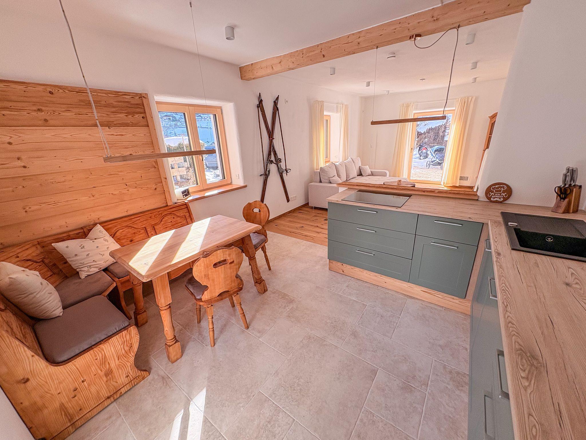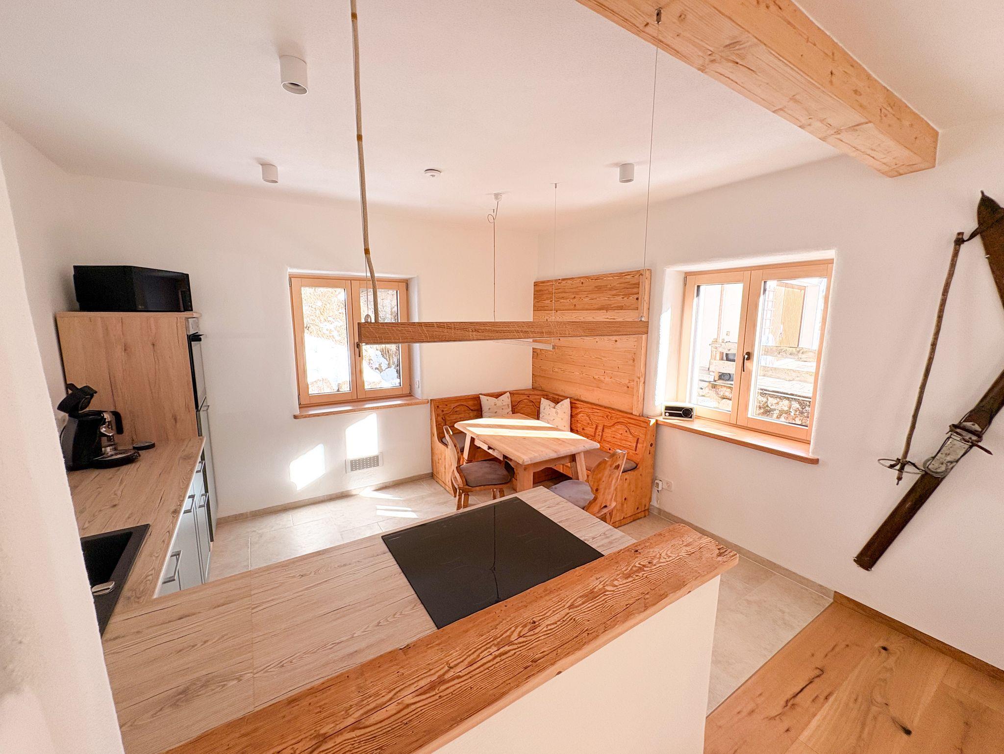 Wohnen & Genießen: Der offene Wohn- und Essbereich besticht durch hochwertige Altholz-Elemente, Smart-TV und eine brandneue Design-Küche. Vom Induktionsherd bis zur Mikrowelle ist alles bereit für Ihre Kulinarik-Momente.