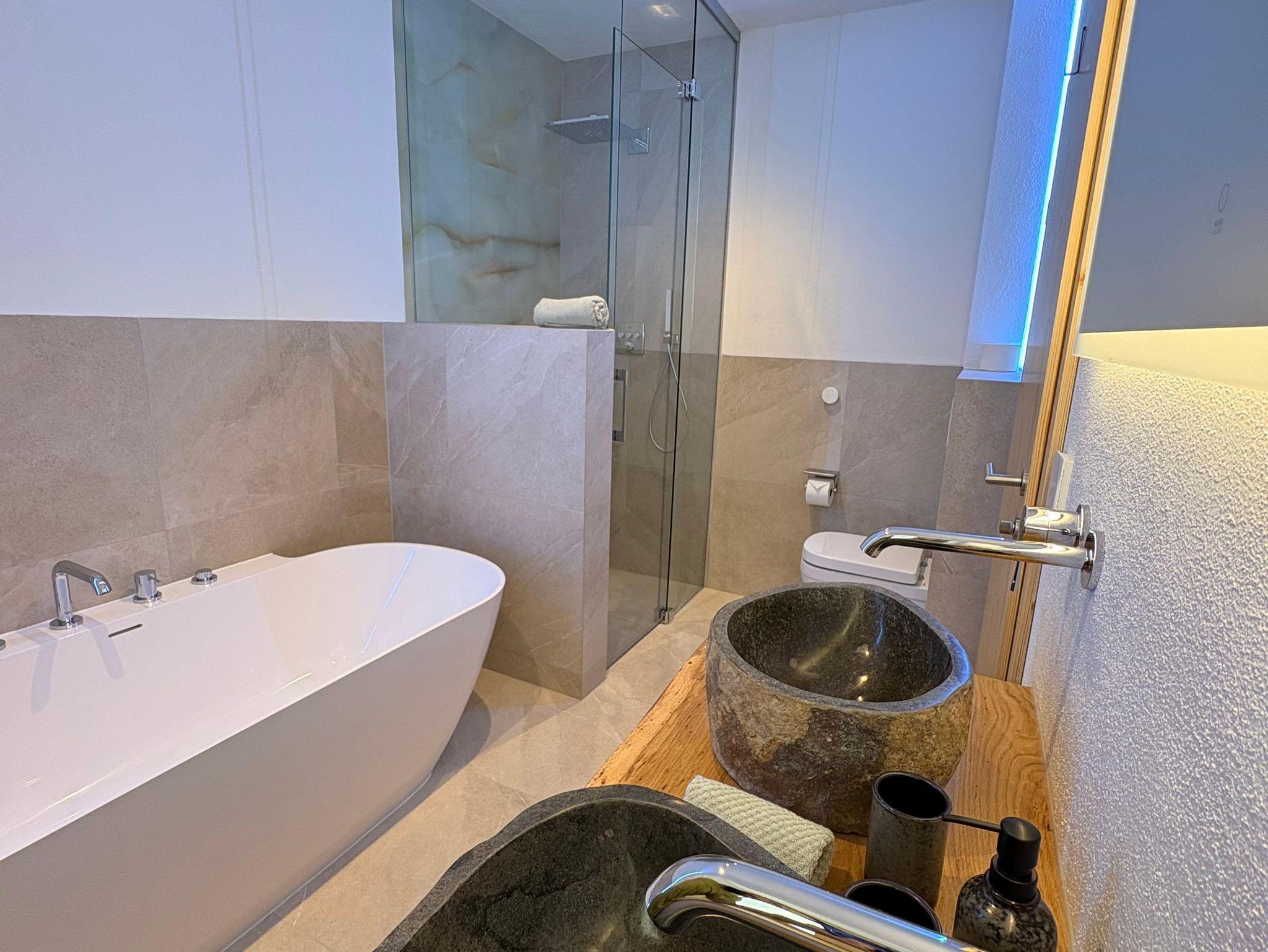 Wellness-Bad: Das großzügige Badezimmer ist Ihre private Spa-Oase. Eine ebenerdige Dusche, eine Designer-Badewanne und Waschbecken, die Ihnen ein Lächeln ins Gesicht zaubern, werden von einer stimmungsvollen Lichtkulisse untermalt.