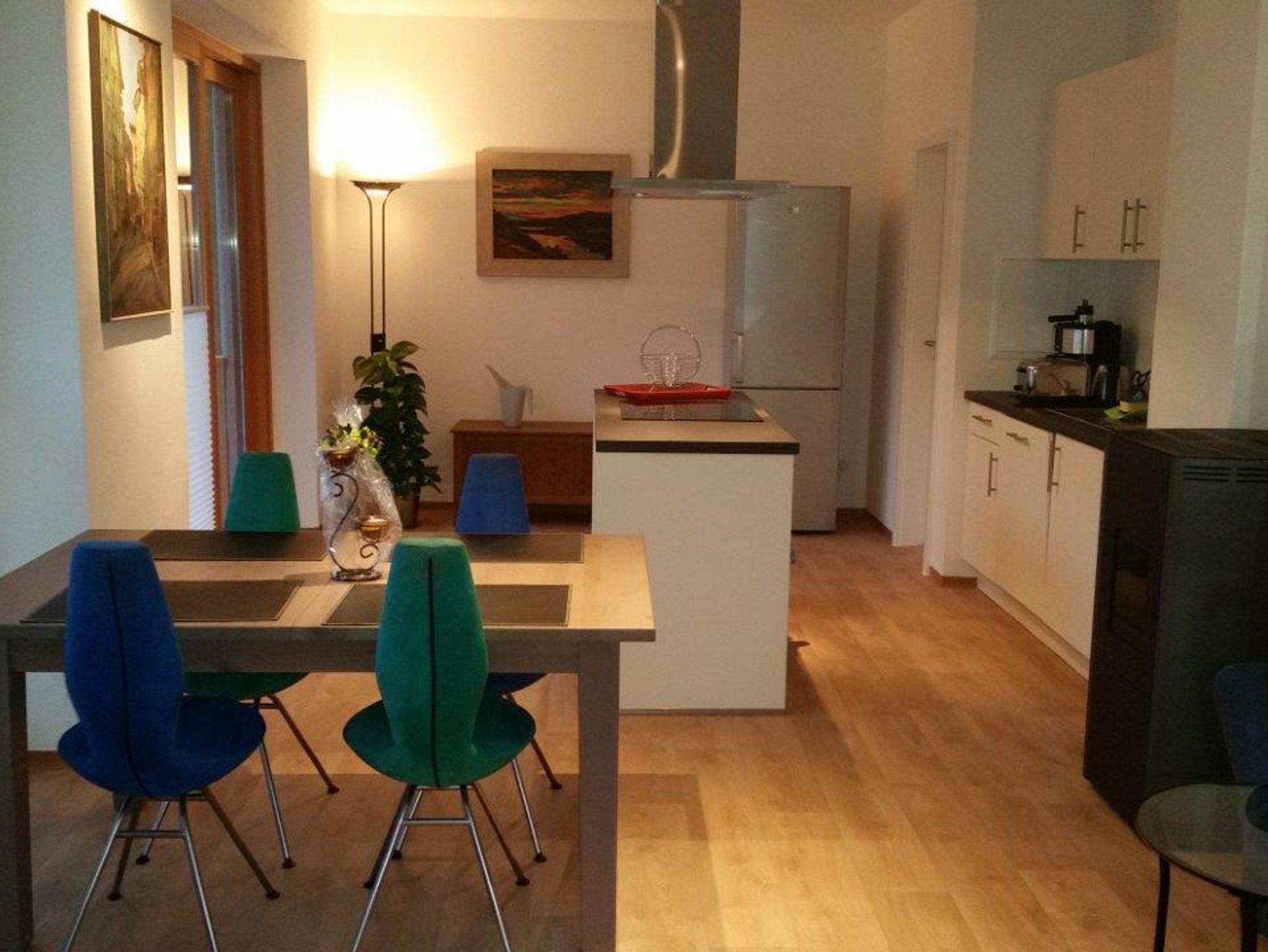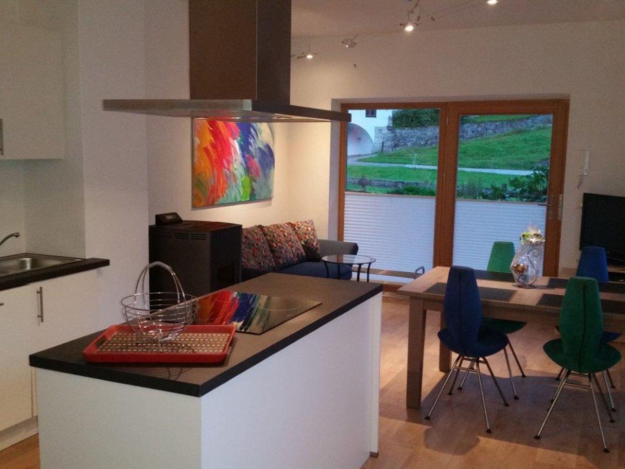 Die Ferienwohnung Atelier ist im Erdgeschoss. Die überhohen Räume des ehemaligen Photoateliers bestimmen den Eindruck. Der Zugang ist direkt von Süden in die Wohnküche. Ausgestattet mit Einbauküche und freistehender Kochinsel sowie Essgruppe, Ausziehsofa und Flachbildschirmfernseher sowie Pelletskaminofen. Zwei große Atelierfenster eröffnen den Blick über den Malerwinkl und den Zugang zur Holzterrasse. Das Bad ist Durchgangszimmer zum Schlafraum im Osten. Es ist mit Doppelwaschtisch und großen Spiegel, bodenbündiger Dusche, Pissoire und WC ausgestattet. Das Schlafzimmer ist mit einem Doppelbett, Sessel mit Tisch und Einbauschrank möbliert.