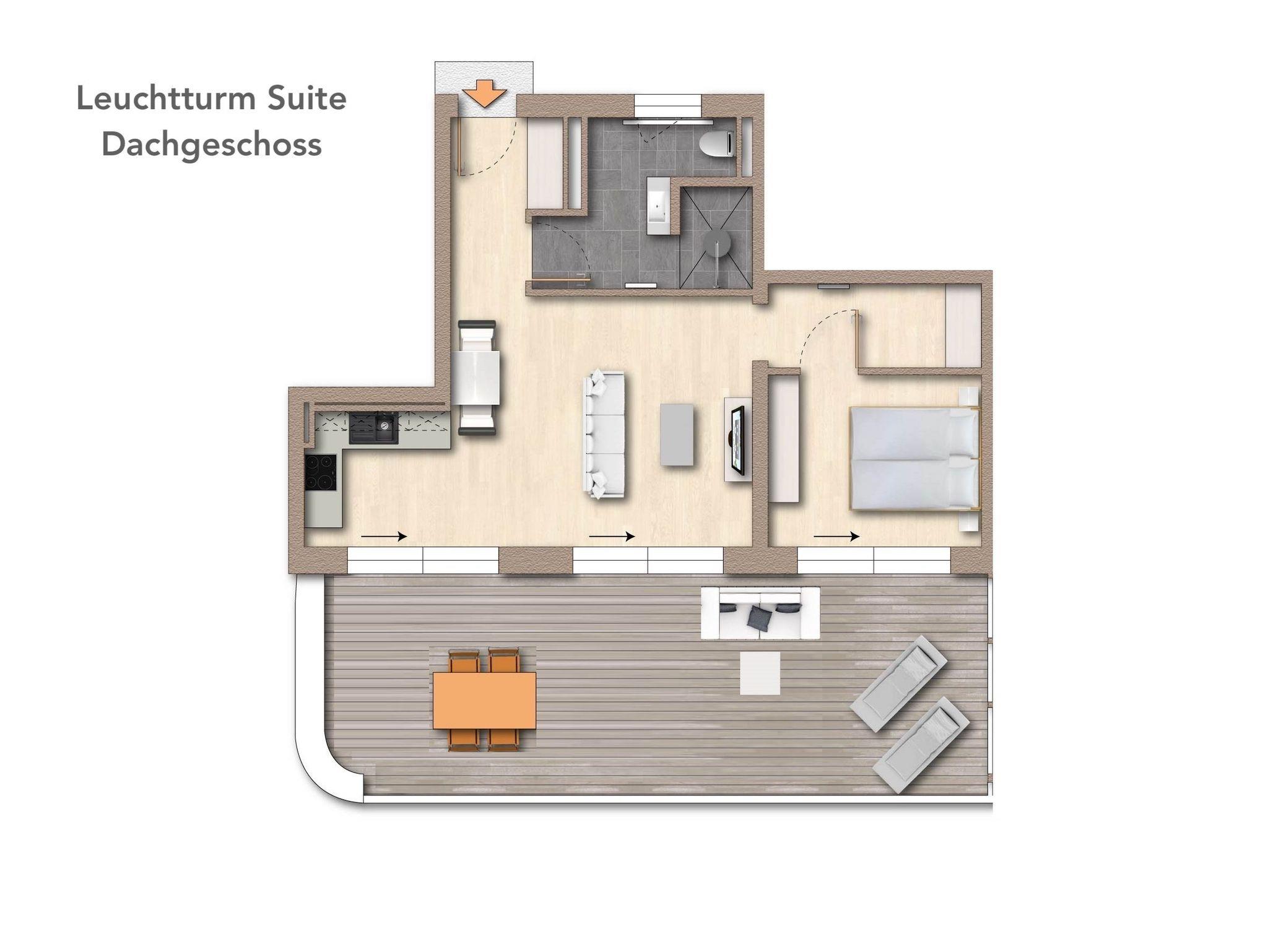 Die Leuchtturm Suite lässt Ihren Blick in Richtung Wasser und dem Sonnenuntergang schweifen, dabei können Sie auf der großen Terrasse Ihre Seele baumeln lassen und dem Hafentreiben zu schauen.