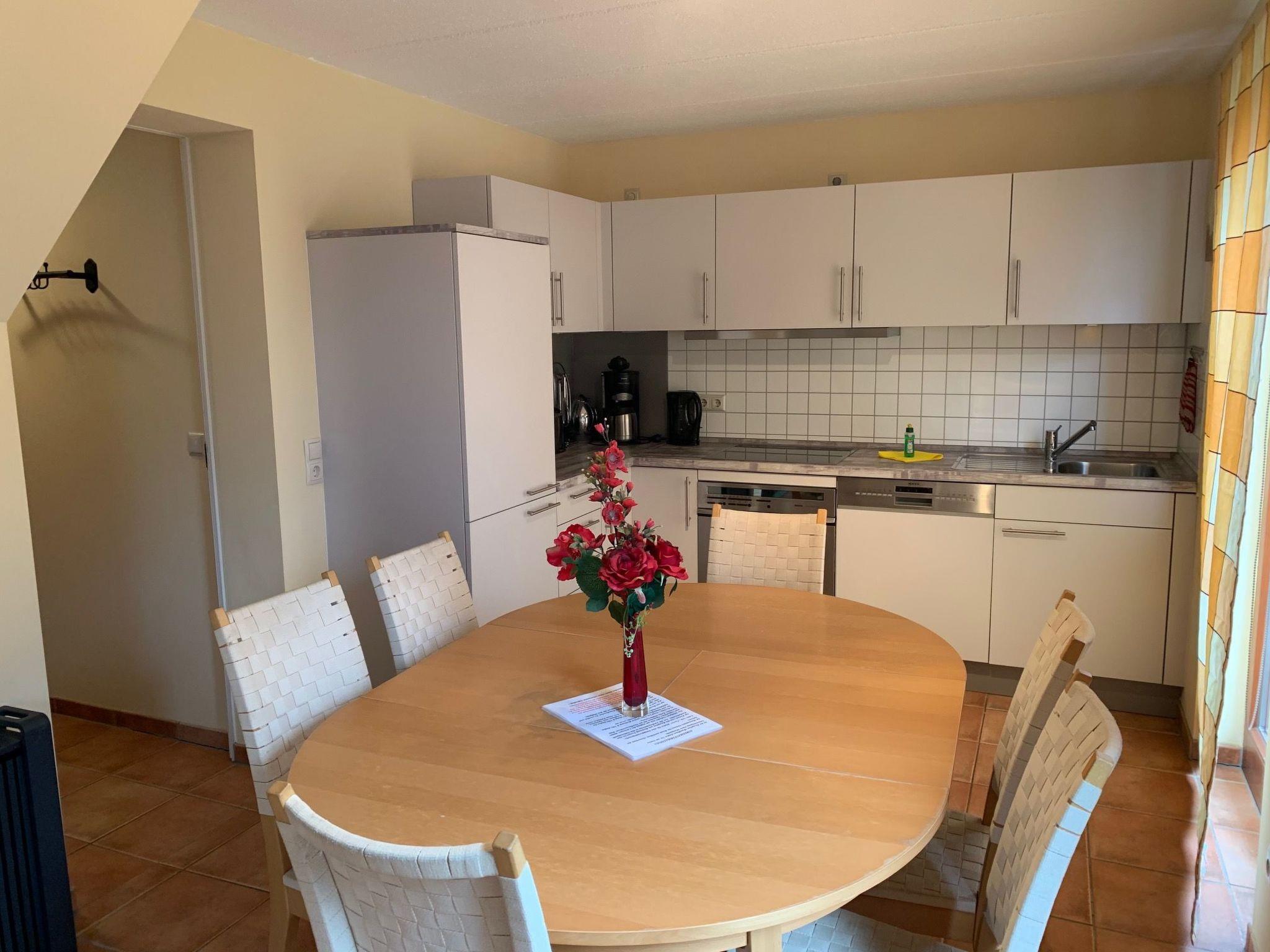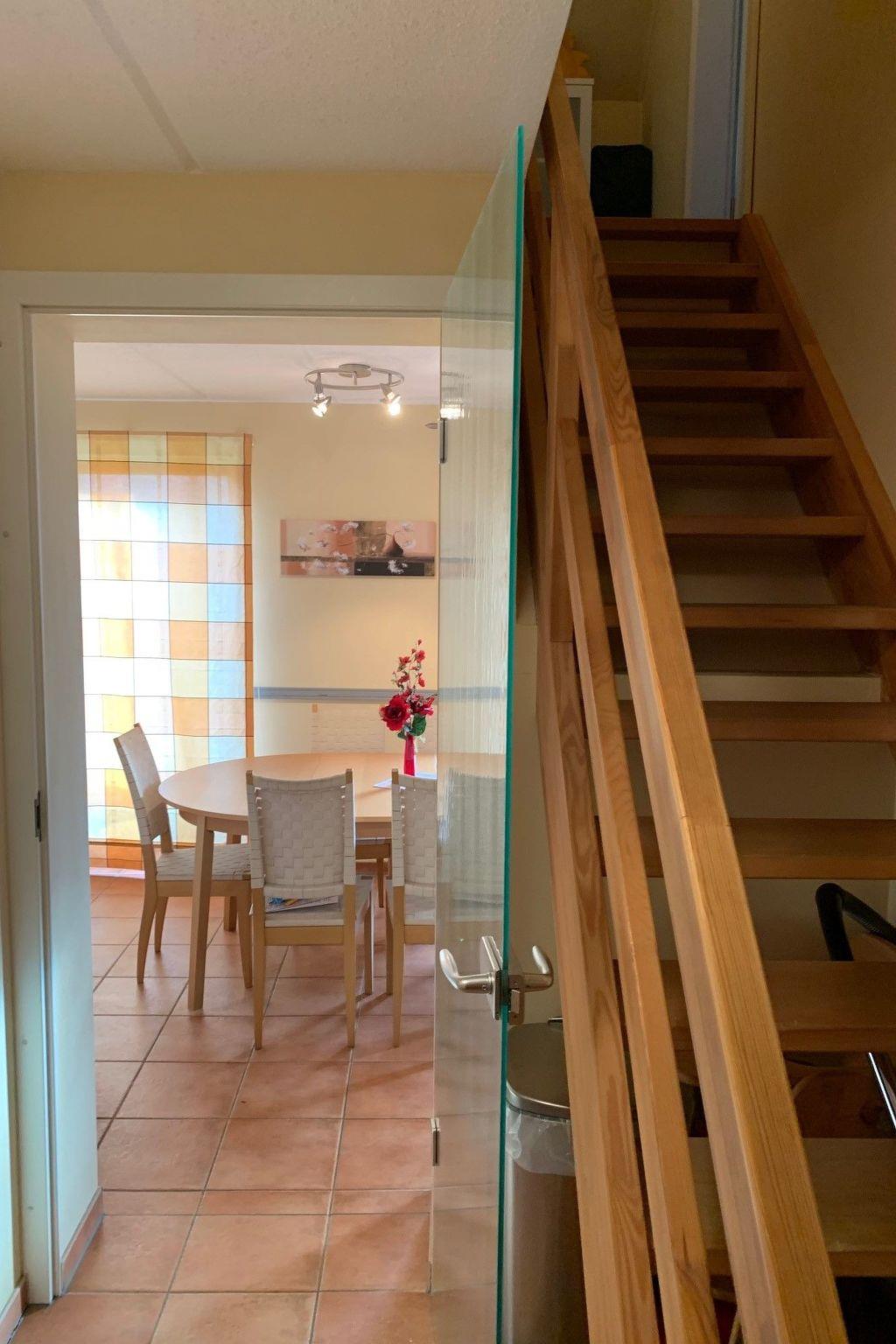 Sie betreten das komfortabel eingerichtete Ferienhaus über den Flur mit Garderobe. Von hier gehen Sie in das untere Bad mit eingelassener Badewanne und WC. Das Wohn- und Esszimmer mit offener Küche befindet sich auch auf dieser Etage. Hier steht Ihnen eine Einbauküche mit Backofen und Cerankochfeld, Geschirrspüler, Kühlschrank mit Gefrierfach, Radio, Kaffeemaschine, Wasserkocher, Mikrowelle, Toaster, Mixer und Eierkocher zur Verfügung. Neben der Küchezeile ist der Esstisch mit 6 Stühlen. Der Wohnbereich ist mit einer Couchgarnitur, einem Landhaus- TV- Schrank mit SAT-Fernseher/DVD und einem Radio/CD, sowie einem modernen Kamin ausgestattet. Im Haus gibt es drei Schlafzimmer. Eins ist unten, die zwei weiteren Schlaf- zimmer sind im Dachgeschoß.Ein Schlafzimmer im OG hat einen SAT-Fernseher/DVD und ein Radio/CD, Ins obere Stockwerk gelangen Sie über die Treppe im Flur. In allen drei Schlafzimmern stehen ein Doppelbett und ein Kleiderschrank. Das zweite Bad im Obergeschoss ist mit einer Dusche, WC und einer Waschmaschine ausgestattet. Kinderbett und Kinderstuhl sind auch vorhanden. Bei Bedarf kann über eine elektrische Heizung bzw. teilweise zusätzlich Fussbodenheizung und natürlich durch den Kaminofen die entsprechende Wärme erzeugt werden. Kaminholz ist vor Ort erhältlich.