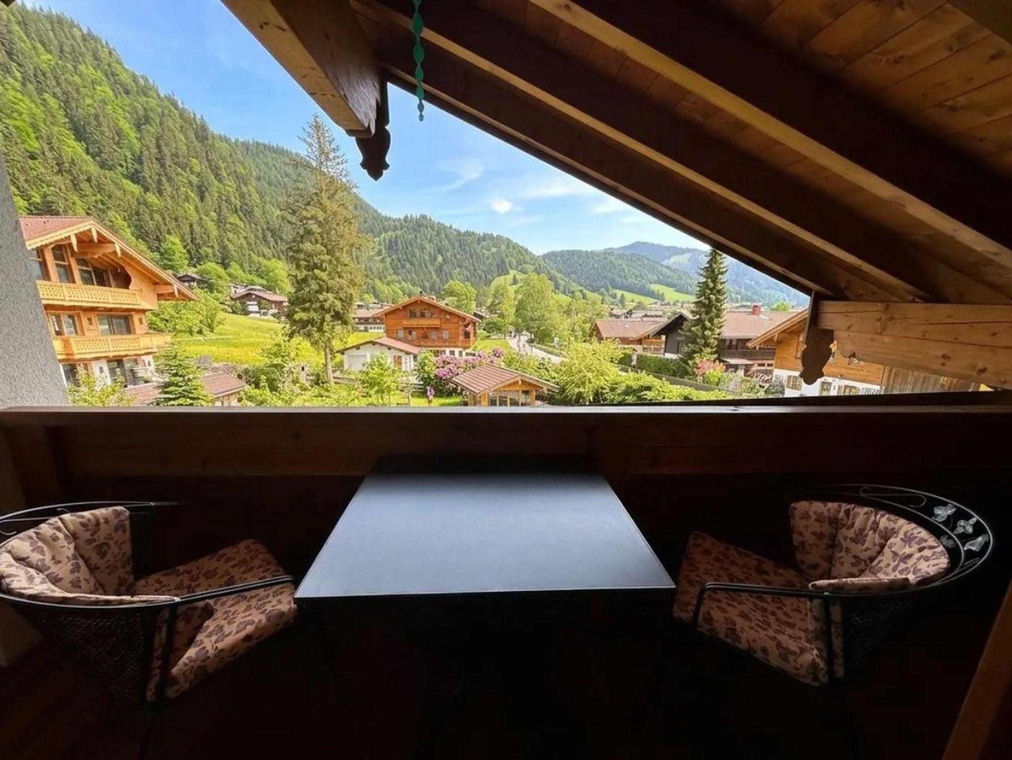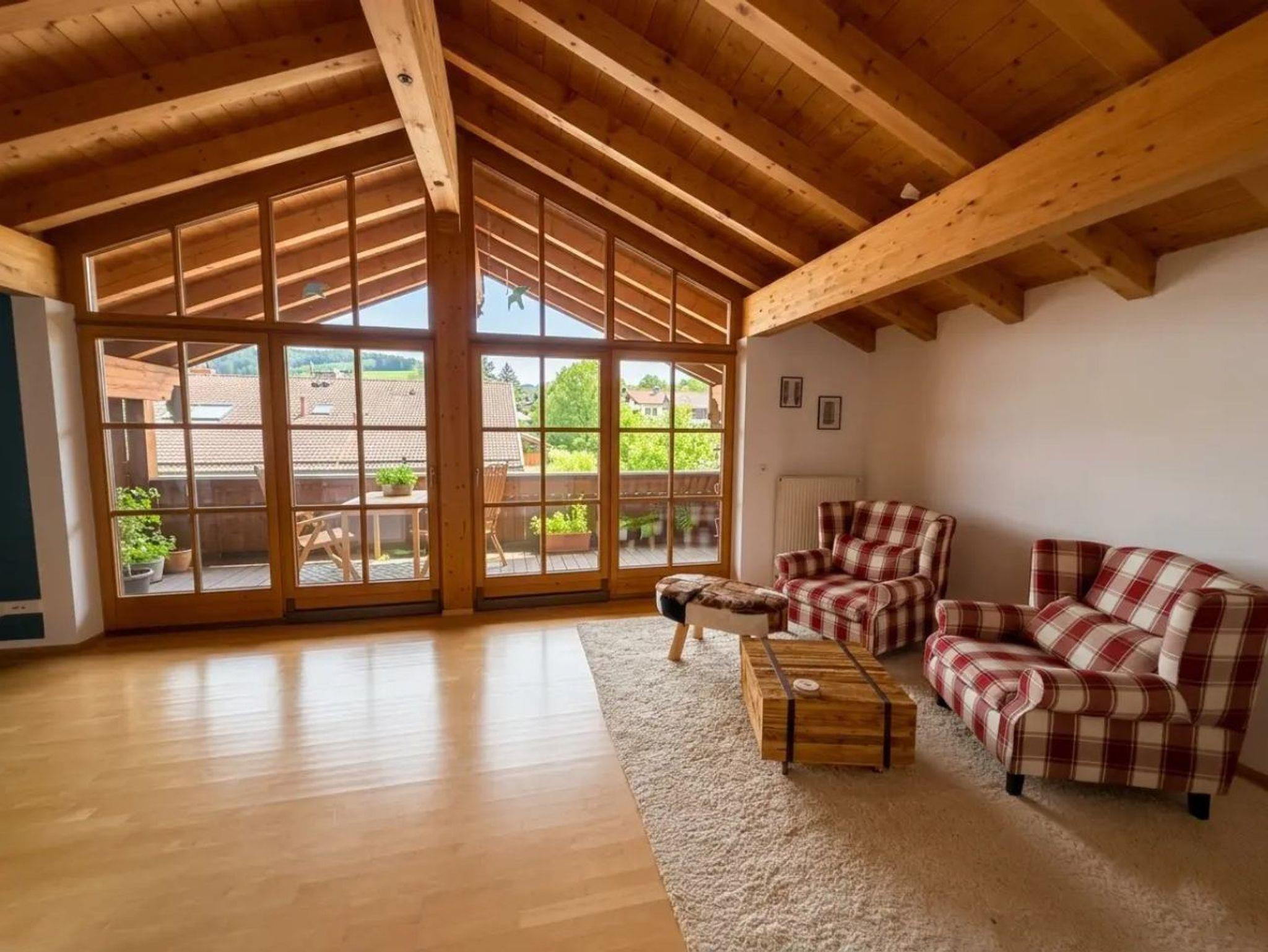 • Wohncharakter: Separates, sonniges Wohnzimmer mit Panorama-Fensterfront und traumhaftem Blick auf die Berge von Reit im Winkl.