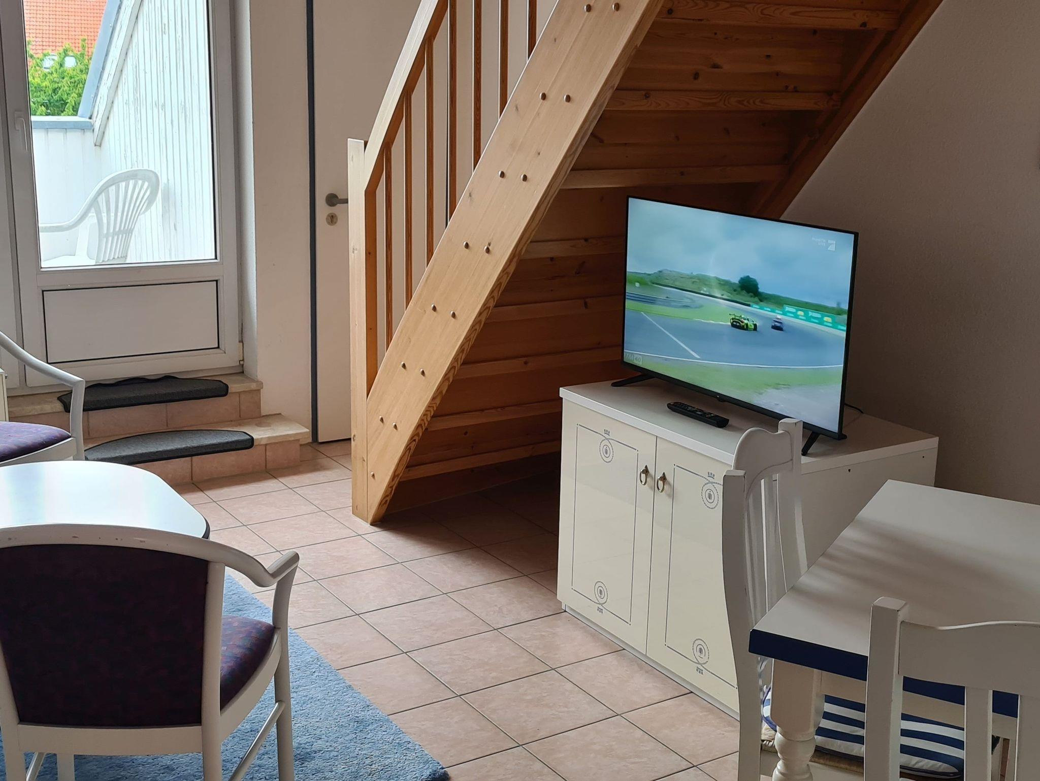 Eine 2-Raum- Ferienwohnung im maritimen Stil mit Balkon und Blick aufs Wasser.