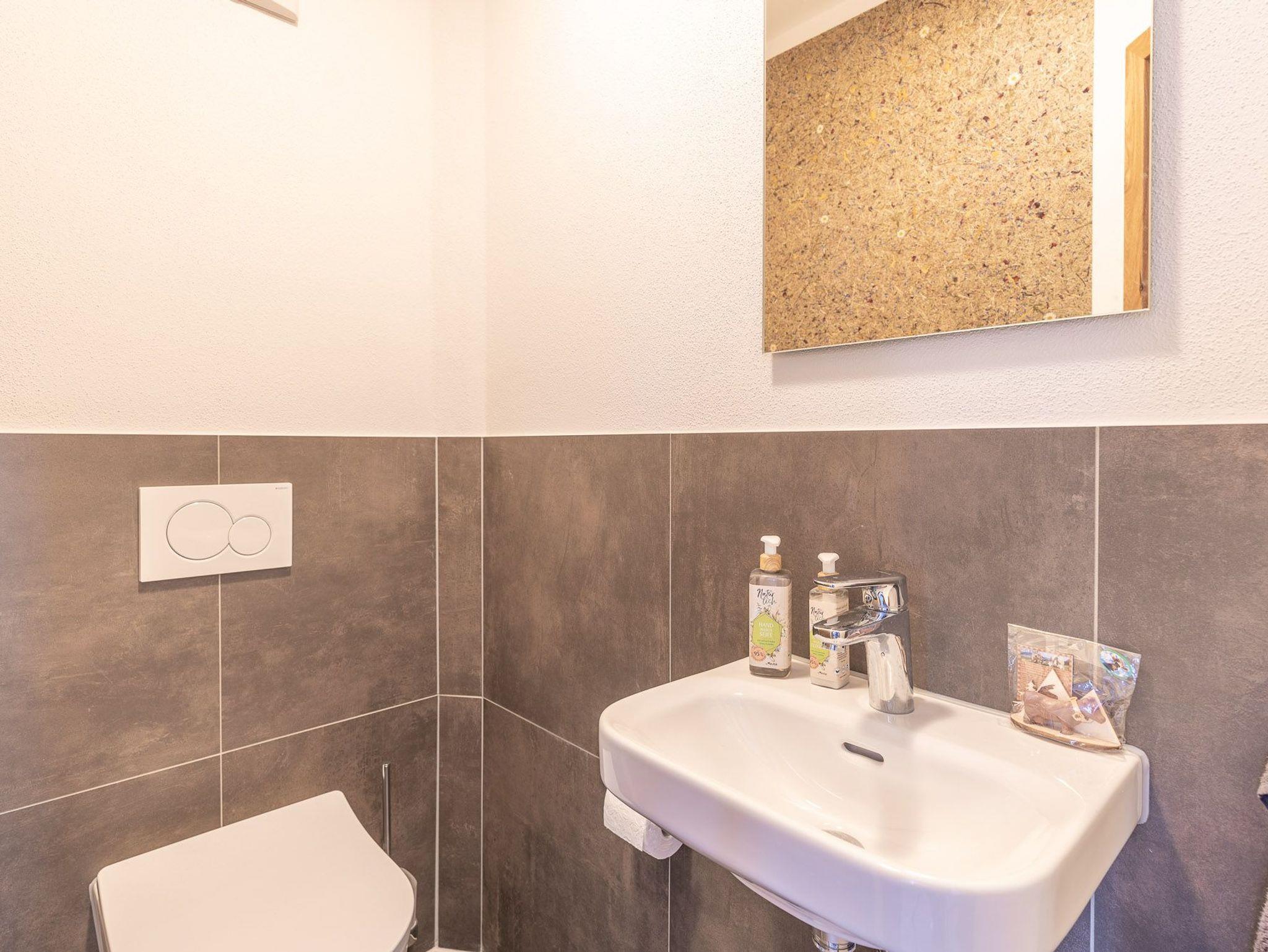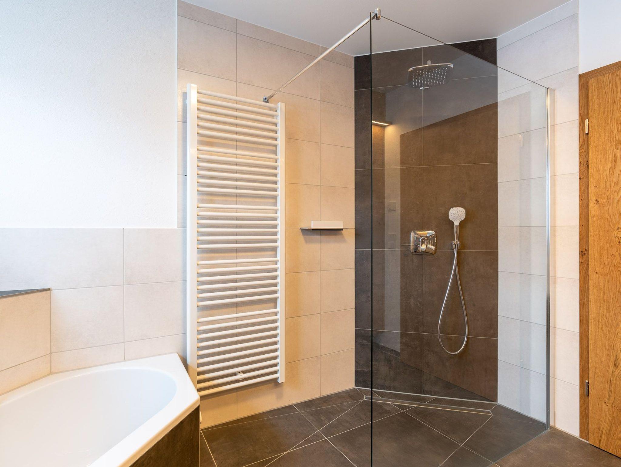 Im Badezimmer erwartet Sie eine große ebenerdige Regendusche, eine Badewanne, Waschtisch und Toilette. Zusätzlich bietet die Wohnung ein extra WC mit hochwertiger Heuwies'n Tapete, die dem Raum eine ganz besondere duftende Note verleiht.