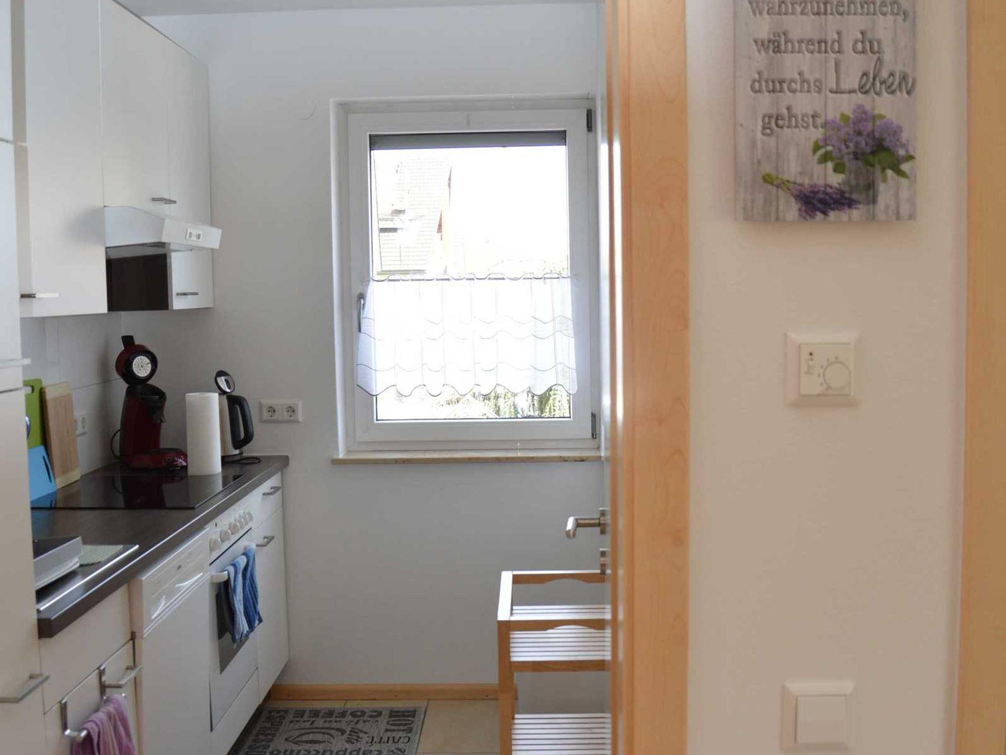 Die separate Küche ist mit Geschirrspüler, Cerankochfeld und Backofen, Kühlschrank mit Gefrierfach, Kaffeepadmaschine, Toaster, Eierkocher, Wasserkocher und dem notwendigen Geschirr ausgestattet.