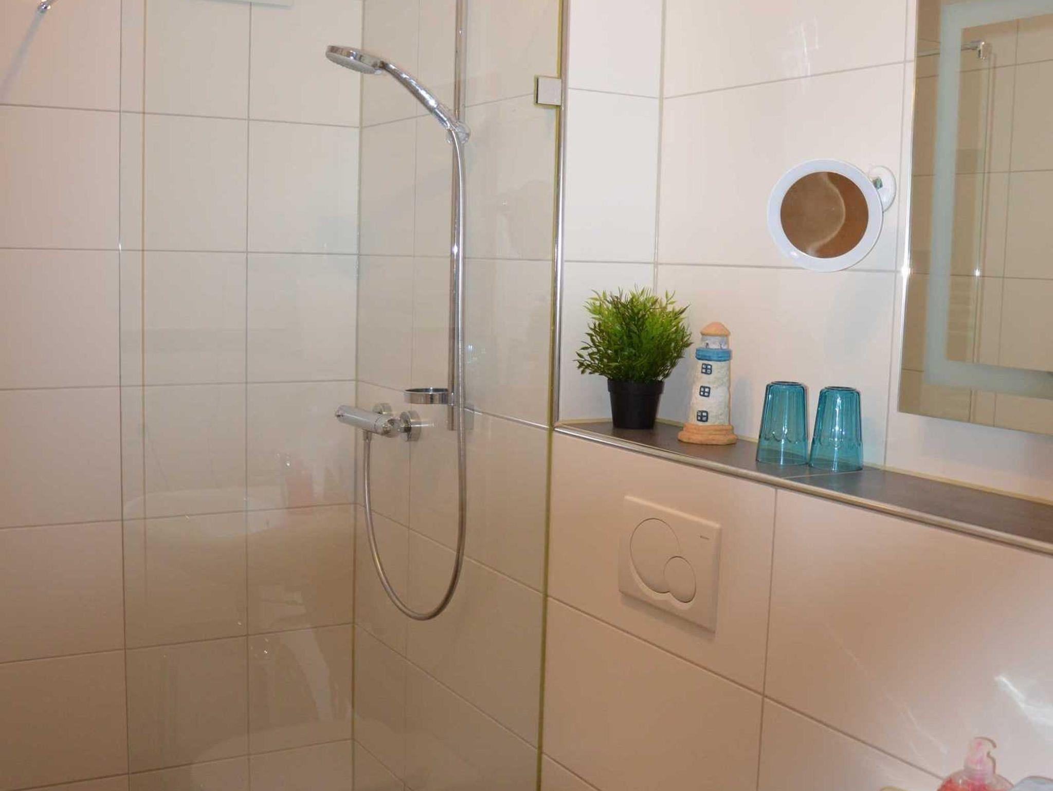 Das Bad mit ebenerdiger Dusche, WC und Fön.