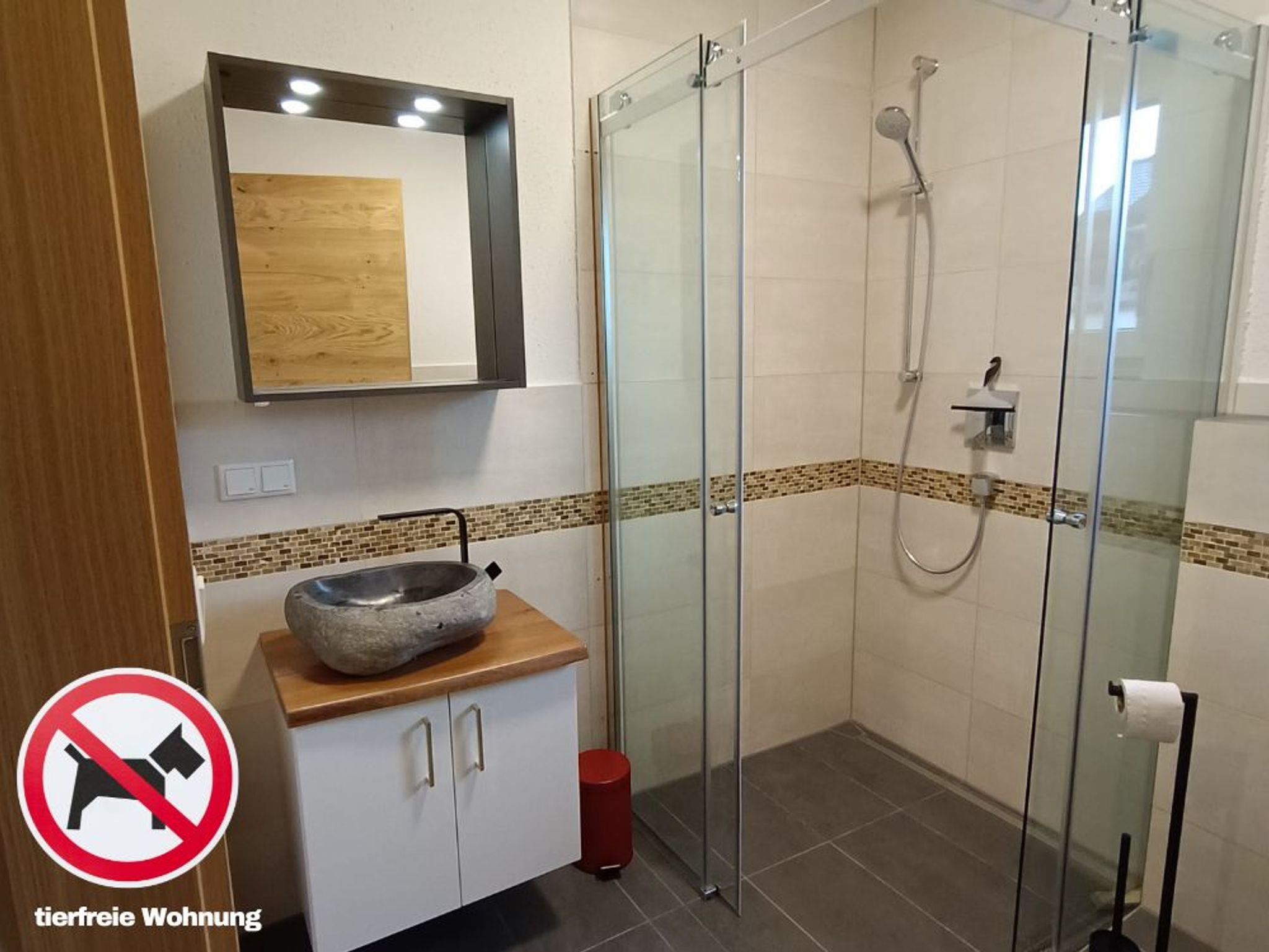 Das Bad verfügt über eine bodenebene Dusche, Waschtisch und Spiegelschrank sowie Handtuchtrockner und WC. Handtücher und Bettwäsche sind im Mietpreis inklusive, gegen einen Aufpreis ist eine Wechselgarnitur zubuchbar.