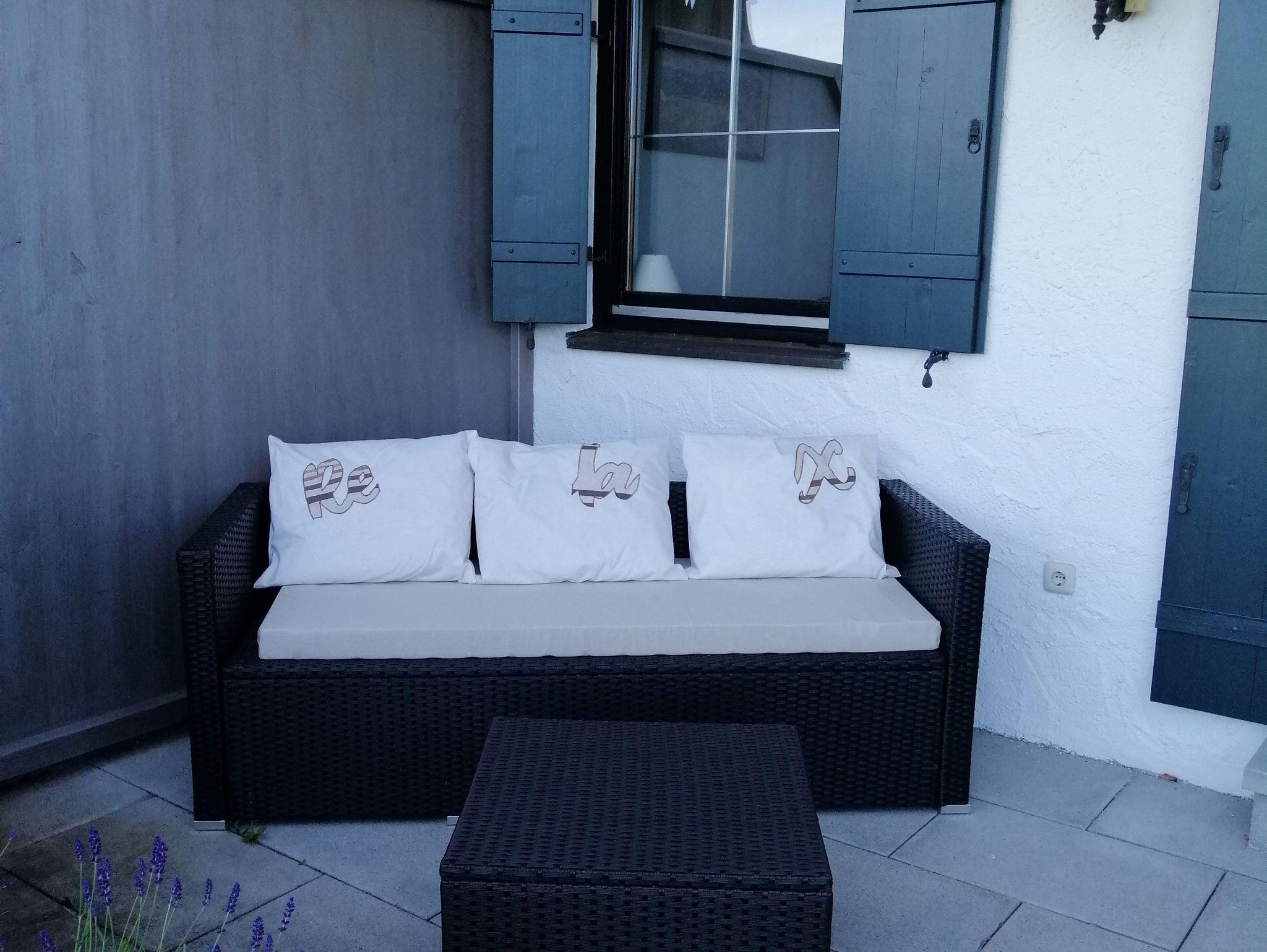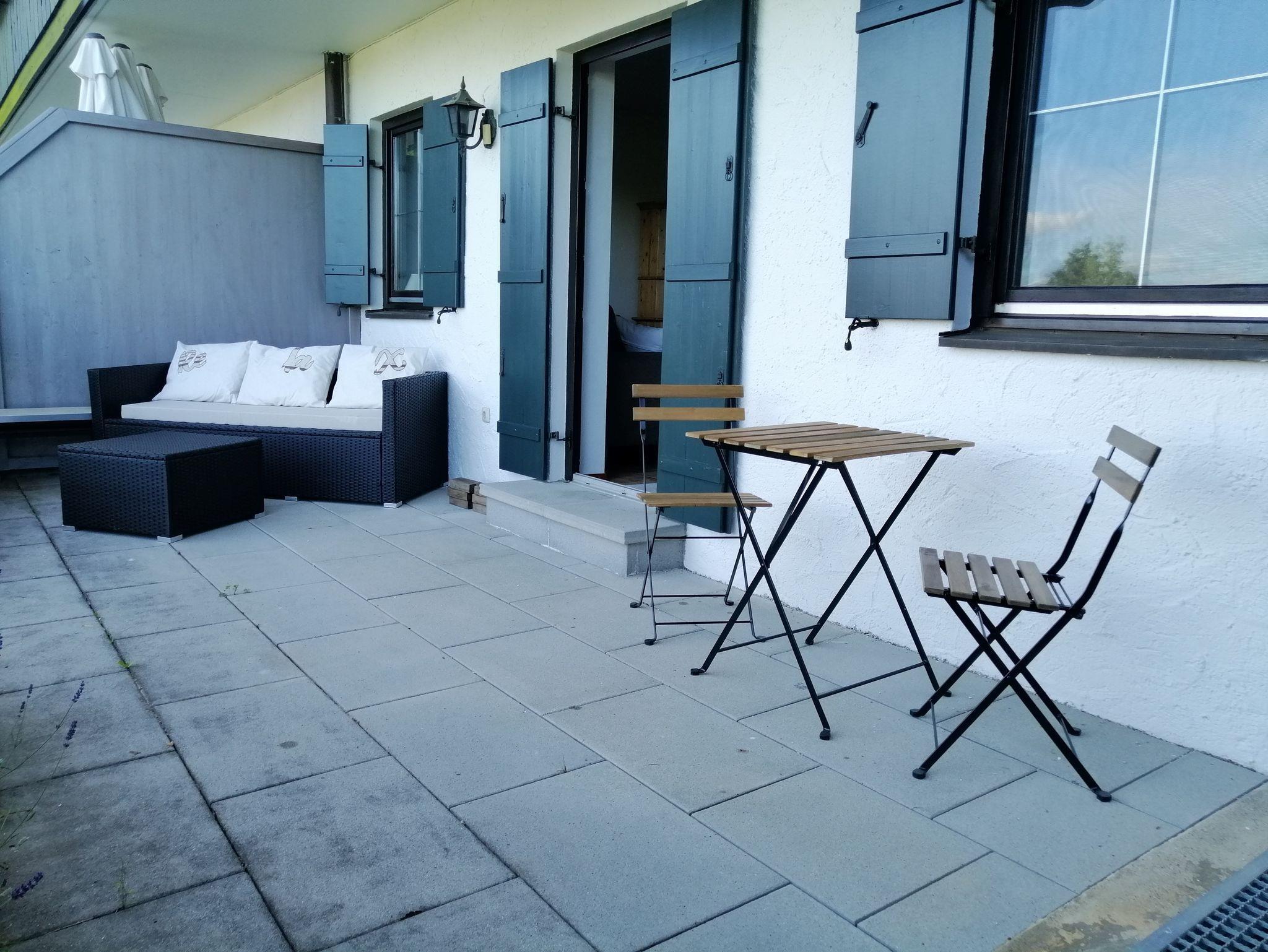 Schöne Terrasse mit Blick auf den Chiemsee und die Kampenwand mit Sitzplatz und separater Gartenlounge, Grillmöglichkeit
