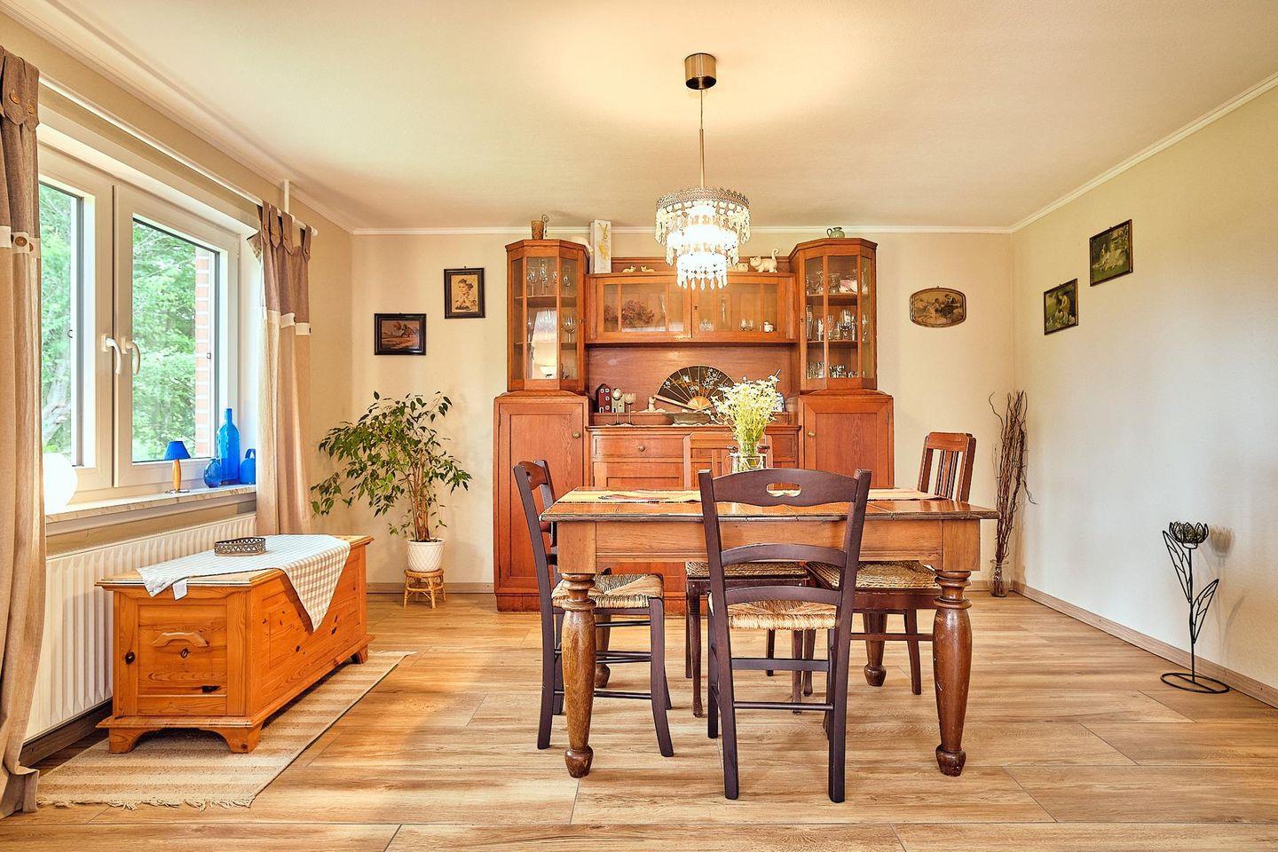 Das Feriendomizil verfügt auf 2 Ebenen über 1 Wohnraum mit einem Kaminofen, 1 Küche, 3 Schlafräume und 2 Bäder. Es steht auf einem ca. 2.000 m² großen Grundstück, wovon ca. 800 m² komplett eingezäunt sind.