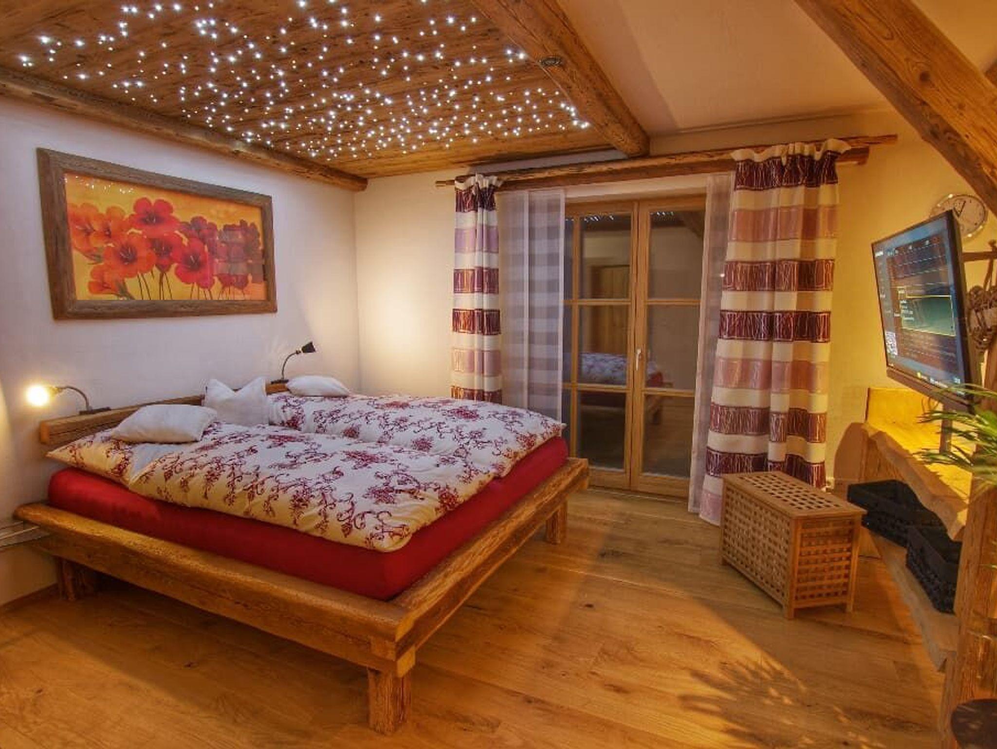 Die Einliegerferienwohnung Holzbock für 2 Personen, verfügt über eine hochwertige Ausstattung verknüpft mit bodenständigem und modernem. Großzügige komplett eingerichtete Wohnküche, 1 Schlafraum, Bad mit Whirlpoolbadewanne, Dusche und einer großzügigen Terrasse. Die Wohnung hat ca. 50 m². Sat-TV in jedem Zimmer, sowie W-Lan im ganzen Haus. Auch in diesem Apartment ist an der Zimmerdecke über dem Bett ein Sternenhimmel angebracht. Gehen Sie auf eine Reise – suchen Sie den „großen Wagen“, die „Cassiopeia“ und schlafen Sie wie unter dem Sternenzelt.